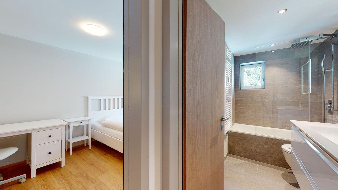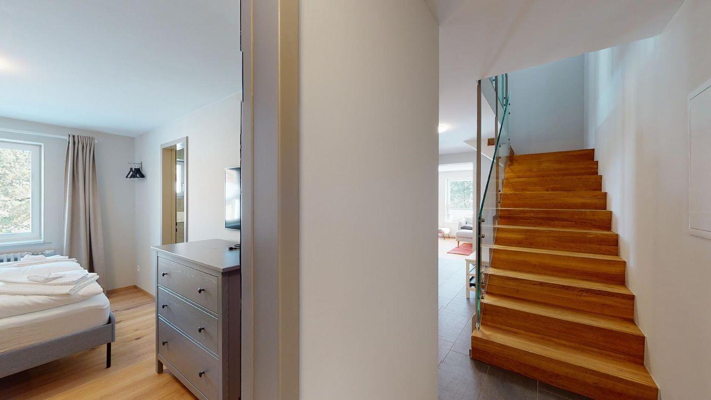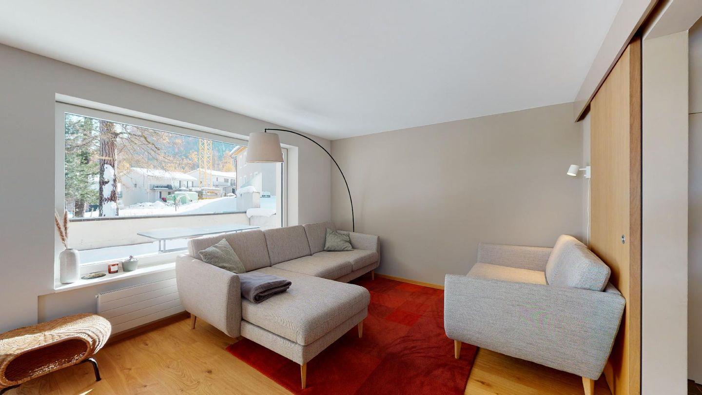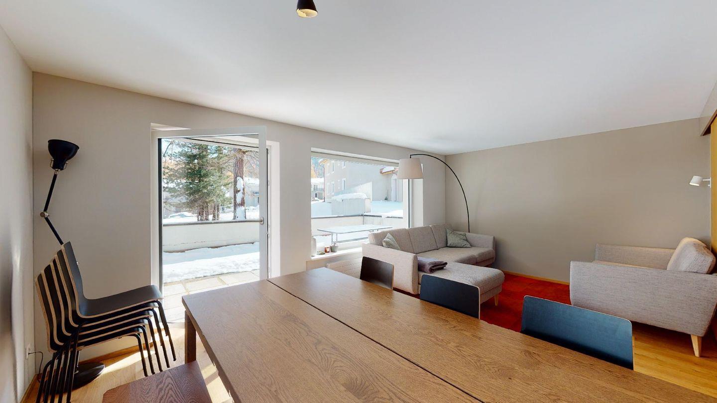 Im 2020 renovierte 5½-Zimmer Wohnung (106m2) im 1. Stock, auf zwei Etagen verteilt. 1. Stock: Halboffene Küche mit Kühlschrank, Herd, Ofen, Geschirrspüler, Chicco d'Oro Kaffeemaschine und grosser Durchreiche zum Esstisch. Wohn-/ Esszimmer mit grossem Esstisch, Sofa und Balkon. Ein Schlafzimmer/TV-Zimmer mit Doppelbett, Sofa, Smart-TV (bitte eigene Netflix und Amazon Logindaten mitbringen) und eigenem Badezimmer. Ein Gäste-WC.