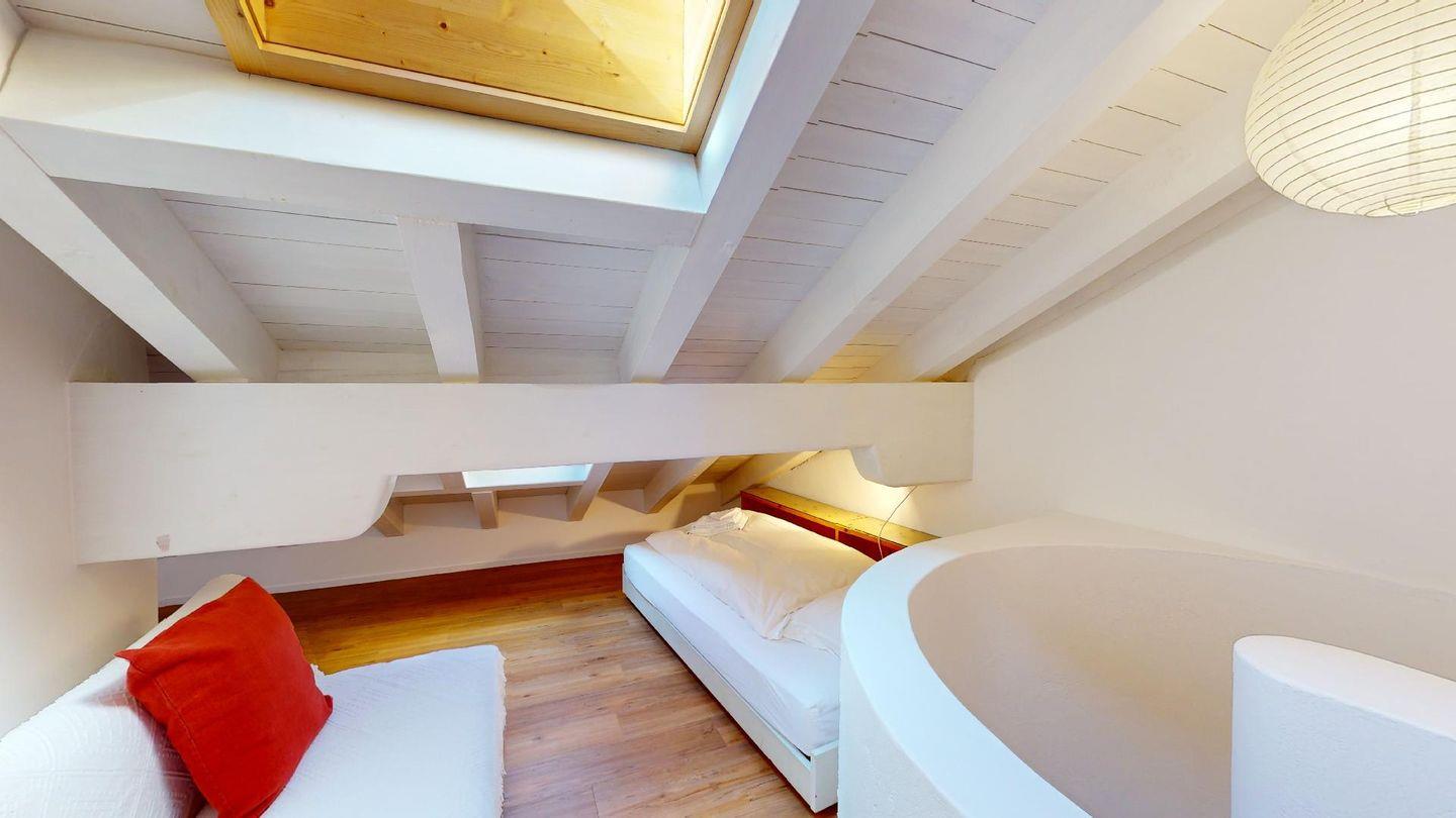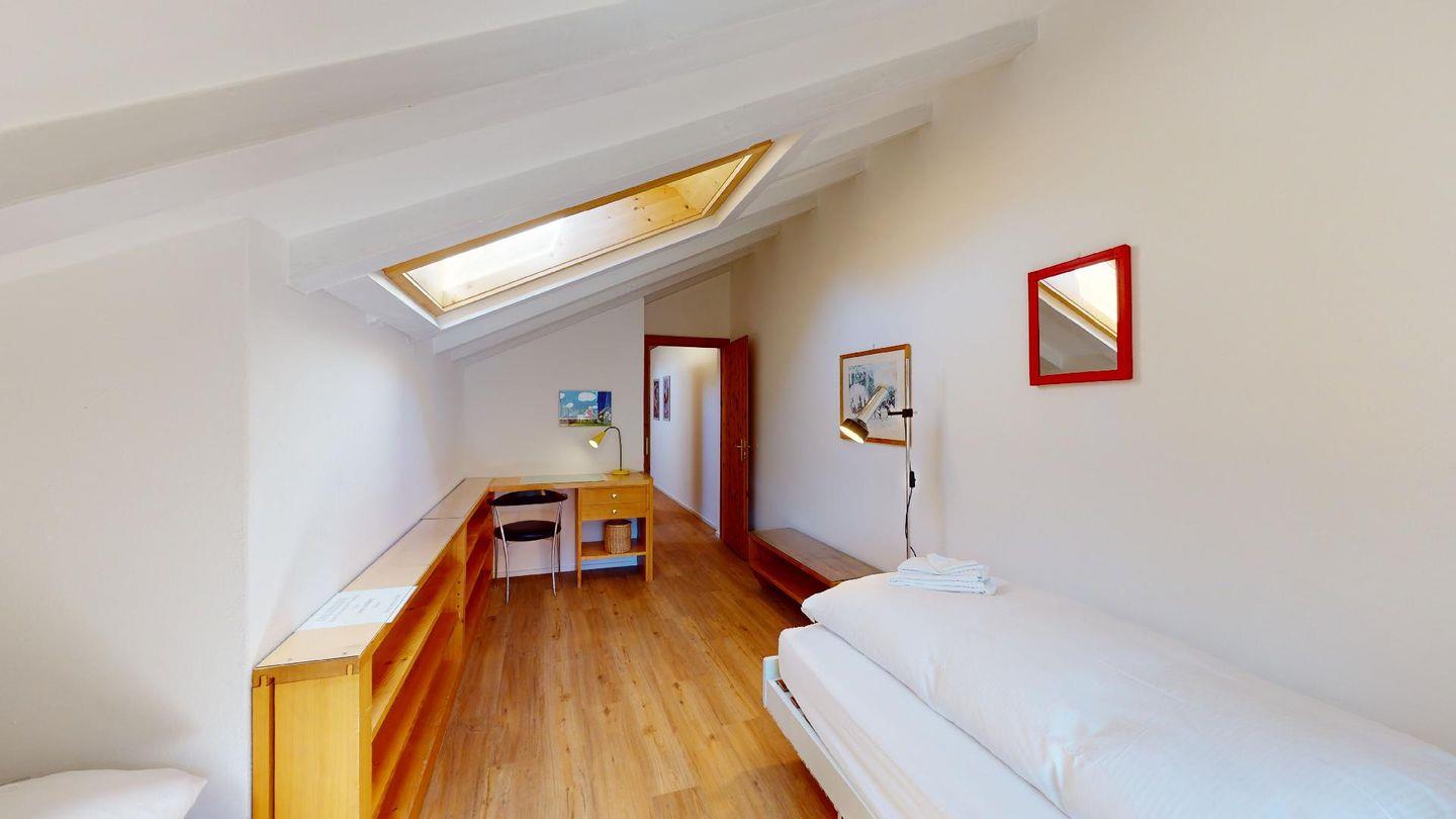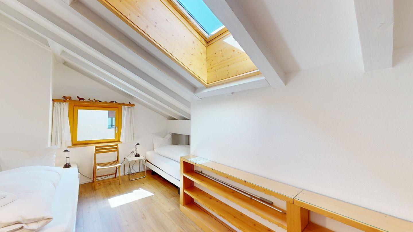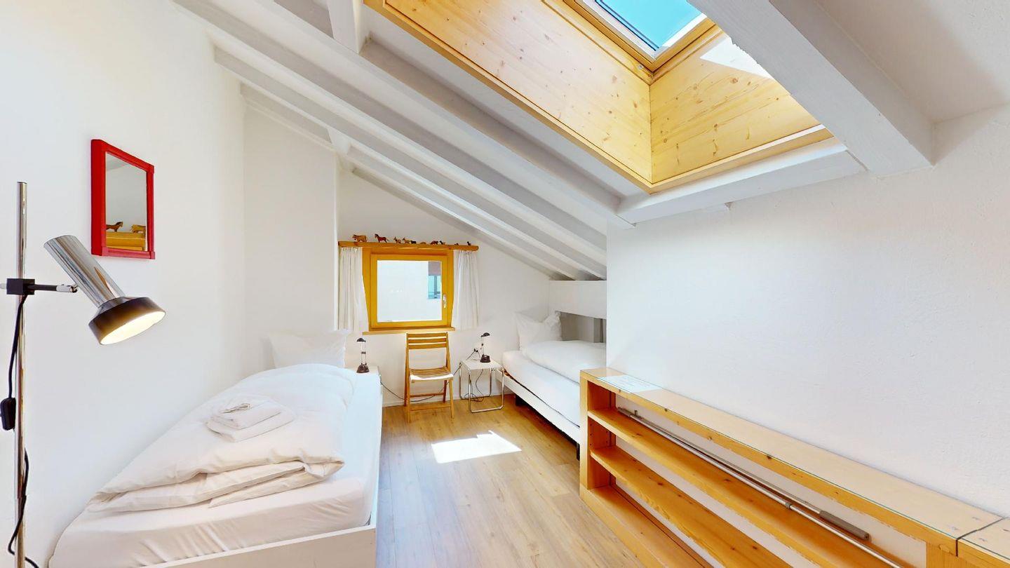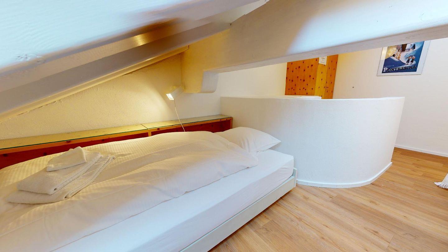 Gemütliche Ferienwohnung im Dachgeschoss über 2 Etagen. Etage 1: Helles Wohnzimmer mit Terrasse und wunderschöner Aussicht auf Pontresina und die Bergwelt des Oberengadins. Badezimmer mit Bad/WC. Gut eingerichtete Küche mit gemütlicher Essecke. Dachgeschoss: 1 Schlafzimmer mit zwei Einzelbetten sowie ein Schlafplatz für Kinder inkl. kleinem Office. 1 Dusche/WC. Gratis WLAN. Garagenplatz.