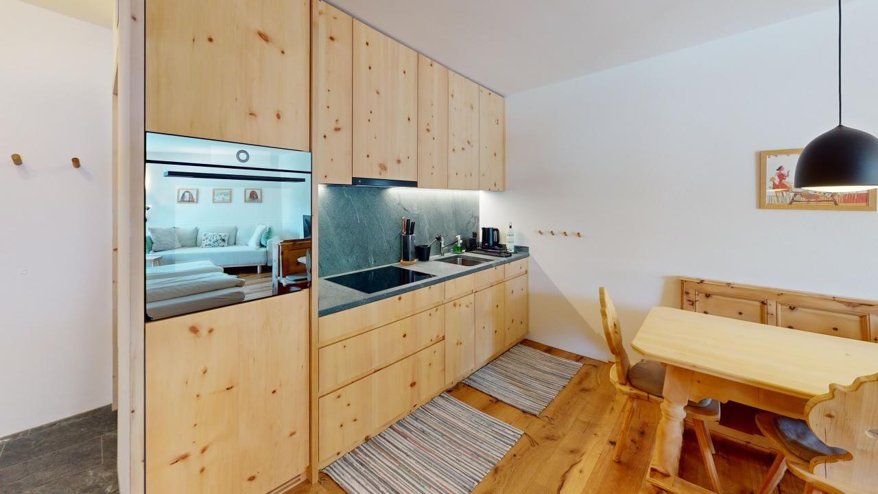 Die Studiowohnung wurde kürzlich einer hochwertigen Renovierung unterzogen und strahlt nun in neuem Glanz. Die Möbel sind aus Arvenholz gefertigt und verleihen dem Raum nicht nur einen Hauch von Luxus, sondern verströmen auch einen herrlichen Duft.