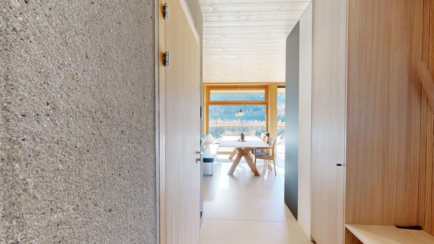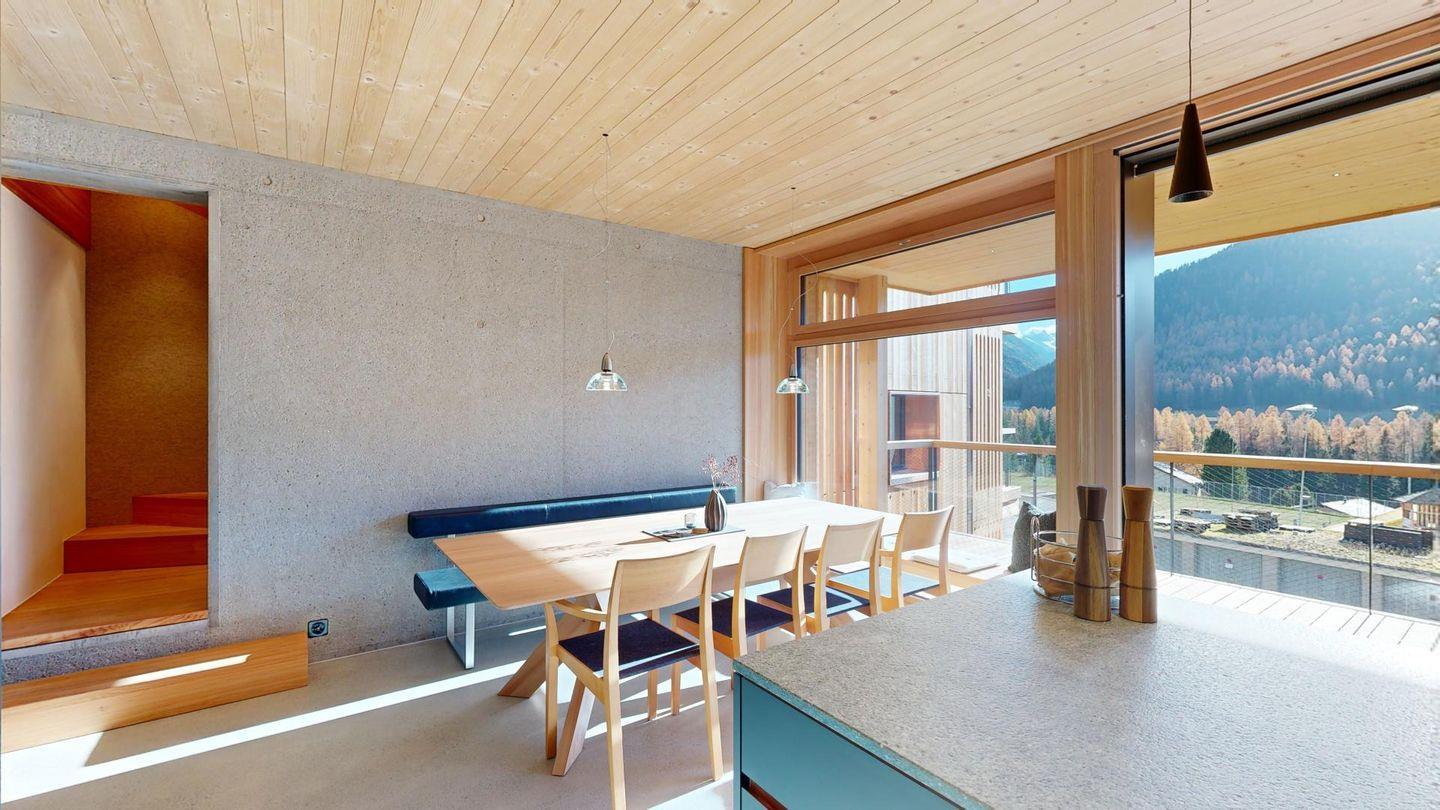 Im unteren Bereich erwartet Sie eine offene Küche, die mit einem grossen Esstisch ausgestattet ist – der perfekte Ort für gesellige Abende. Hier finden Sie auch ein stilvolles Doppelzimmer, ein modernes Badezimmer mit grosszügiger Dusche, ein gemütliches Fernsehzimmer mit Schlafsofa und ein praktisches Reduit. Geniessen Sie von der voll ausgestatteten Küche und dem Esstisch aus den herrlichen Blick in Richtung Piz Julier und entspannen Sie auf dem grossen, überdachten Balkon.