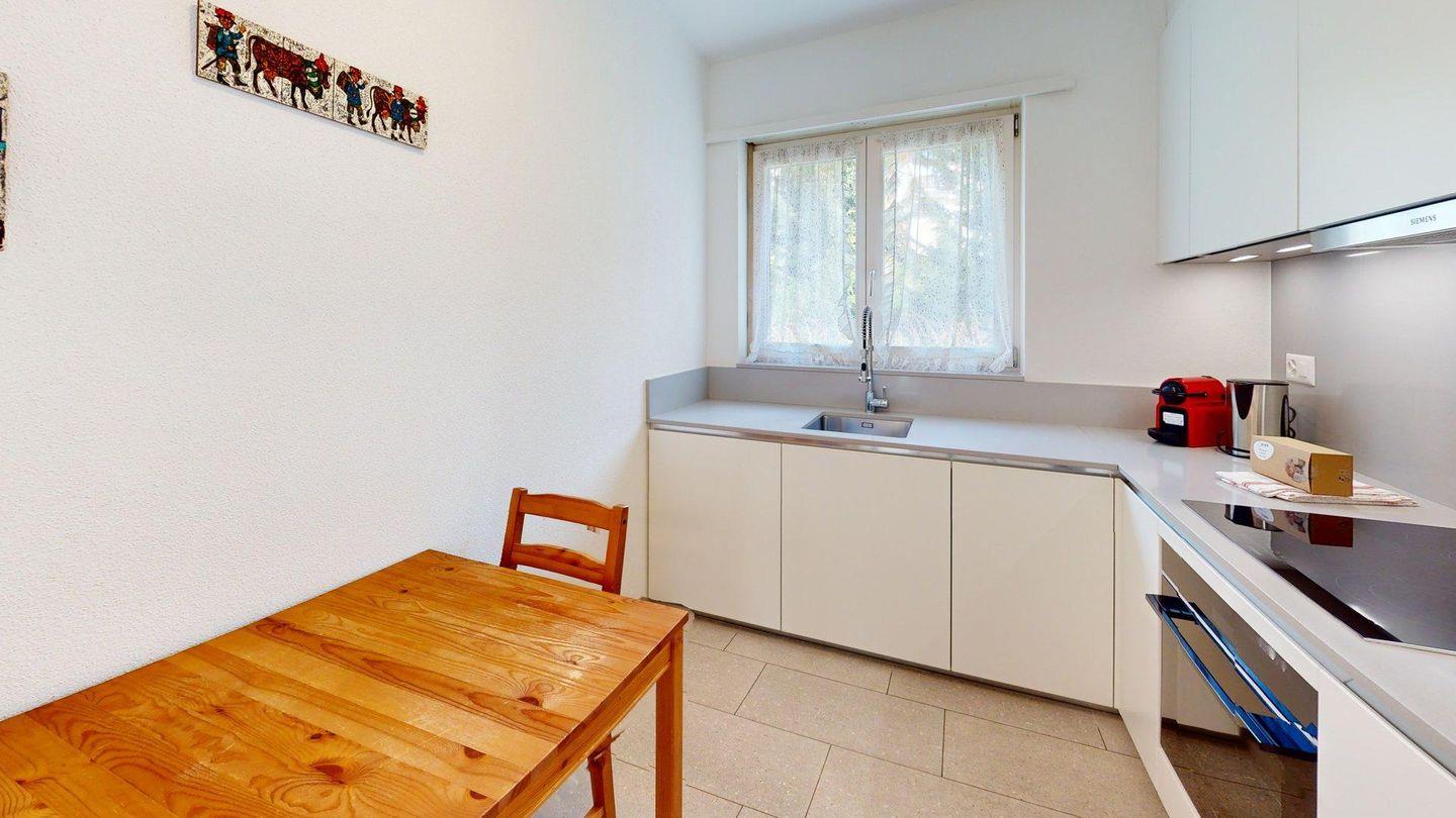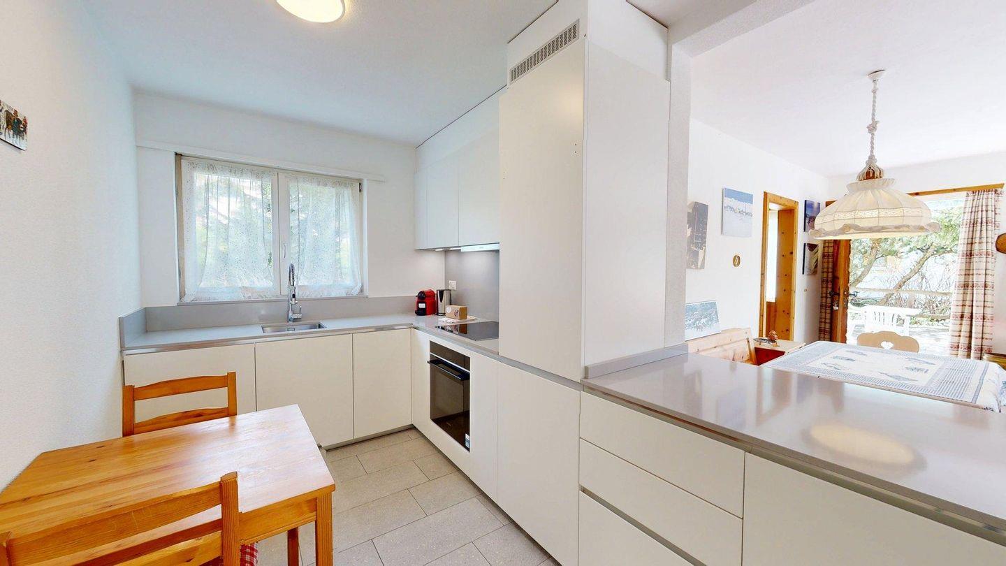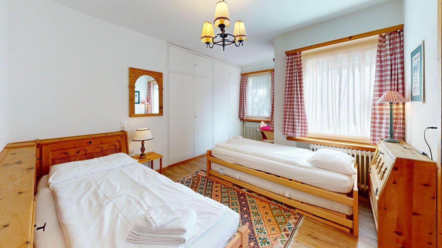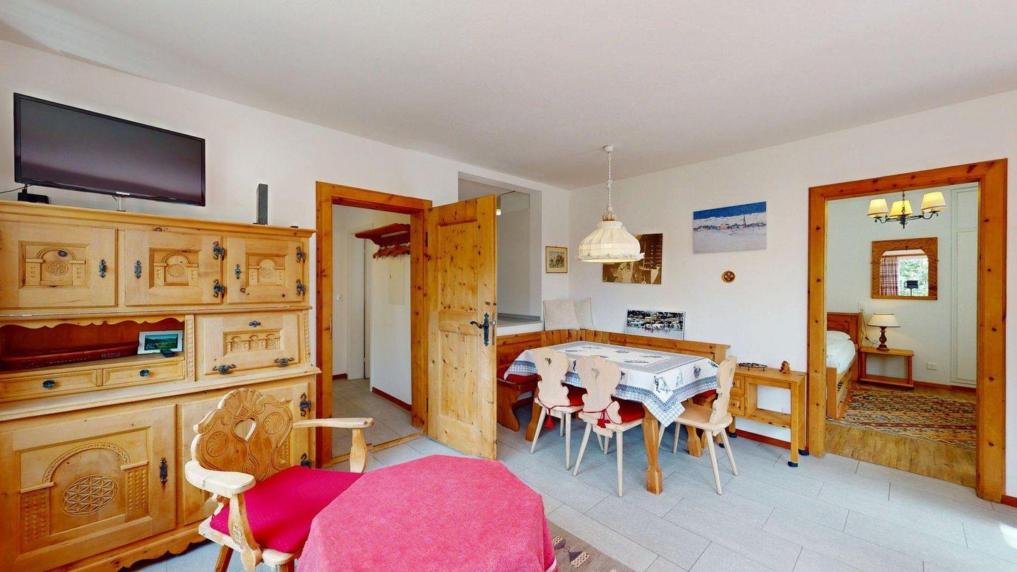 Diese helle 3.5 Zimmer-Wohnung im 1. Obergeschoss begeistert mit einer neu renovierten Küche, modernen Bädern und einer charmanten Wohnatmosphäre. Der Ausblick auf die umliegende Bergwelt verleiht dem Zuhause eine besondere Ruhe und Weite. Der grosszügige Wohn- und Essbereich ist einladend gestaltet und bietet viel Tageslicht sowie eine angenehme Wohlfühlatmosphäre. Die moderne Küche ist hochwertig ausgestattet und lässt keine Wünsche offen – ideal für gemütliche Kochabende mit Familie oder Freunden. Die Ferienwohnung verfügt über zwei komfortable Schlafzimmer; ein Zimmer mit Doppelbett und ein Zimmer mit zwei Einzelbetten und einem praktischen Schreibtisch (ein drittes Einzelbett kann auf Wunsch ergänzt werden) Beide Räume bieten Rückzugsorte für erholsame Nächte. Zwei stilvolle Badezimmer sorgen für zusätzlichen Komfort; ein Bad mit Badewanne, Dusche, WC und Bidet