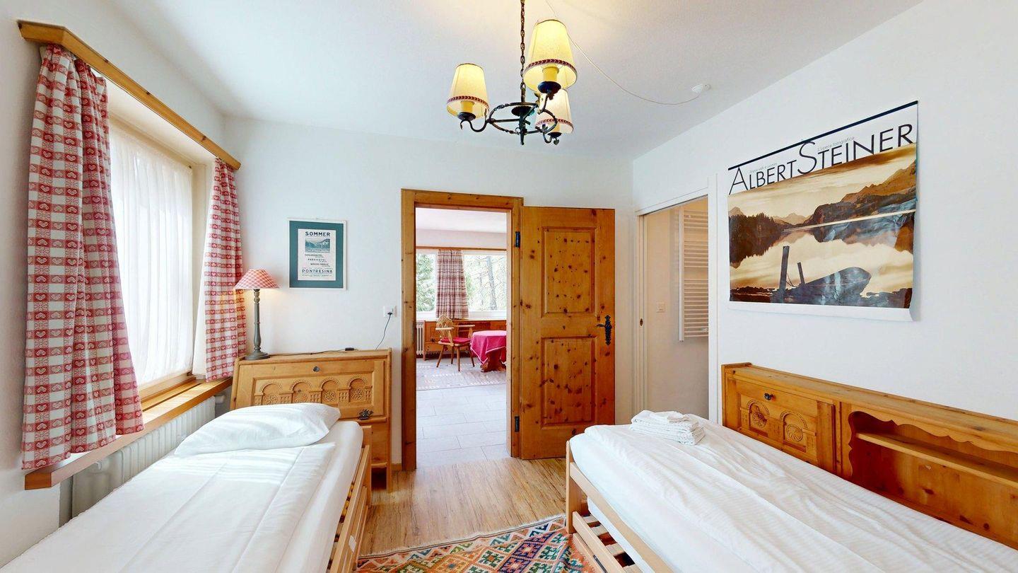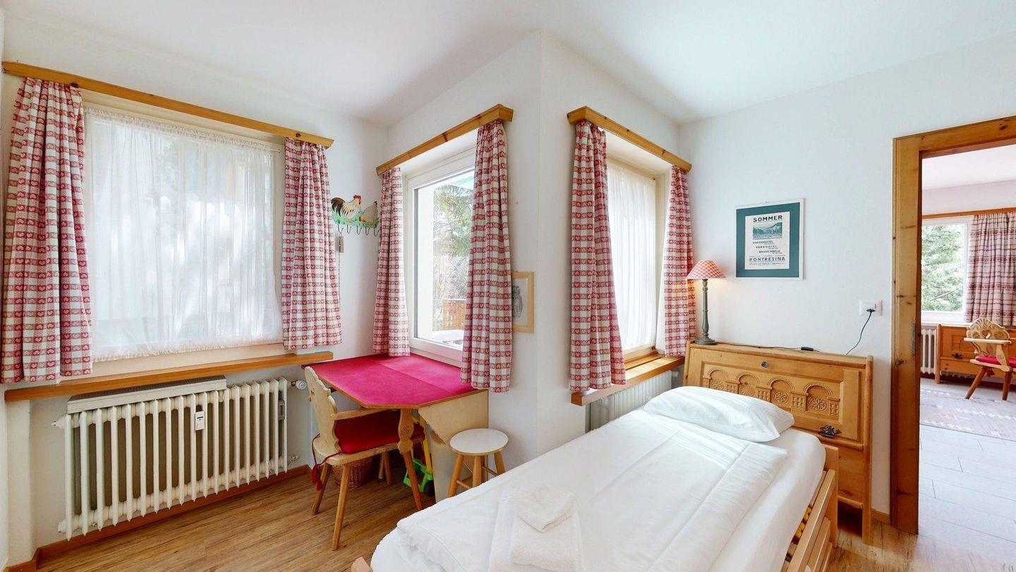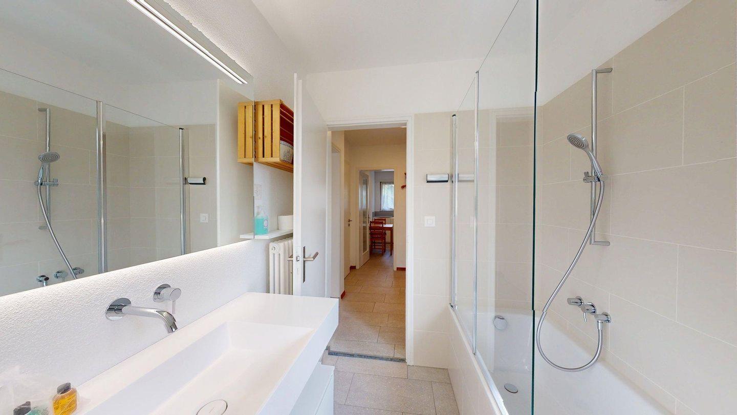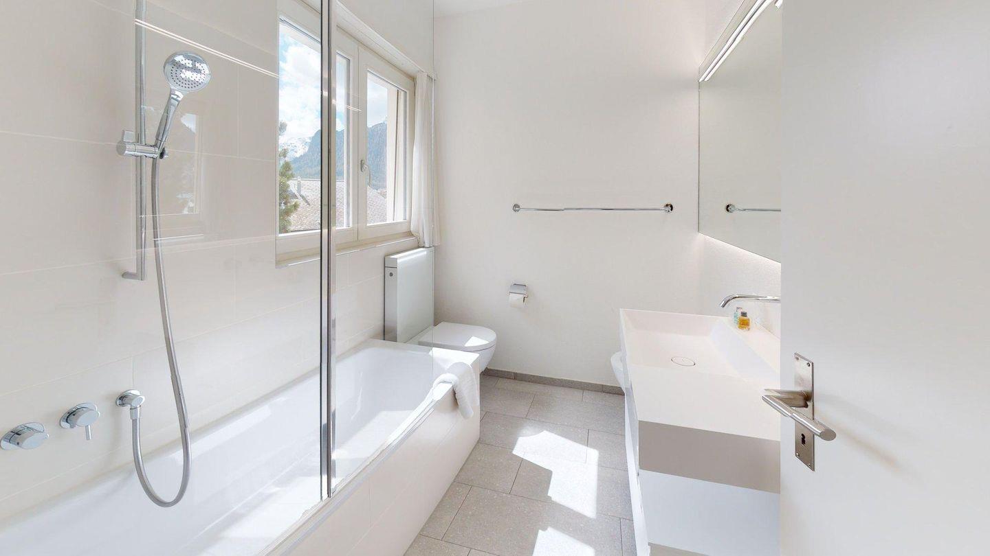 Diese helle 3.5 Zimmer-Wohnung im 1. Obergeschoss begeistert mit einer neu renovierten Küche, modernen Bädern und einer charmanten Wohnatmosphäre. Der Ausblick auf die umliegende Bergwelt verleiht dem Zuhause eine besondere Ruhe und Weite. Der grosszügige Wohn- und Essbereich ist einladend gestaltet und bietet viel Tageslicht sowie eine angenehme Wohlfühlatmosphäre. Die moderne Küche ist hochwertig ausgestattet und lässt keine Wünsche offen – ideal für gemütliche Kochabende mit Familie oder Freunden. Die Ferienwohnung verfügt über zwei komfortable Schlafzimmer; ein Zimmer mit Doppelbett und ein Zimmer mit zwei Einzelbetten und einem praktischen Schreibtisch (ein drittes Einzelbett kann auf Wunsch ergänzt werden) Beide Räume bieten Rückzugsorte für erholsame Nächte. Zwei stilvolle Badezimmer sorgen für zusätzlichen Komfort; ein Bad mit Badewanne, Dusche, WC und Bidet