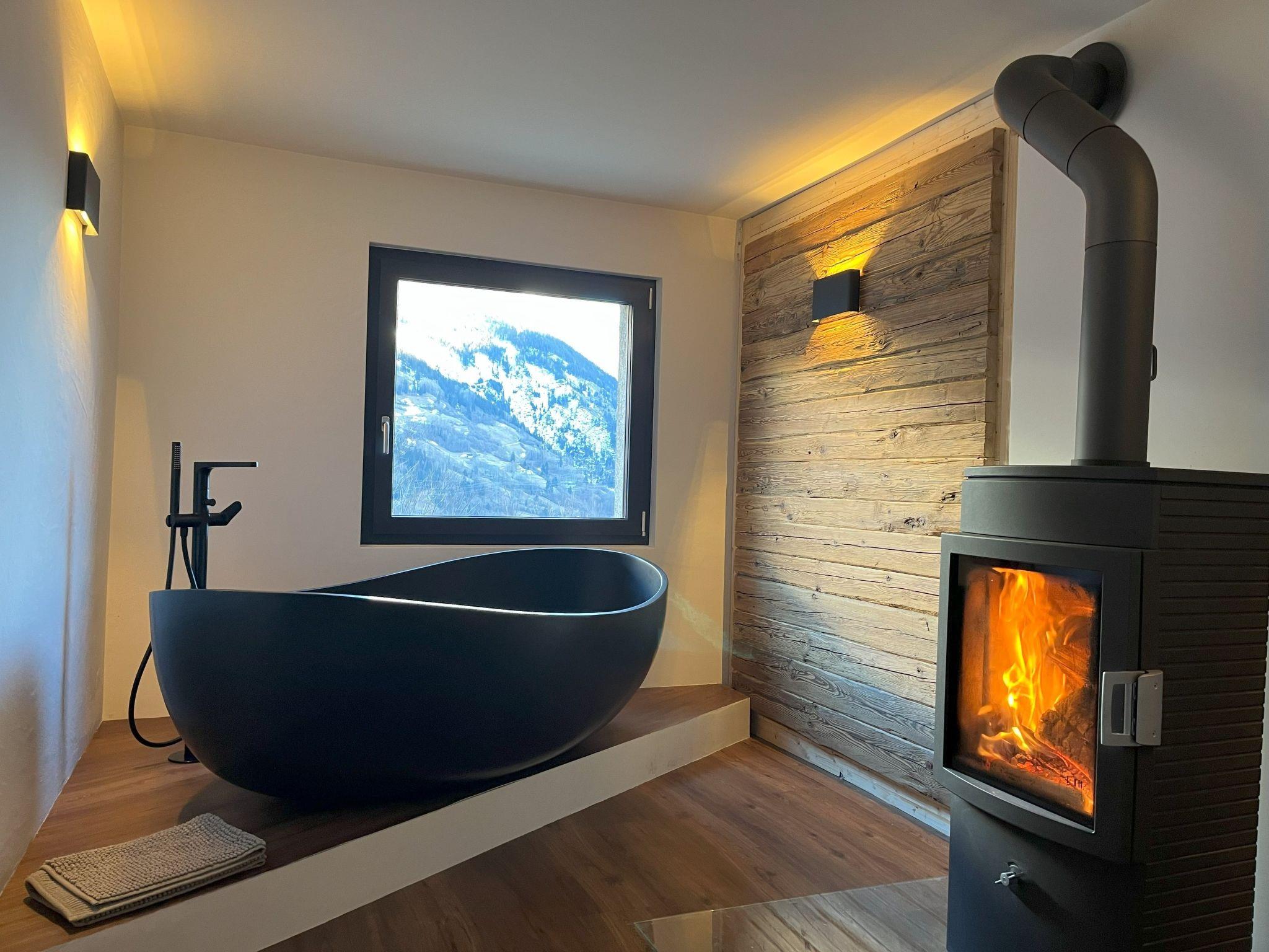• Gemütliche Atmosphäre: Kuschel dich in die gemütlichen Sessel vor dem knisternden Kaminfeuer, oder entspanne in der freistehenden Badewanne mit Blick auf die Berge, Tal und See.
