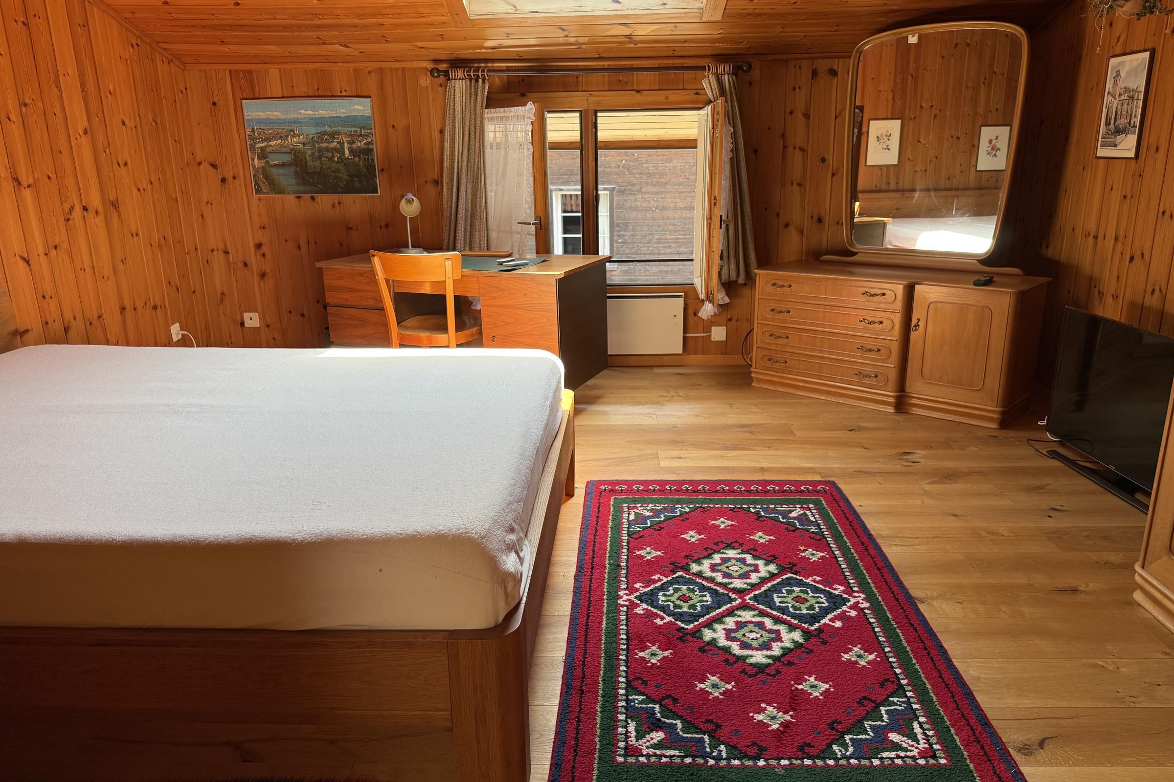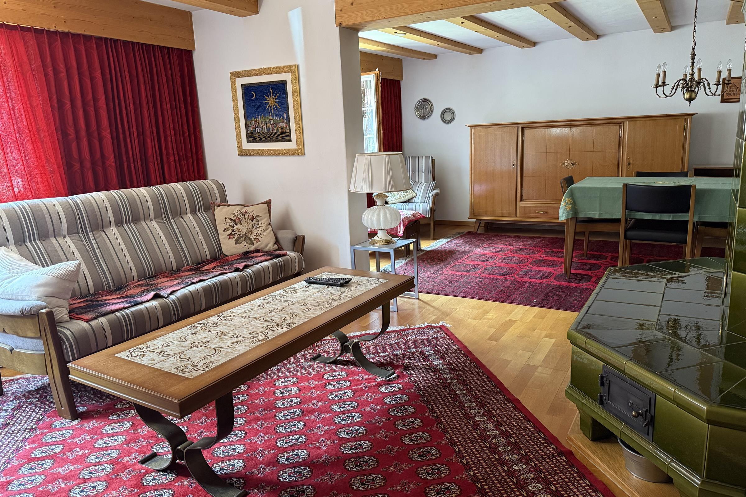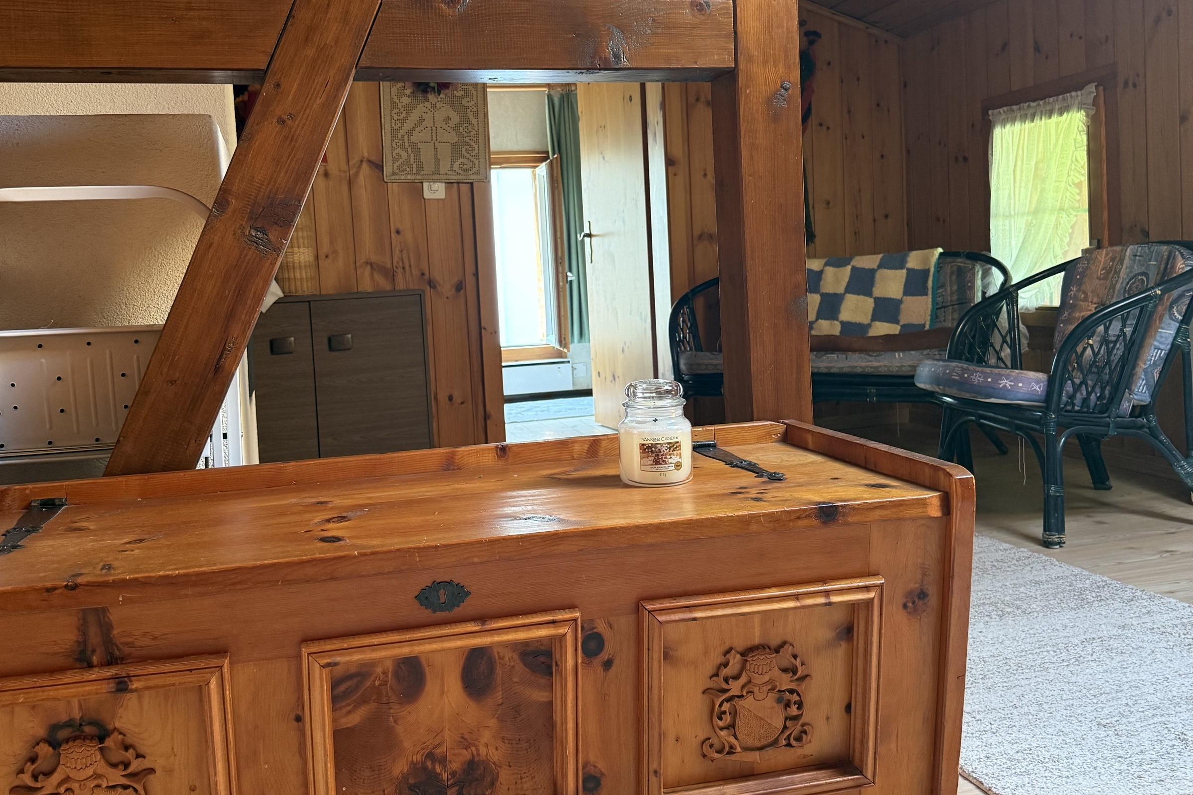 Die Ferienwohnung verfügt über ein Hauptschlafzimmer mit komfortablem Doppelbett (160 x 200 cm) ein zusätzliches Kinderzimmer mit Hochbett ein Badezimmer mit Waschbecken, Waschmaschine und separater Dusche eine liebevoll erhaltene Wohnstube im 70er-Jahre-Stil mit Esstischecke, Sofa und Kachelofen eine praktische, voll ausgestattete offene Küche Inneneinrichtung & Technik
