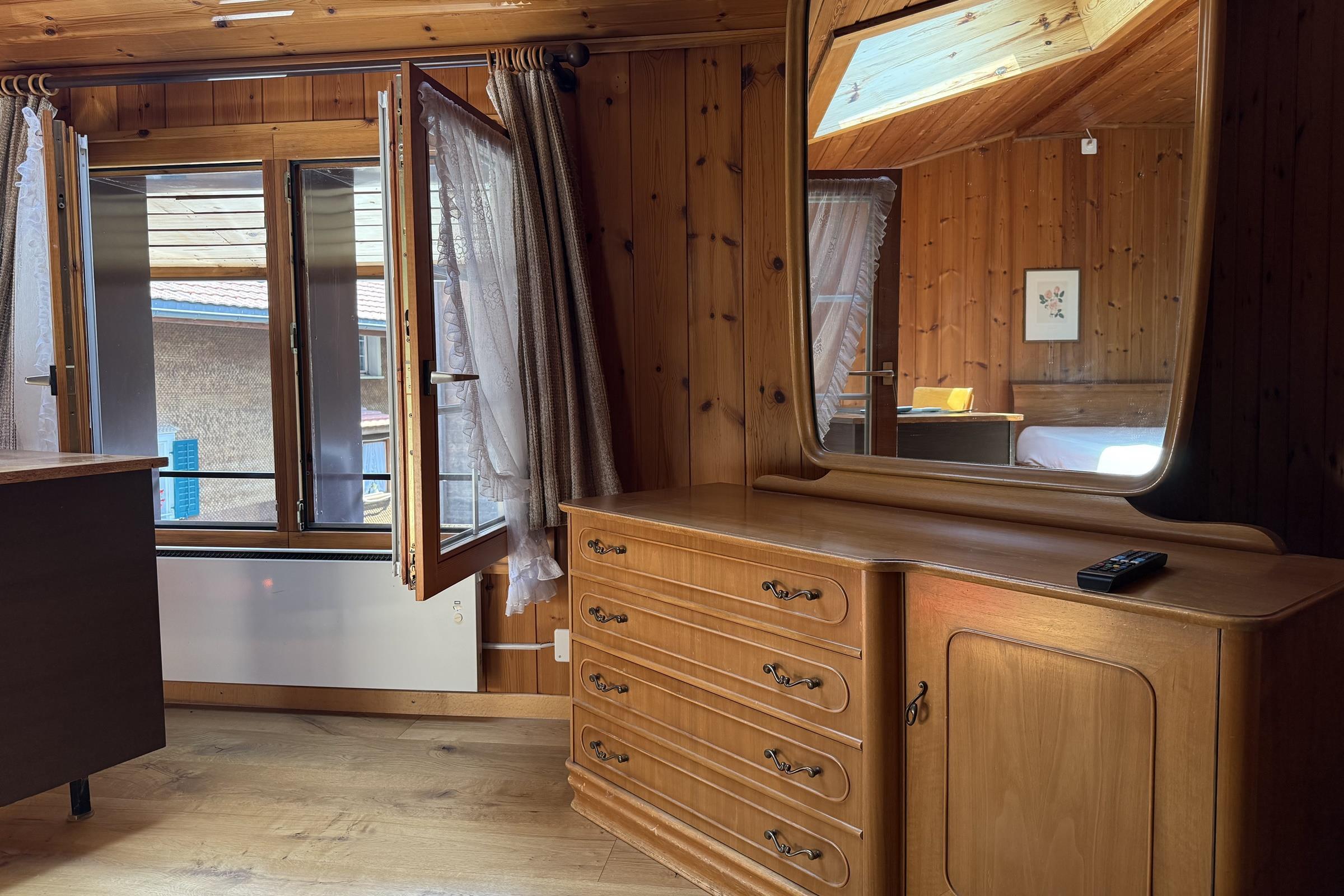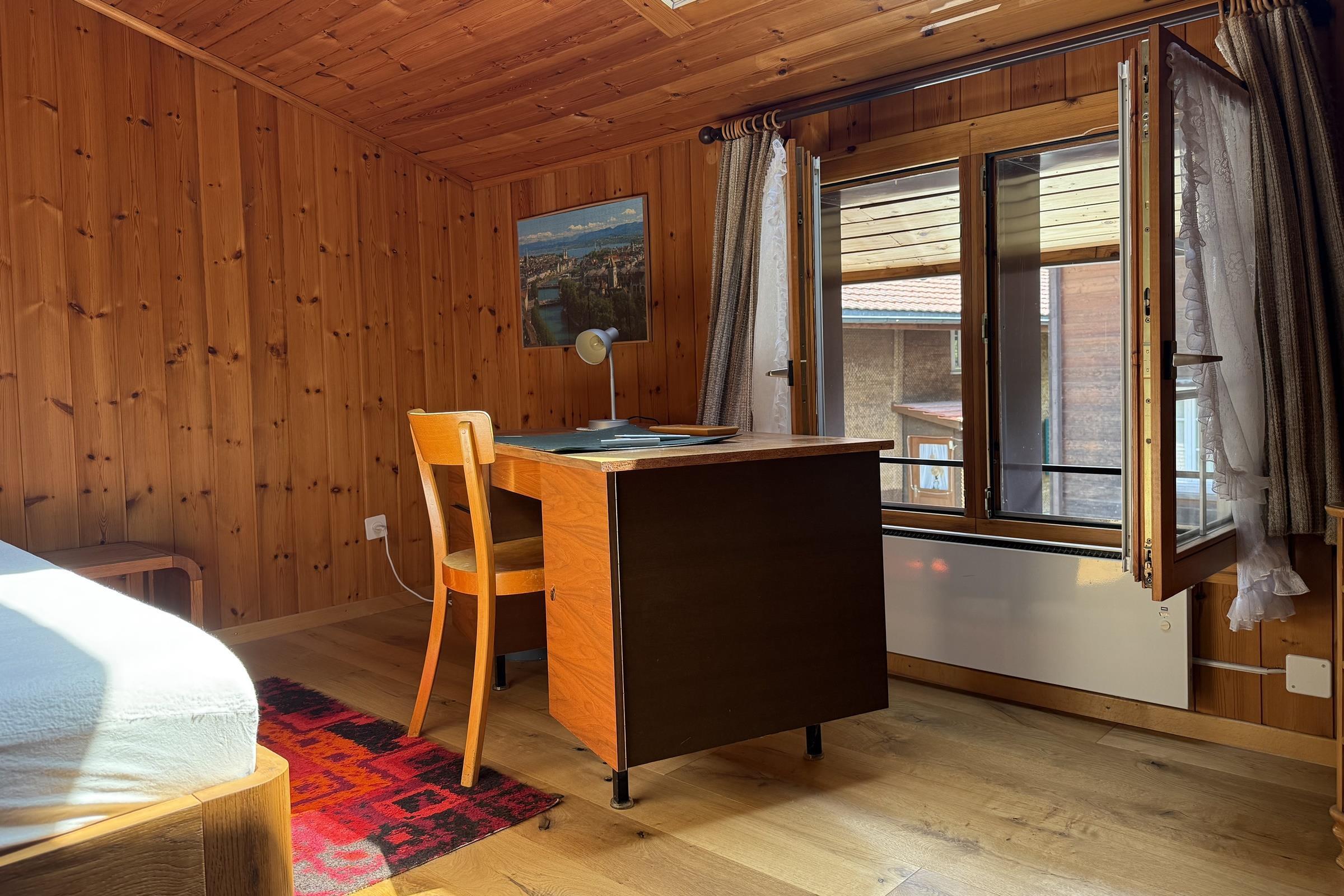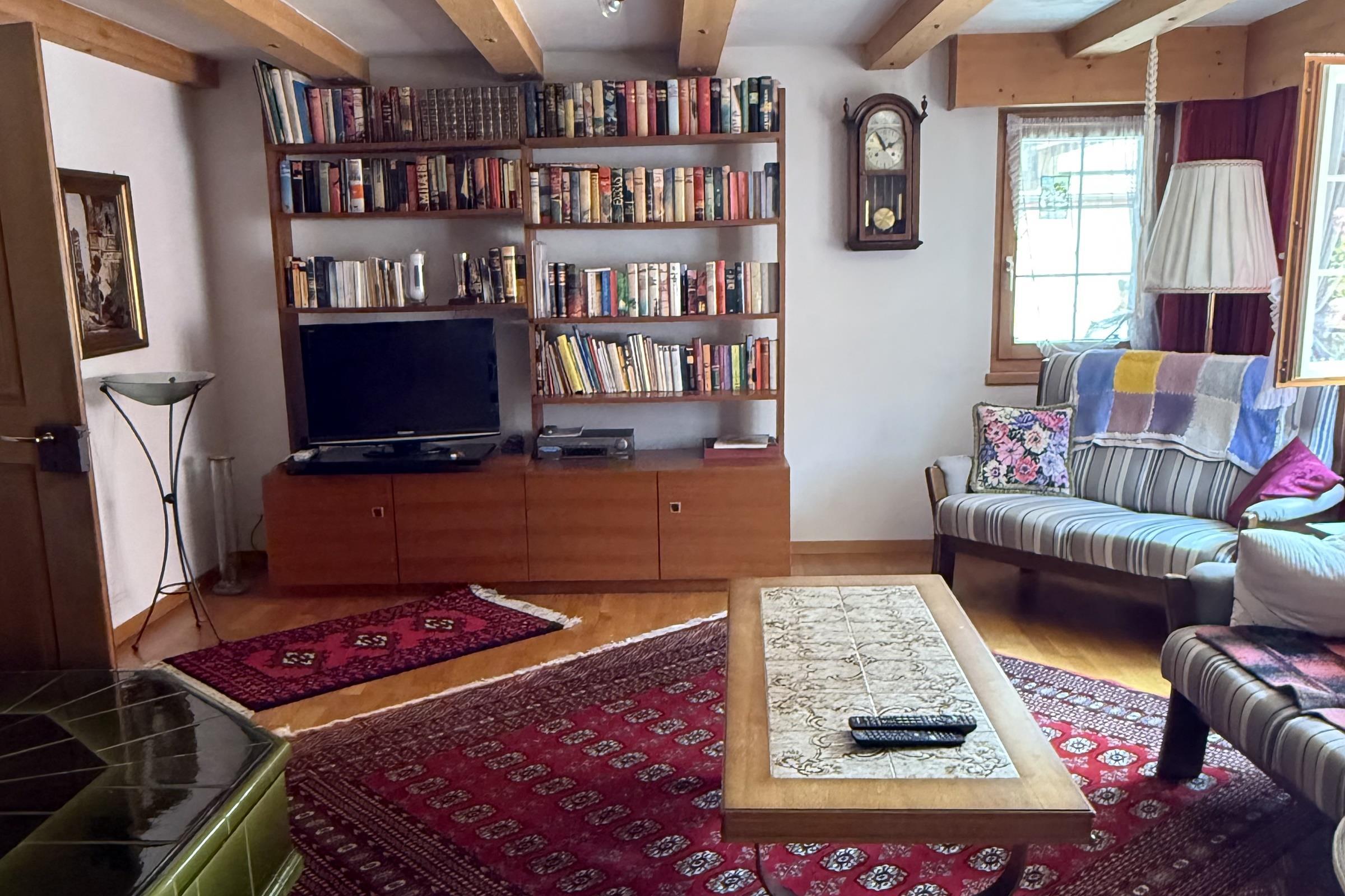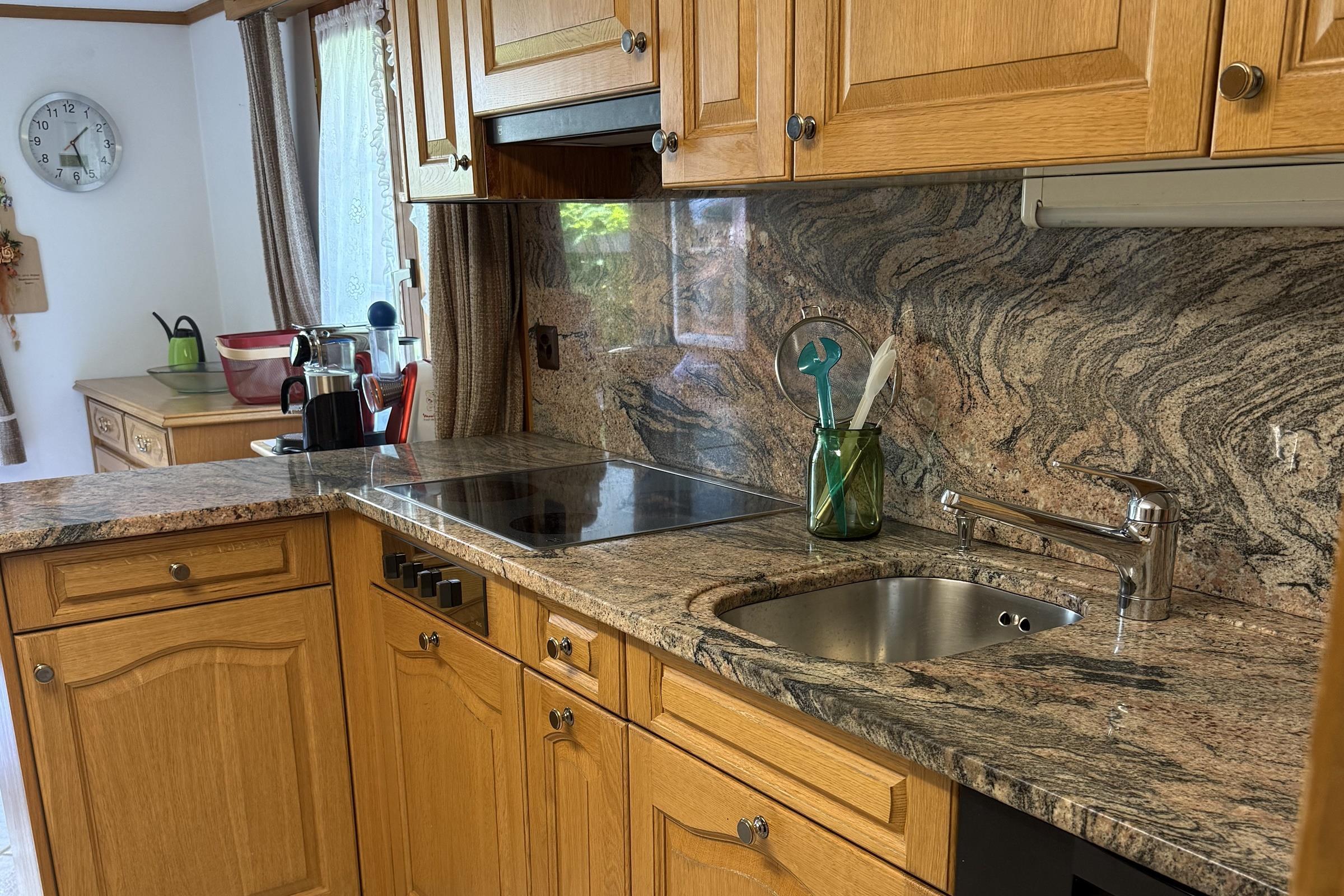Die Ferienwohnung verfügt über ein Hauptschlafzimmer mit komfortablem Doppelbett (160 x 200 cm) ein zusätzliches Kinderzimmer mit Hochbett ein Badezimmer mit Waschbecken, Waschmaschine und separater Dusche eine liebevoll erhaltene Wohnstube im 70er-Jahre-Stil mit Esstischecke, Sofa und Kachelofen eine praktische, voll ausgestattete offene Küche Inneneinrichtung & Technik