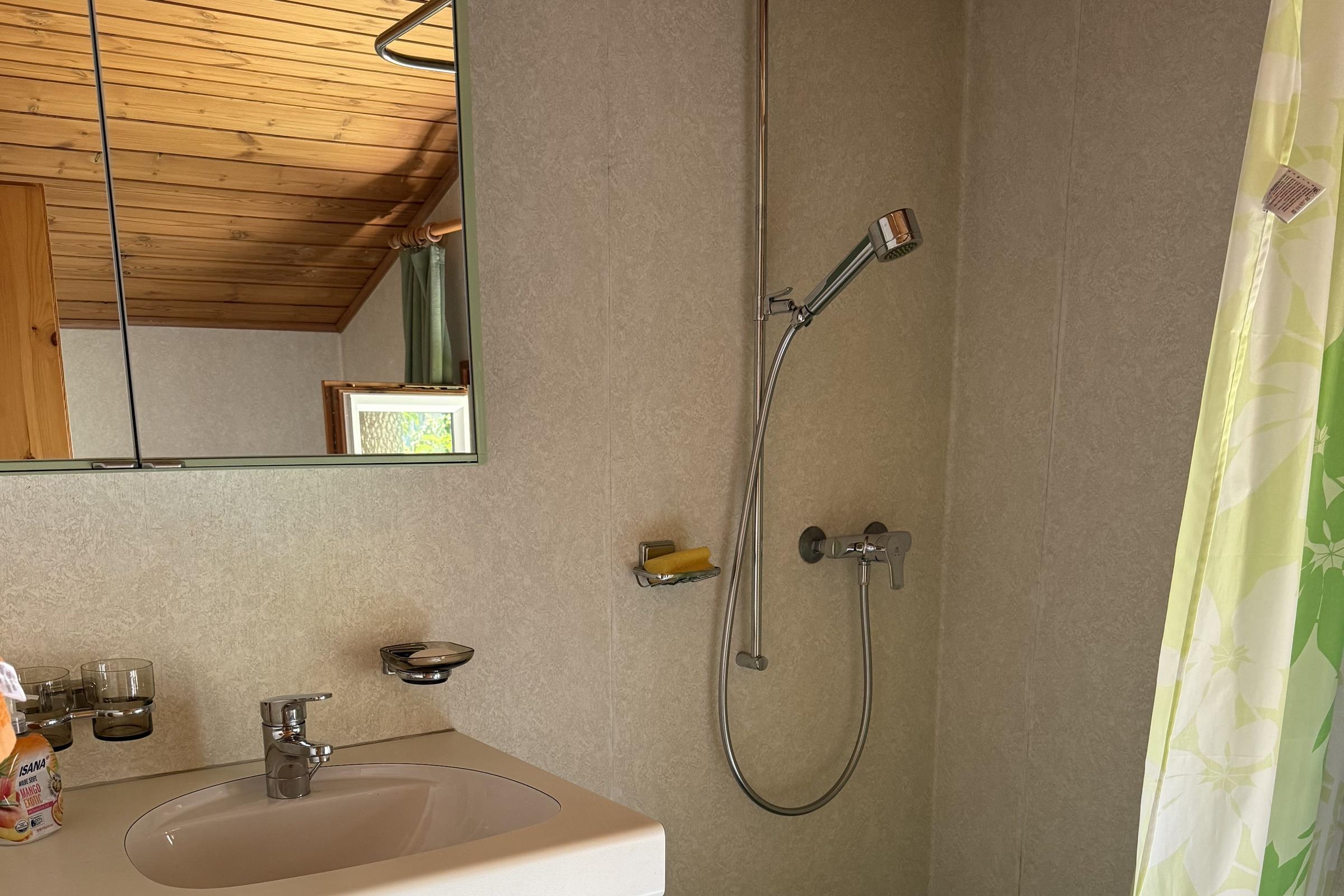 Das Badezimmer verfügt über ein Lavabo, eine Waschmaschine und eine separate Dusche. Wohnzimmer