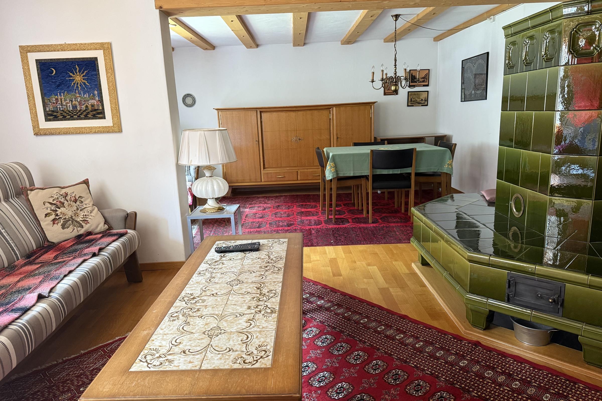 Liebevoll erhaltene Wohnstube im 70er-Jahre-Stil, mit Esstischecke, Sofa und Kachelofen- sorgt für eine besondere Atmosphäre