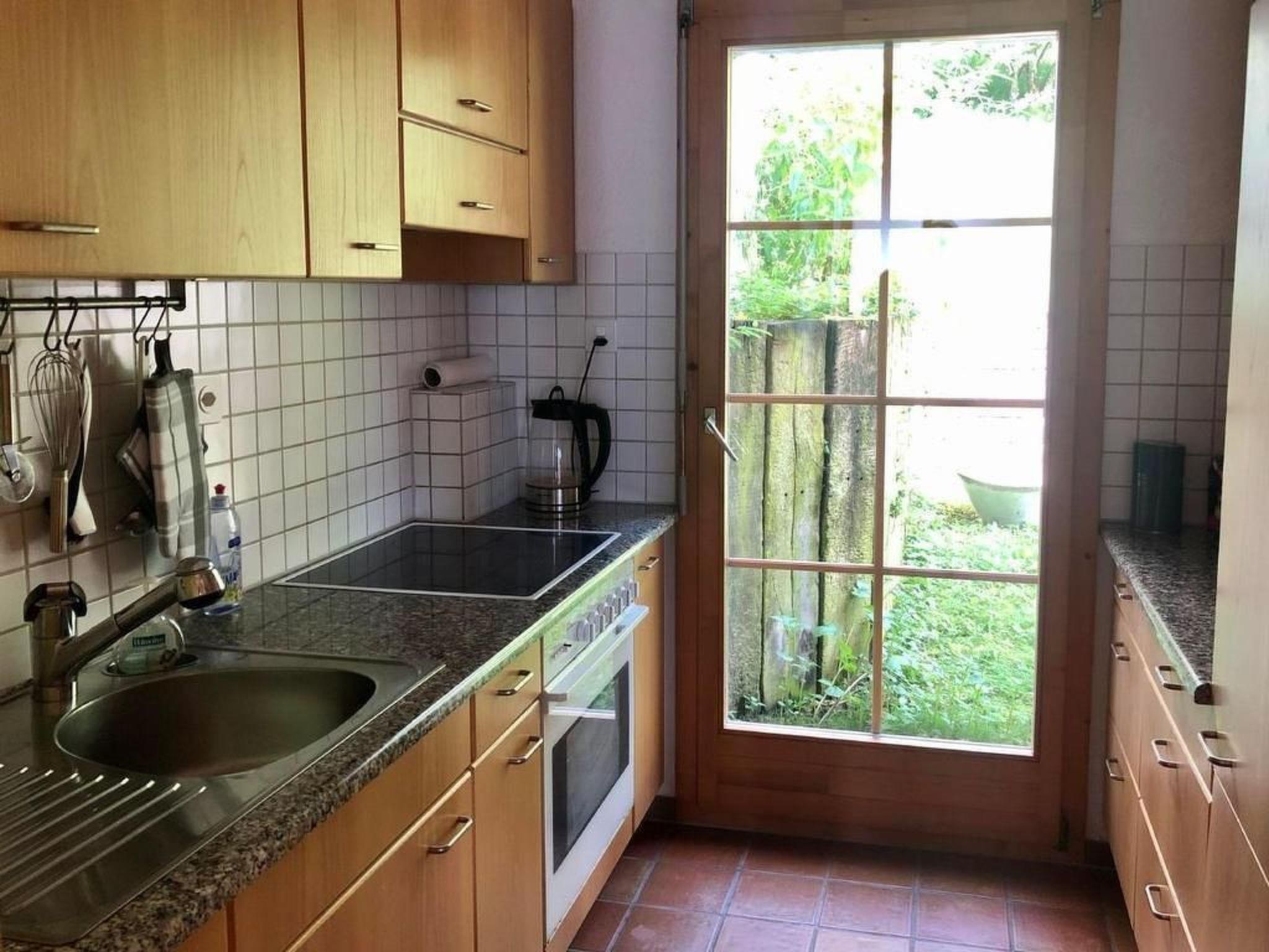 Sonstige Kücheneinrichtung (Küche1): Vollständig ausgestattete Küche (auch Racletteofen, Brotbackautomat, Mixer etc.). Herd, Ofen und Geschirrspülmaschine wurden 2020 erneuert. Von der Küche gelangt man in den oberen Teil des Gartens mit dem Pizzaofen und einem Weber-Kugelgrill.