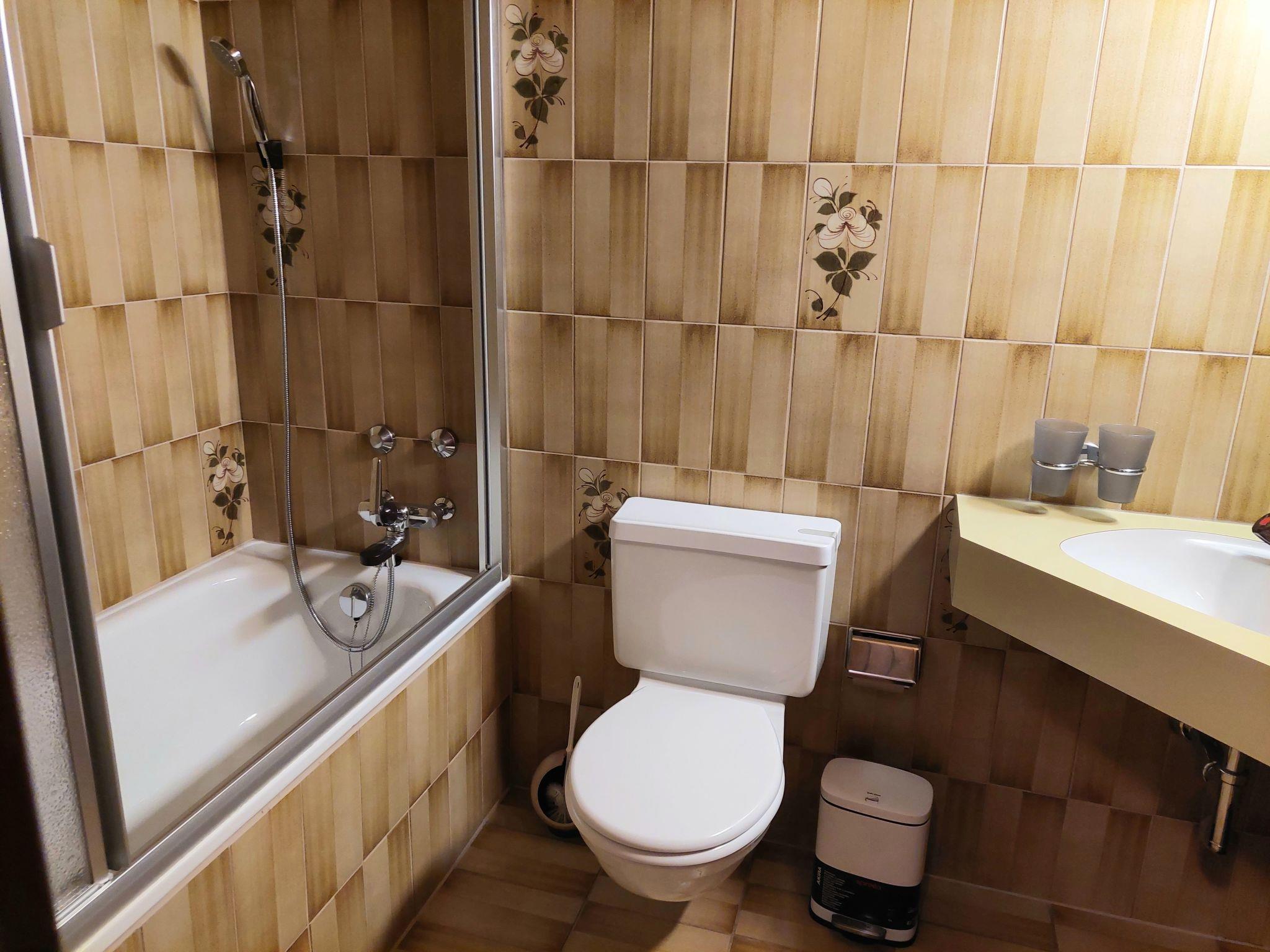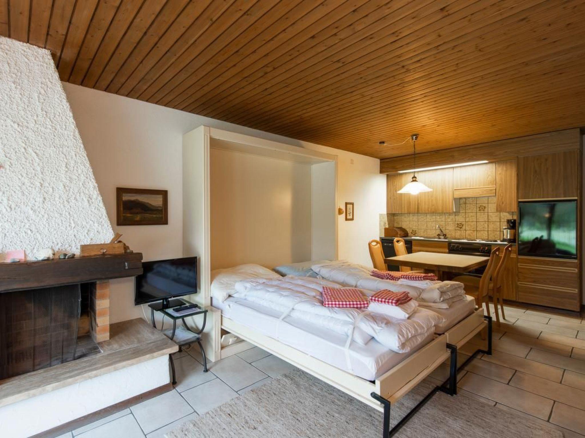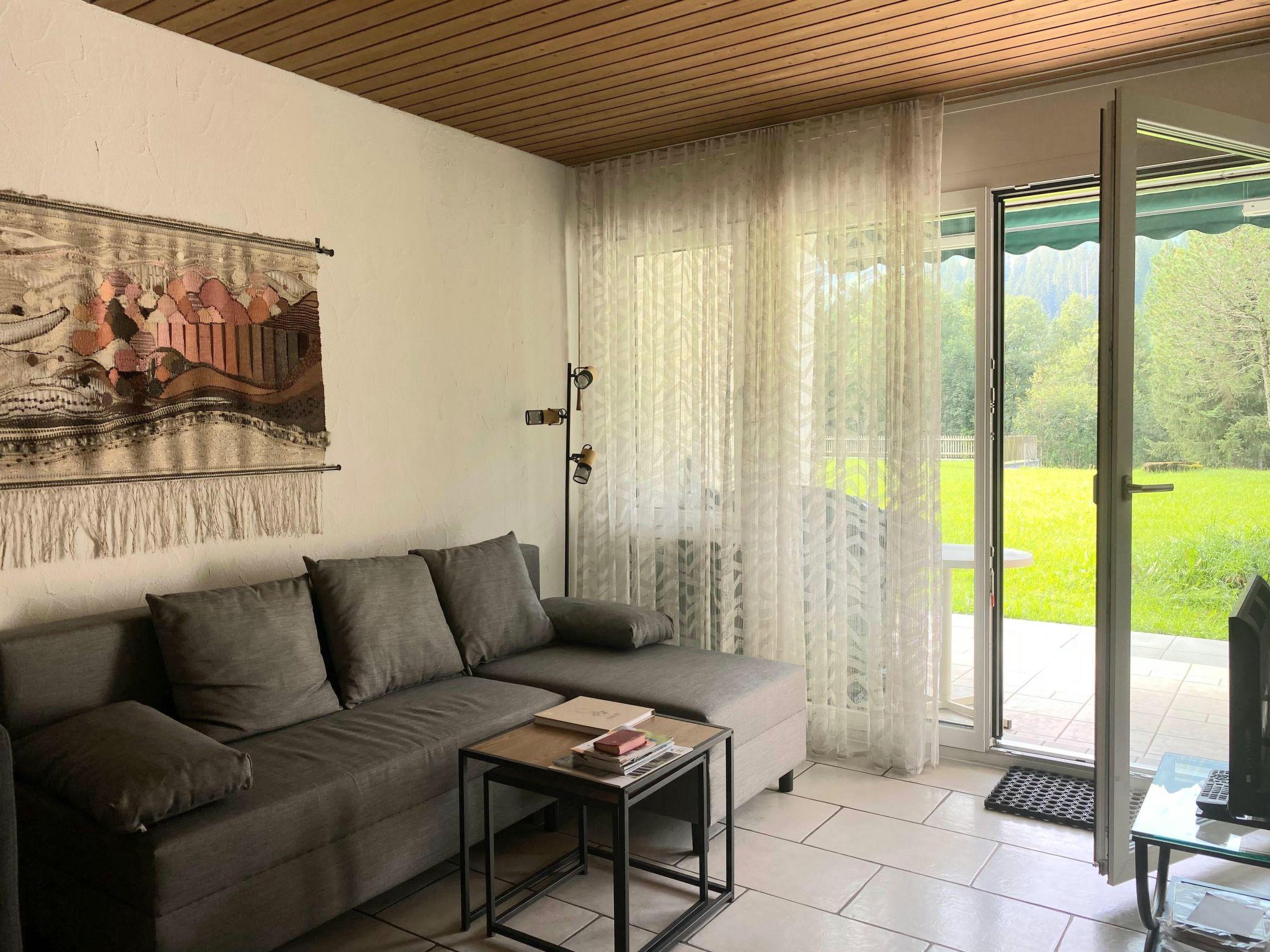 Die Wohnung präsentiert sich als eine 2 ½ Zimmer-Wohnung mit einem charmanten länglichen Grundriss, der ein Doppelschlafzimmer umfasst, das geschickt mit einem Vorhang vom Wohnzimmer getrennt ist. Richtung Süden öffnet sich ein geräumiges Wohnzimmer, ausgestattet mit einem einladenden Cheminée, einer bequemen Polstergruppe und einem Esstisch, perfekt für gemütliche Abende. Für zusätzliche Schlafmöglichkeiten stehen im Wohnzimmer 2 Kippbetten zur Verfügung. Die offene Küche ist großzügig gestaltet und mit allem Komfort wie Elektroherd, Abwaschmaschine und Kaffeemaschine ausgerüstet. Für den praktischen Alltag finden Sie im Keller zudem eine Waschmaschine und einen Tumbler mit Zeitautomat.