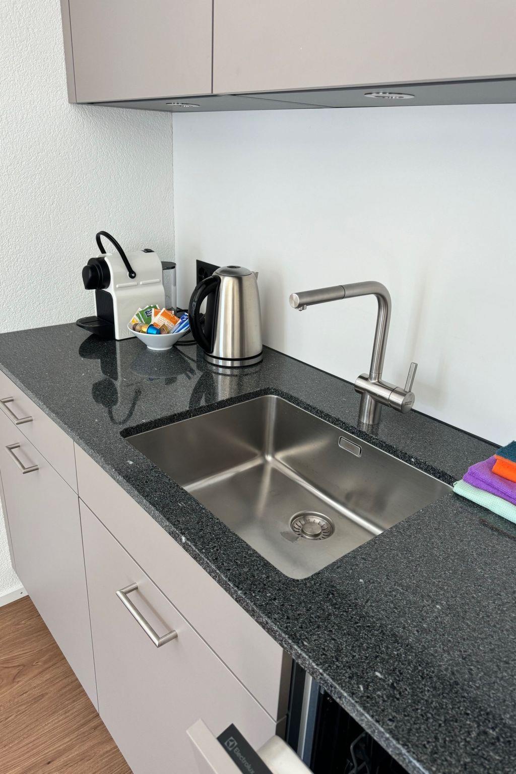 Einer voll ausgestatteten Küche inkl. Backofen, Spülmaschine, Kaffemaschine, Wasserkocher und Raclette-Set