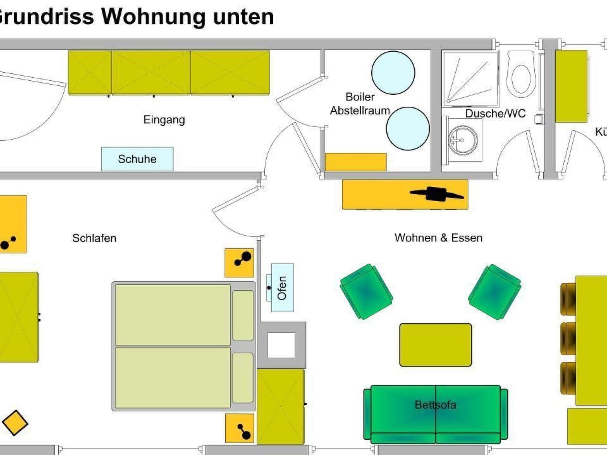 Diese Wohnung im Parterre bietet Platz für bis zu 4 Personen und verfügt über ein Schlafzimmer, einen Wohn-Essbereich mit Schlafsofa (160 cm breit, mit Lattenrost) sowie eine separate Küche. Sie hat einen direkten Zugang zur grossen Spielwiese mit Feuerstelle – ideal für Familien und Naturfreunde.