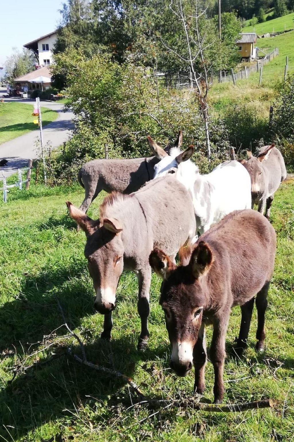 Auf unserem Hof haben wir Kühe, Kälber, Mutterkühe, Esel, Hunde, Katzen, Ziegen, Schafe, Hühner und Schweine.