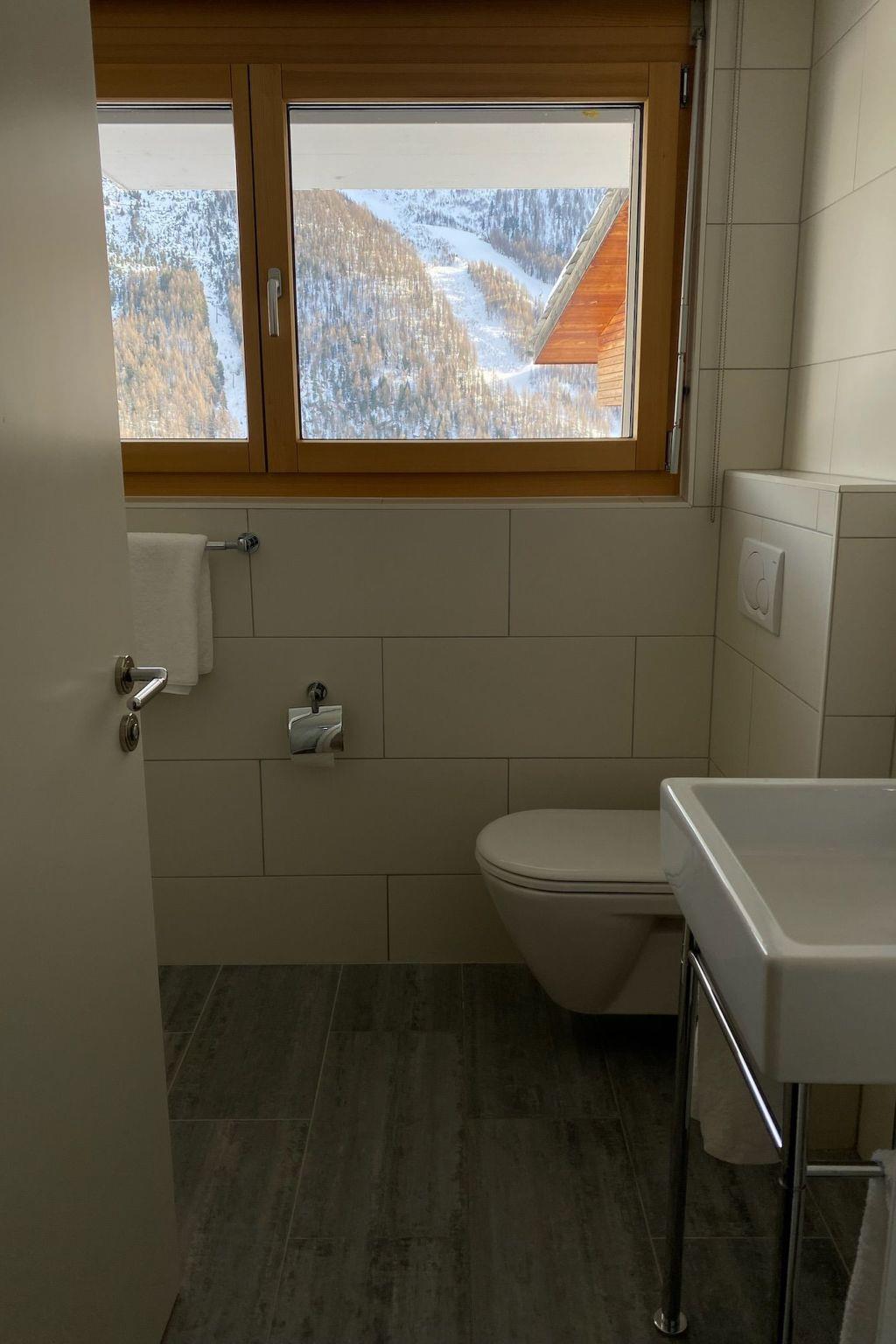 Einen Stock weiter unten hat es ein Schlafzimmer mit einem Doppelbett, Kleiderschrank, Kommode, Zugang zum Balkon und einem Bad mit Wellness-Dusche. Es hat auch ein weiteres Schlafzimmer mit Doppelbett, Zugang zum Balkon und einem Kleiderschrank. Ausserdem hat es noch ein Badezimmer auf dem Stock und den Skiraum.