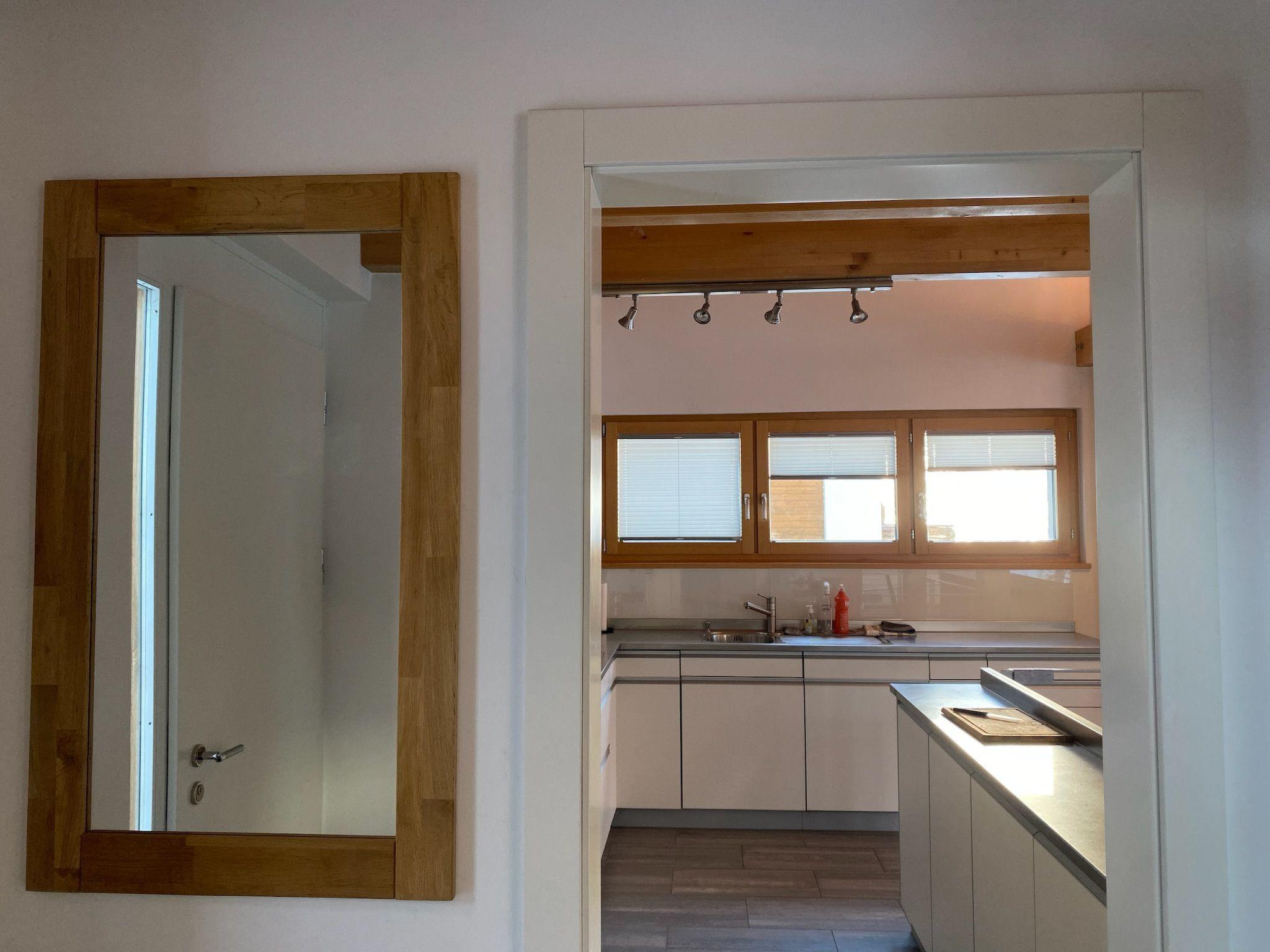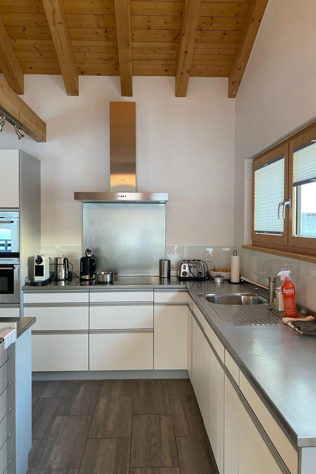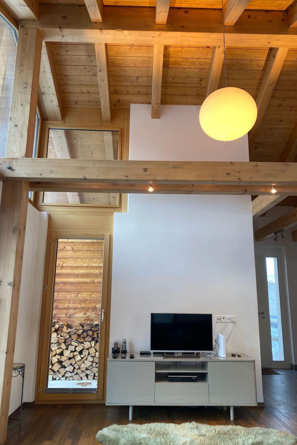 Man betritt das Chalet im obersten Stock, dem Wohnbereich. Hier befindet sich eine Toilette, ein grosses Sofa & ein Fernseher, der Kamin, ein kleines Tischchen mit Stuhl, der Esstisch mit sechs Stühlen, die grosszügige Küche und ein Balkon. Auf dem Balkon steht ein kleines Tischen, zwei Stühle und zwei zusammenklappbare Stühle. Die Küche verfügt über einen Herd, einen Steamer, einen Mikrowellen-Ofen, einen Wasserkocher, eine Kaffeemaschine, einen Toaster, eine Geschirrspülmaschine, einen Kühlschrank, sowie diverse Utensilien zum kochen.