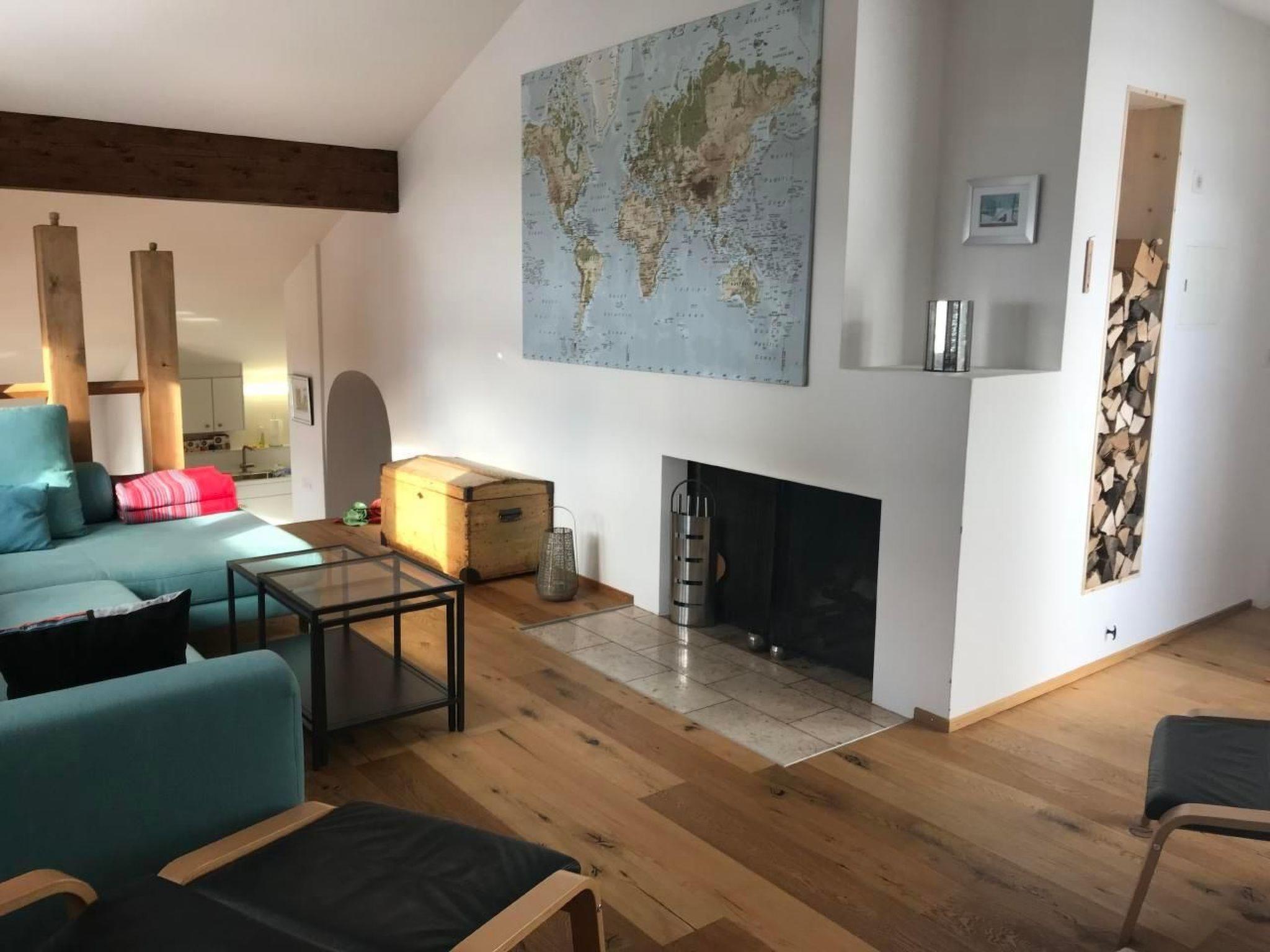 Von beiden hat man eine wunderschöne Sicht in die Berge und auf die Skipisten. Das Cheminée, der Echtholzboden und die gemütliche, persönlich gehaltene, Einrichtung mit Holz, Arve und "Schälleurslibilder" sowie hellen Wänden und Decken, geben einem ein wunderbares Wohlbefinden. Die zwei Nasszellen die eine mit Dusche/WC die zweite mit Wirlpool/WC, lassen einem die Ferien so richtig geniessen. Im unteren Bereich der Wohnung befindet sich die Küche mit Esszimmer und ein Mehrbettzimmer für 4 Personen. Speziell ist der Vorhang vor jedem Bett, er macht, dass die Zimmergenossen nicht gestört sind. Es ist ein Doppelbett 160x220cm und zwei Betten 140x200cm, diese beiden Betten sind übereinander. alle haben eine eigene Steckdose und Lampe. Ein Campingbett für Kleinkinder ist vorhanden. Die Dritte Bettetage ist nur für sportliche und daher in der Personenzahl nicht mitgerechnet, darf nur auf eigenen Verantwortung benützt werden.
