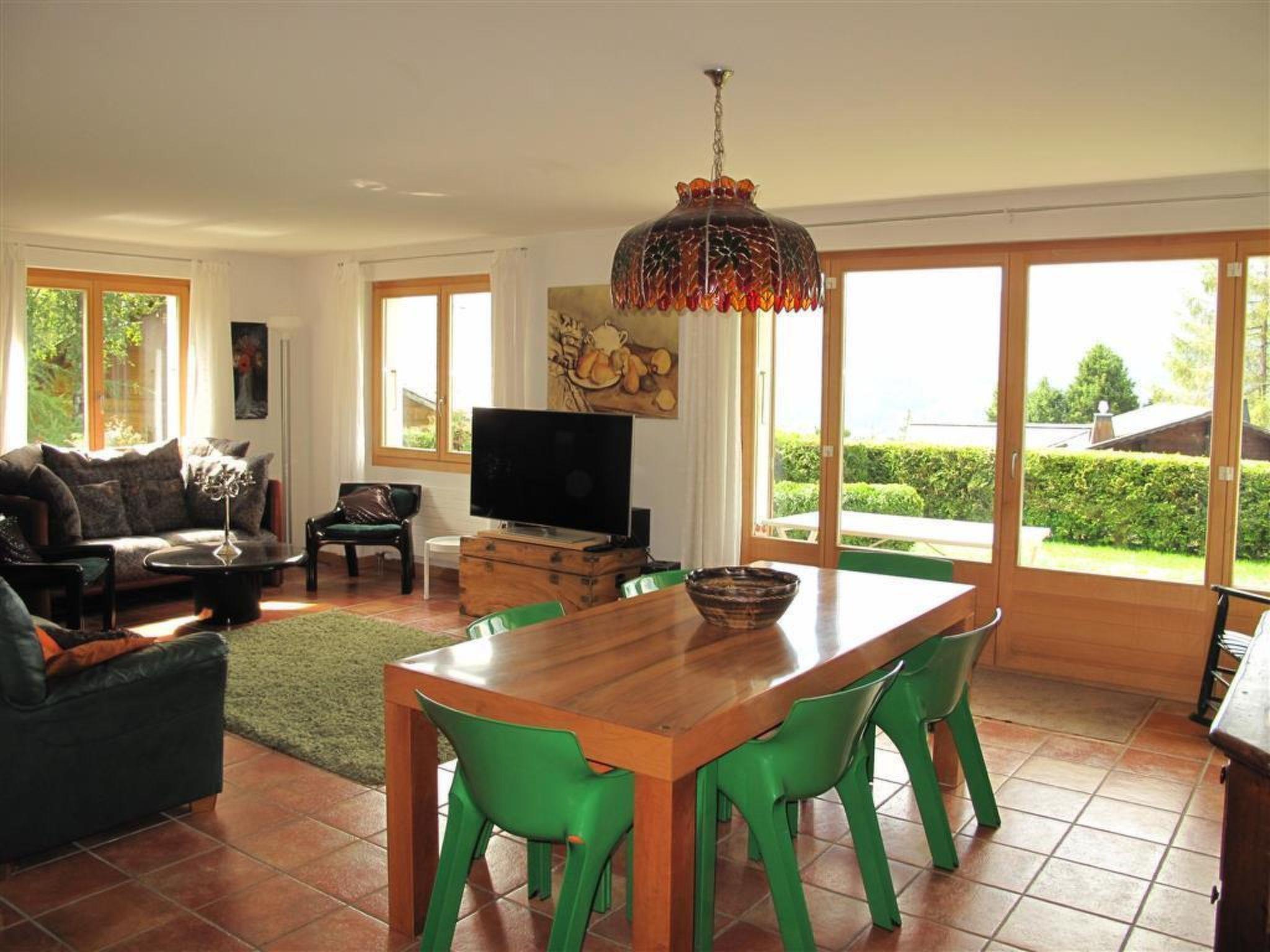 Die Wohnung ist stilvoll eingerichtet mit Holz und antiken Möbeln und verfügt über 3 separate Schlafzimmer (1 Schlafzimmer mit Doppelbett (160x200cm), 2 Schlafzimmer mit je zwei Einzelbetten (je 80x200cm)). Das Wohnzimmer ist mit Sofas, Salontisch, Cheminée-Ofen, WiFi, 55-Zoll-TV, Radio CD/DVD und einem Esstisch für 8 Personen ausgestattet. Die separate Küche bietet einen Bar-Tisch für 3 Personen und ist mit Backofen, Mikrowelle, Geschirrspüler, Kühlschrank inkl. Eisfach, Bohnen-Kaffeemaschine, Fondue- und Raclette-Set ausgerüstet. Waschmaschine und Tumbler befinden sich auch in der Küche. Die Wohnung hat ein Badezimmer mit Badewanne und WC und eine separate Toilette. Der Garten mit Liegestühlen und die gedeckte Terrasse mit Tisch und Stühlen laden ein zur Erholung und den Genuss der herrlichen Bergwelt. Im Winter sind 4x4 oder Schneeketten von Vorteil.