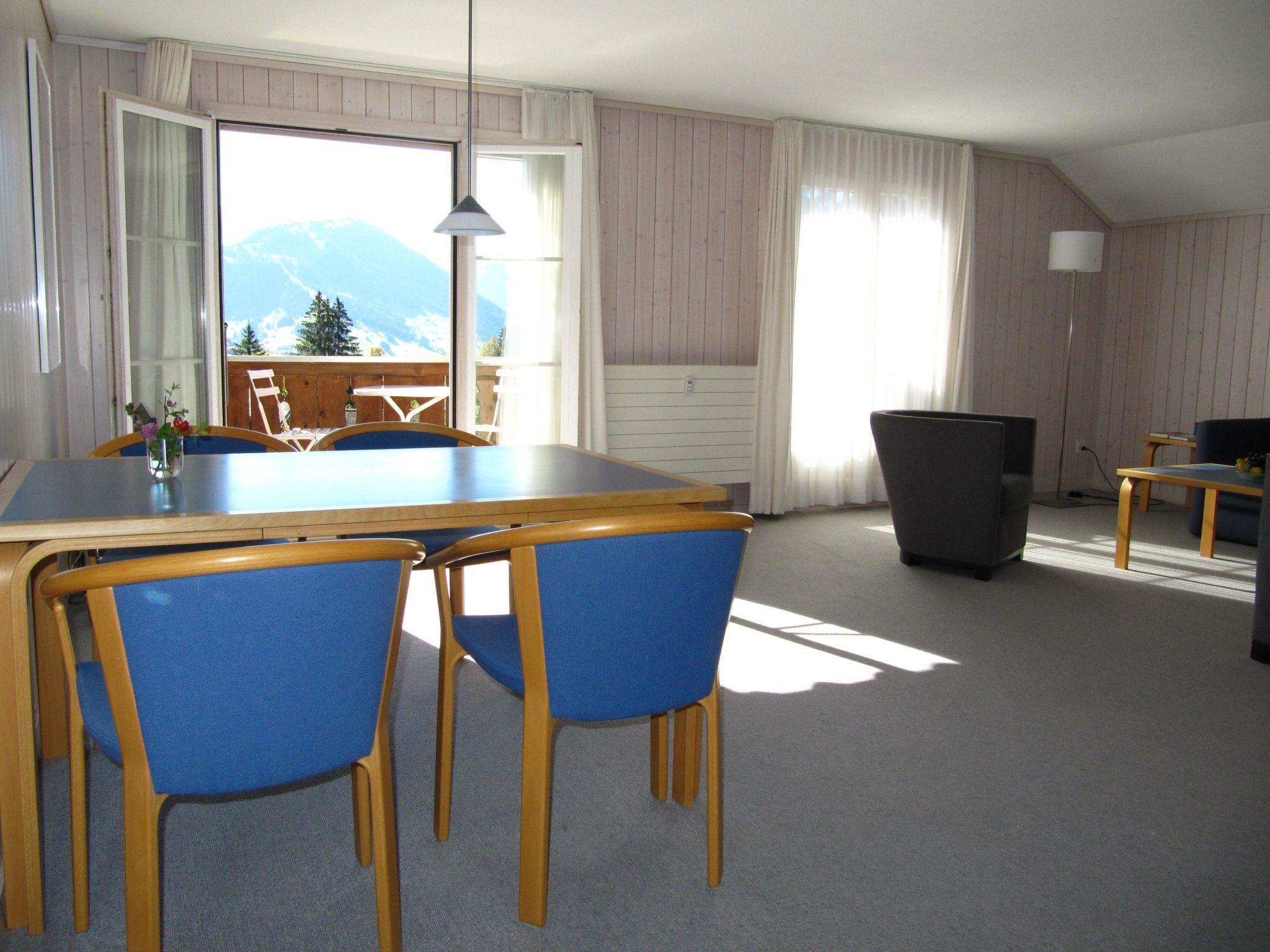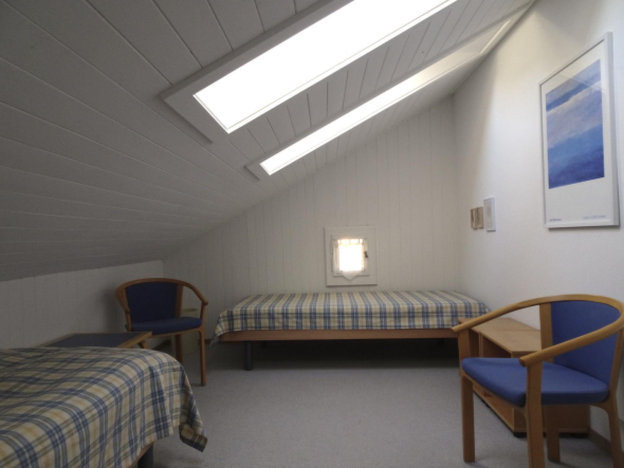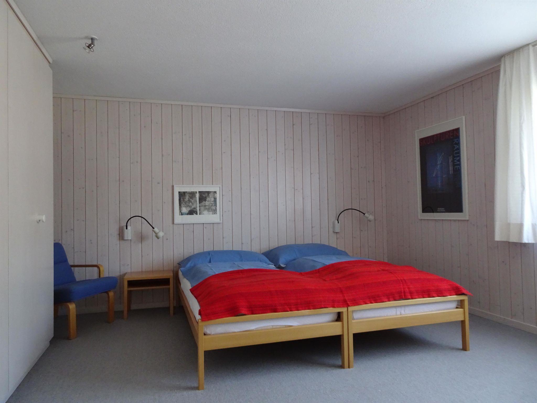 Grosse, möblierte 2.5-Zimmerwohnung (80m2) in der 3. Etage. Wohnzimmer mit Sofa-Bett (Breite:180cm), TV, Radio/CD-Player, Telefon und Internetanschluss WiFi. Offene Küche (u.a. ausgestattet mit Keramikherd, Backofen, Kühlschrank mit Gefrierfach, Geschirrspüler, Fondue-Set (beim Hauswart ausleibar), Kapsel-Kaffeemaschine(Nespresso). 1 Schlafzimmer mit Doppelbett (2x90x200cm). 1 Schlafzimmer in Dachschräge mit 2 Einzelbetten (2x90x200cm). Badezimmer mit Dusche und WC. Kinderbett (60x120cm) inkl. Bettwäsche vorhanden.