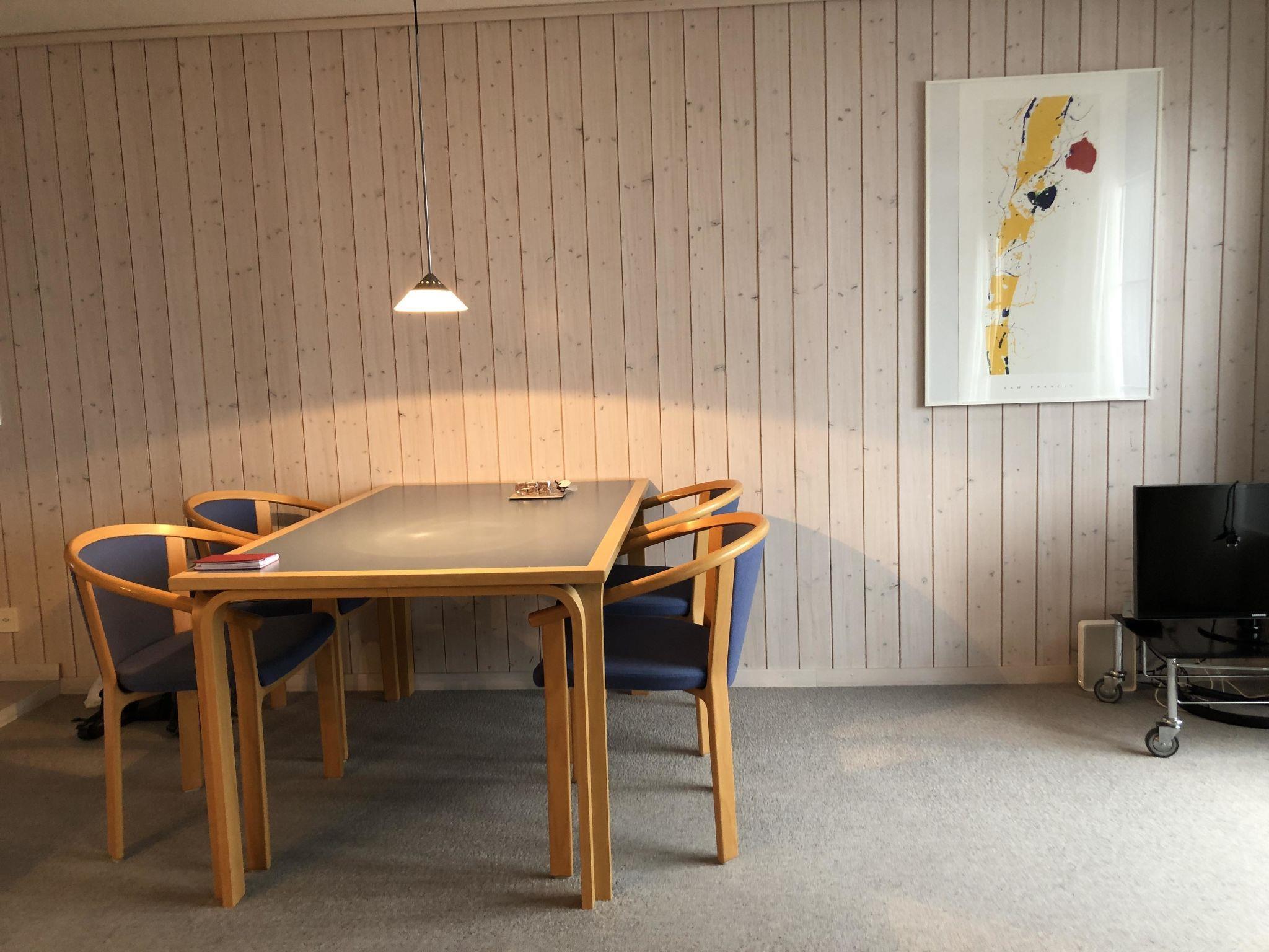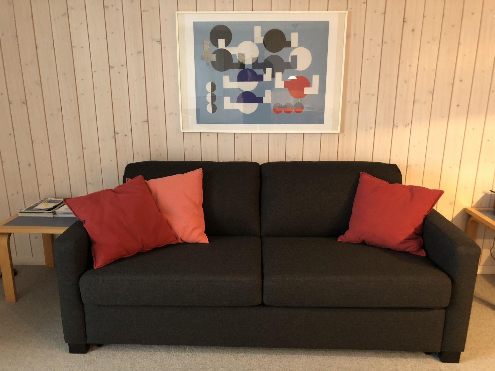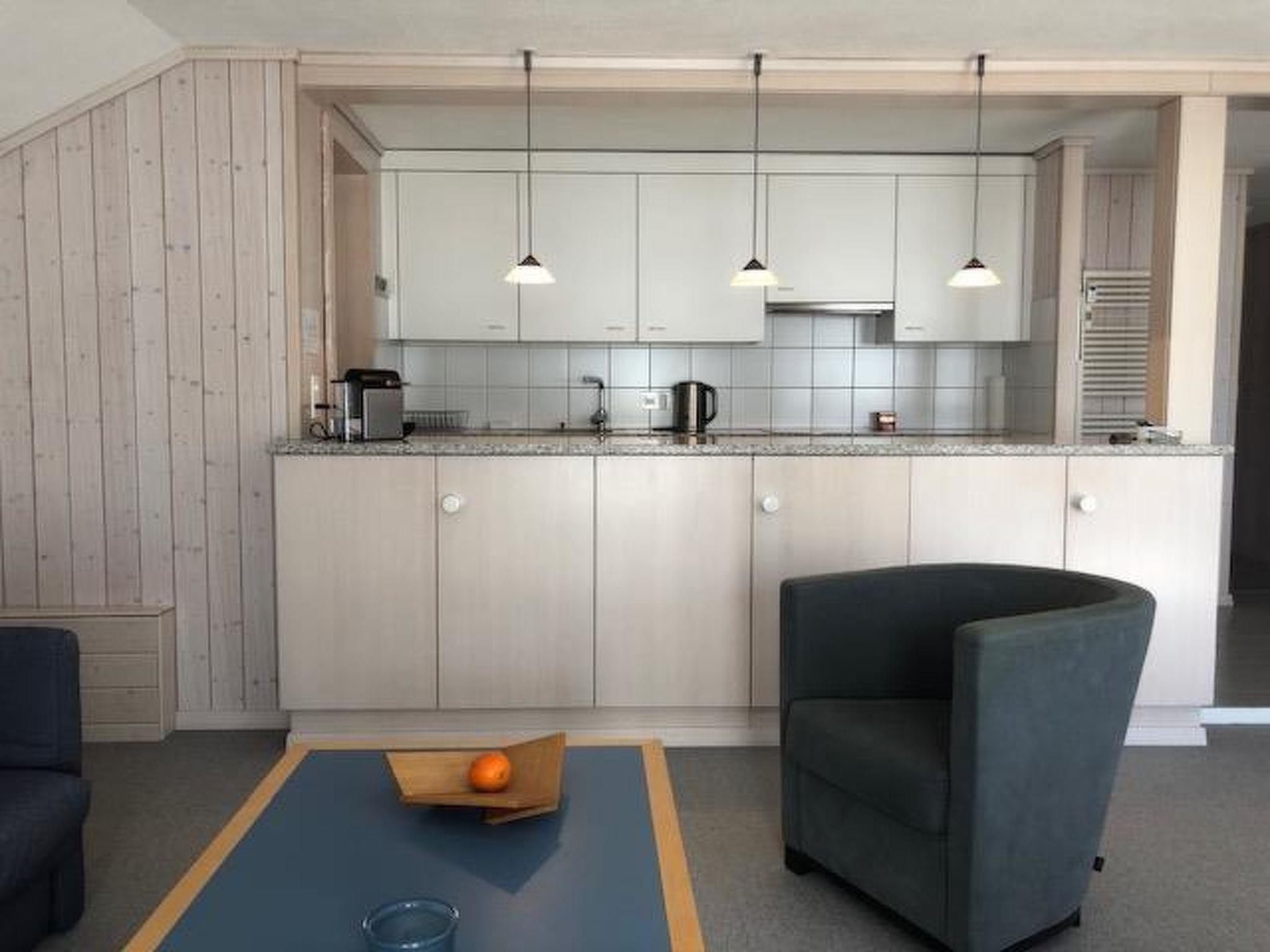 Grosse, möblierte 2.5-Zimmerwohnung (80m2) in der 3. Etage. Wohnzimmer mit Sofa-Bett (Breite:180cm), TV, Radio/CD-Player, Telefon und Internetanschluss WiFi. Offene Küche (u.a. ausgestattet mit Keramikherd, Backofen, Kühlschrank mit Gefrierfach, Geschirrspüler, Fondue-Set (beim Hauswart ausleibar), Kapsel-Kaffeemaschine(Nespresso). 1 Schlafzimmer mit Doppelbett (2x90x200cm). 1 Schlafzimmer in Dachschräge mit 2 Einzelbetten (2x90x200cm). Badezimmer mit Dusche und WC. Kinderbett (60x120cm) inkl. Bettwäsche vorhanden.