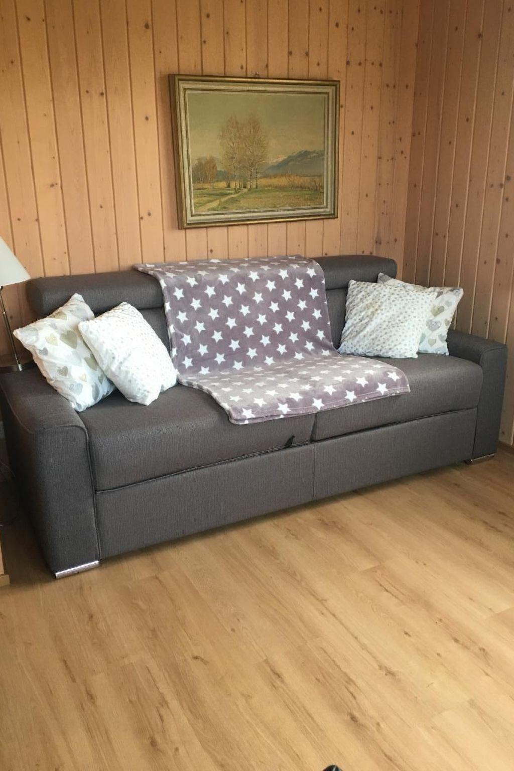 Im Inneren des Ferienhauses erwartet Sie eine liebevoll gestaltete Ausstattung, die gemütliches Wohnen in einem rustikalen Ambiente verspricht. Das Dachzimmer im 2. Stock beherbergt zwei Einzelbetten und ist über eine steile Treppe erreichbar; bei Bedarf kann der Schlafplatz um zwei weitere Betten erweitert werden. Im Wohnzimmer sorgt ein ausziehbares Bettsofa für zusätzliche Schlafmöglichkeiten. Die Küche ist voll ausgestattet mit modernen Annehmlichkeiten wie Geschirrspüler, Backofen/Steamer und einem 4er-Kochfeld. Ein weiteres Highlight ist das Badezimmer mit Fenster, das neben einer Dusche mit verschiebbarer Duschwand auch über einen Spiegelschrank und einen Haarföhn verfügt.