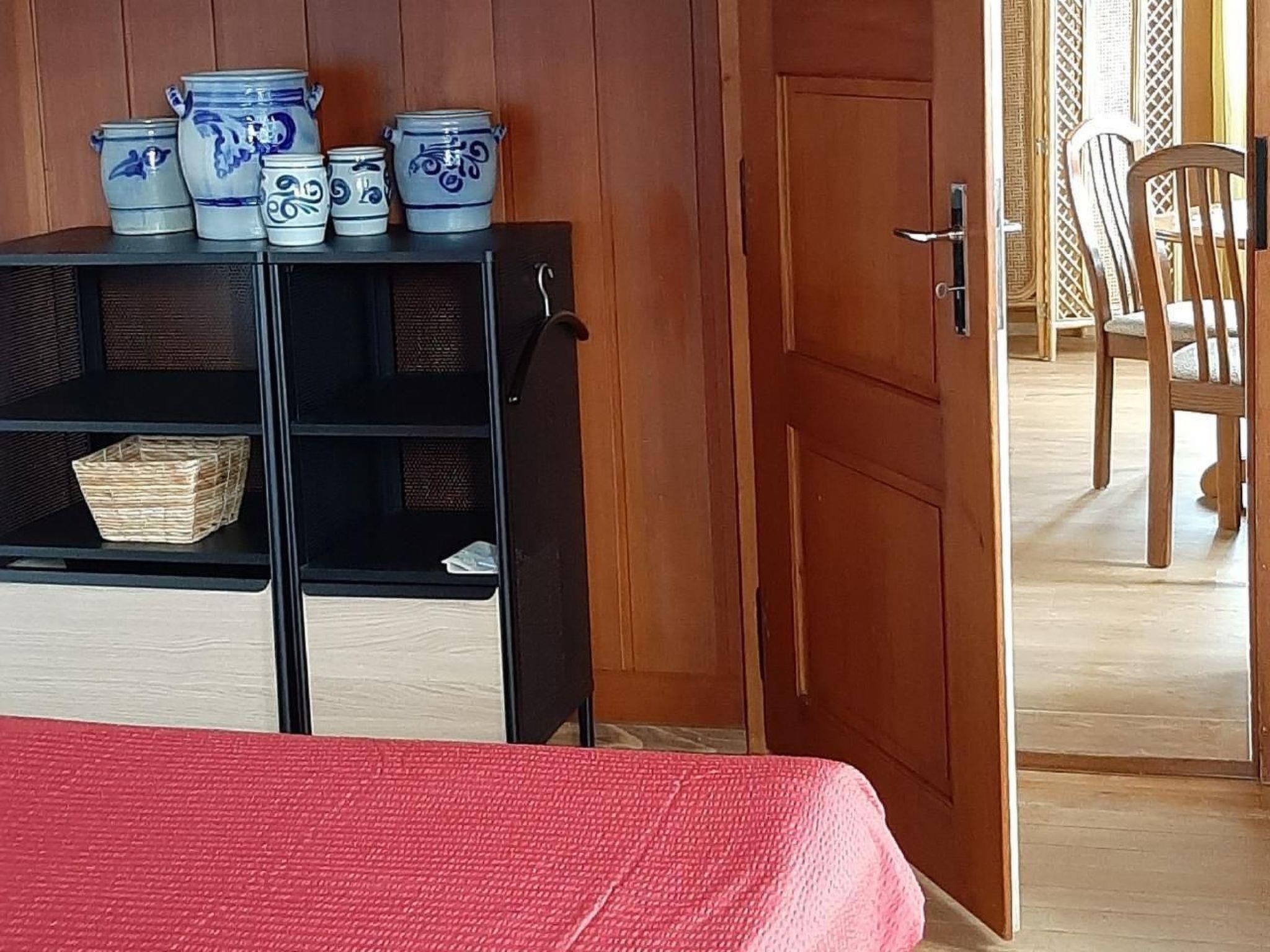 Die Innenausstattung unserer Ferienwohnung im Erdgeschoss umfasst ein sonniges, helles Wohnzimmer, das zum Verweilen einlädt, und verfügt über einen runden Esstisch für vier Personen. Die Küche ist praktisch eingerichtet mit einem integrierten Dunstabzug im Herd und einem Kühlfach im Kühlschrank. Das Schlafzimmer präsentiert sich mit einer schönen, mit Liebe und Sorgfalt restaurierten alten Zimmerdecke und einem "Riemenboden", der den historischen Charme der Wohnung unterstreicht.