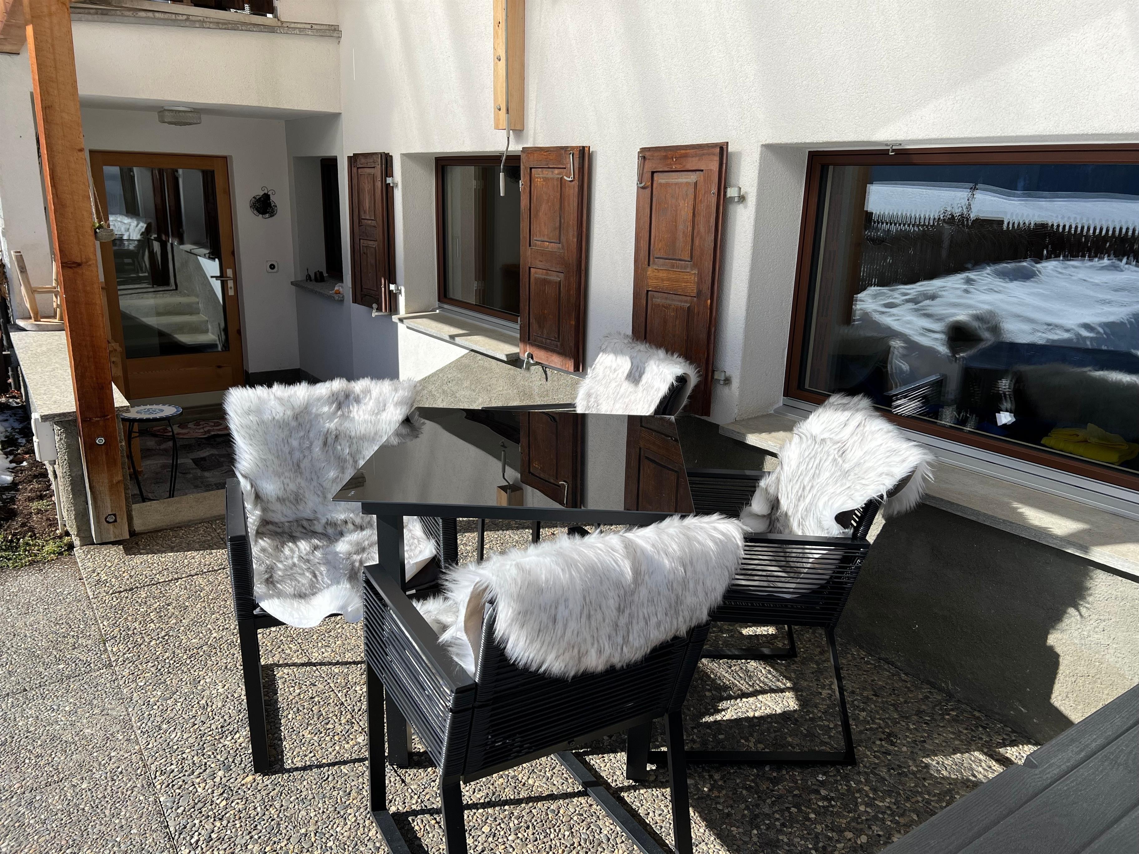 Der Sitzplatz vor der Wohnung im Garten ist gedeckt und möbliert. (2 Liegestühle mit Matte sind im Keller deponiert.