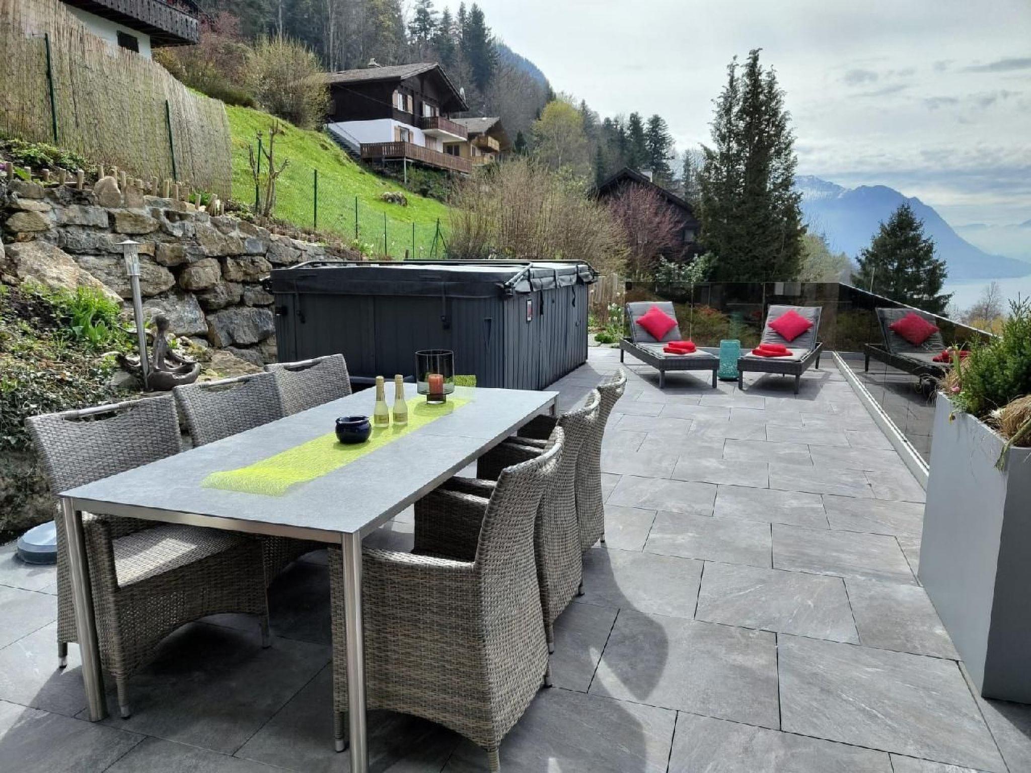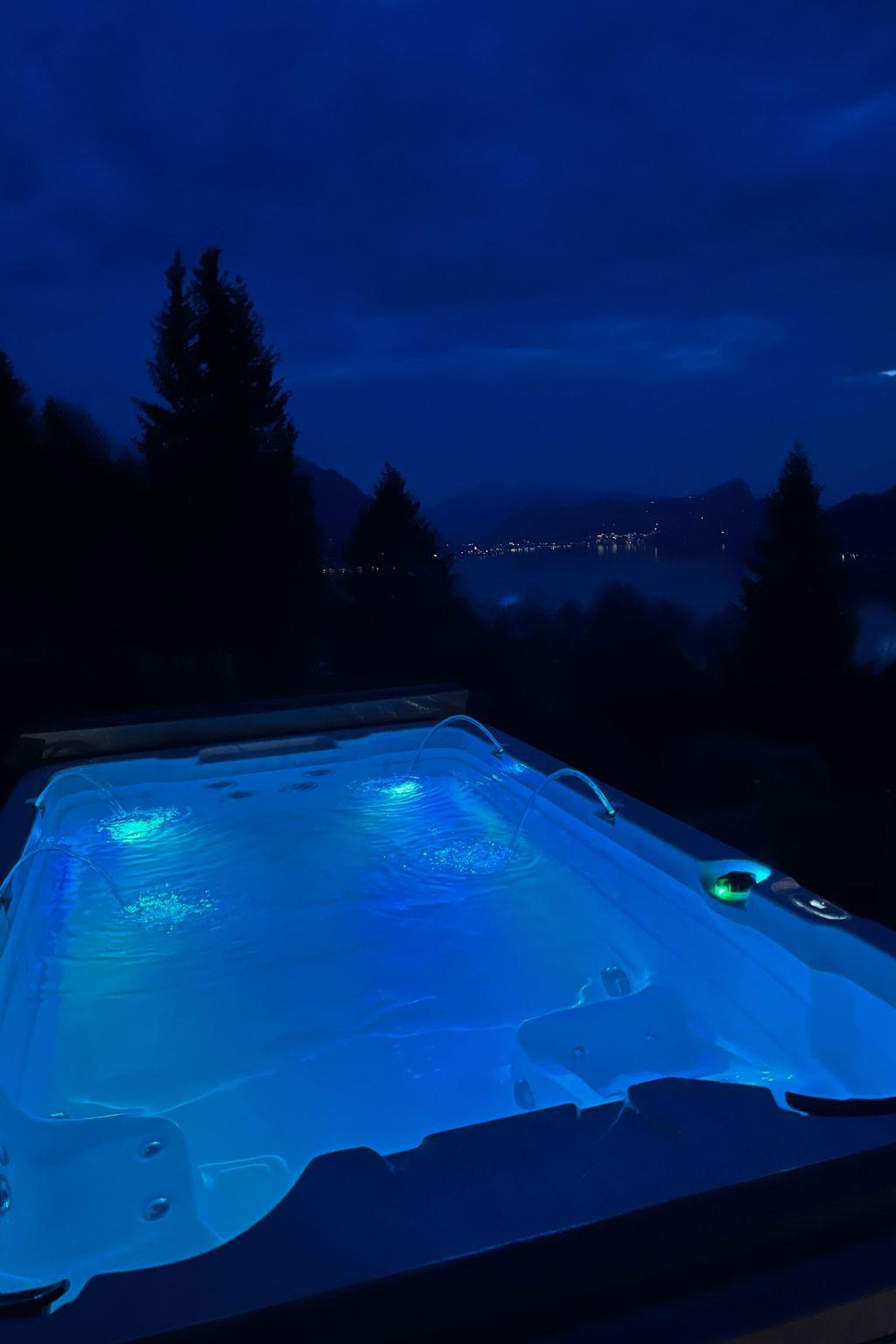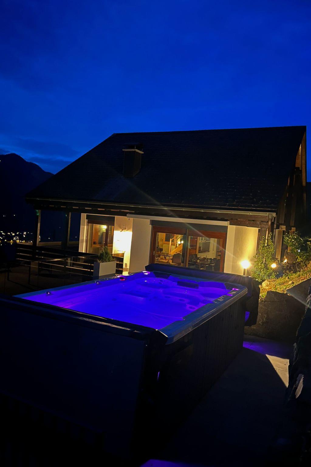 Ein großer Jacuzzi/Whirlpool mit Gegenstromanlage ist ein Traum zum Schwimmen und Baden. Entspannen Sie im warmen Bade und geniessen Sie den Fernblick auf den See und die beeindruckenden Berge im Panorama (Pilatus, Bürgenstock und die Rigi).