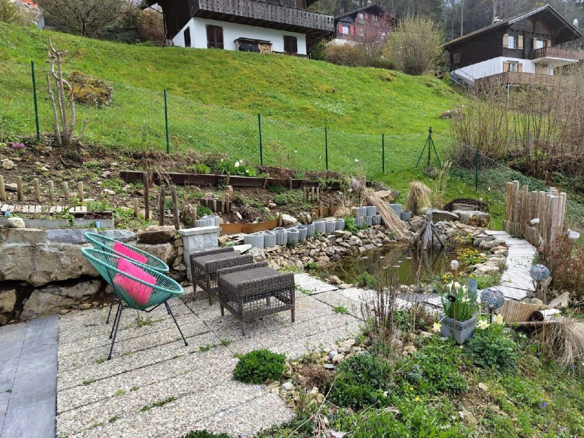 Ein kleines Biotop (Teich und Blühwiese) grenzt unmittelbar an die Terasse an.