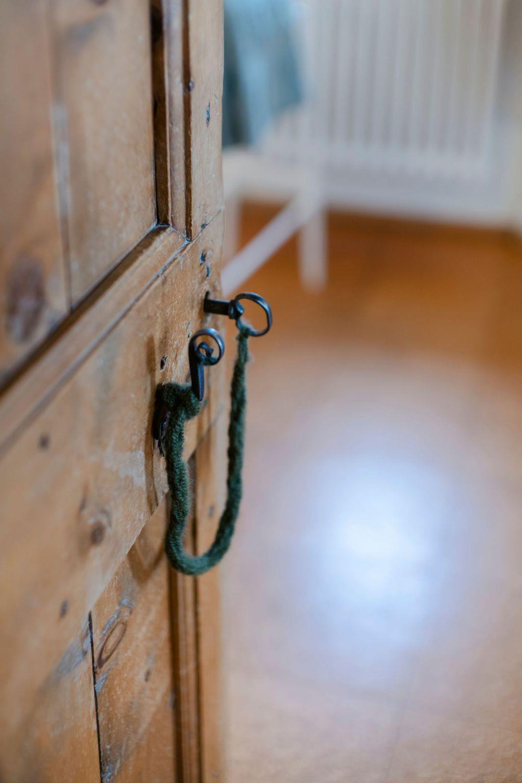 Links vom Eingang führt eine Treppe hinunter in den unteren Teil des Hauses, wo Sie ein sehr schönes Doppelzimmer mit einem großen Südfenster, ein kleines Badezimmer mit Waschküche, eine separate Toilette und einen alten Keller mit Zugang zum Garten finden.