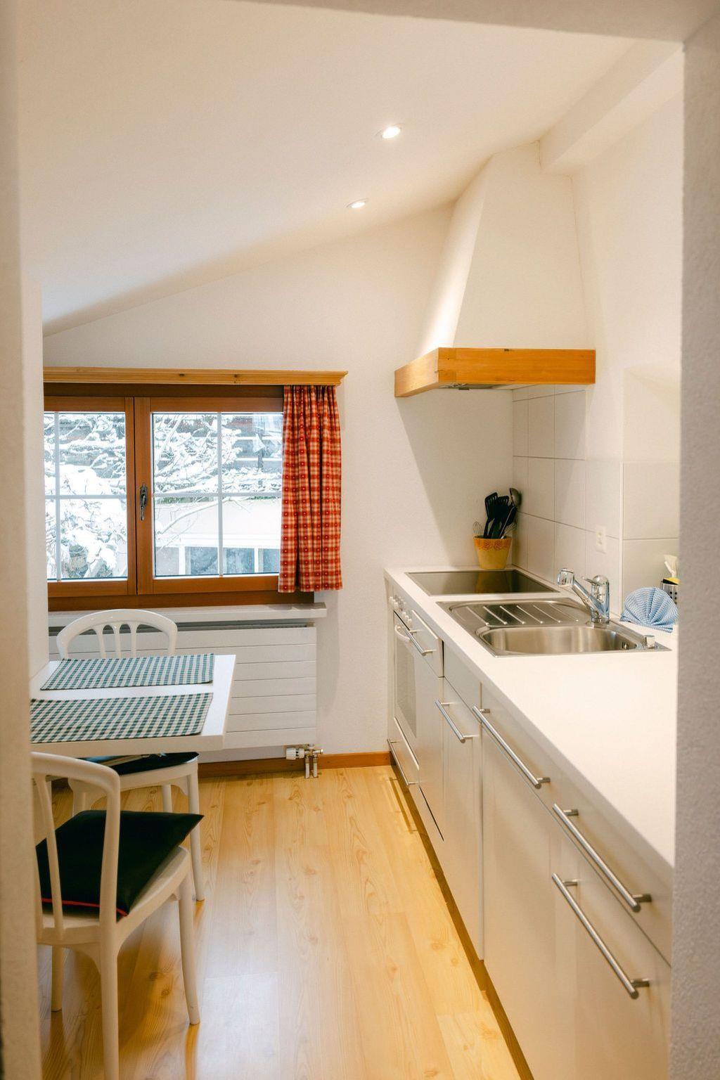 Küche ist modern weiss gekachelt, kleiner Tisch, mit 2 Stühlen, Kochherd mit Backofen und Dampfabzug, Geschirrwaschmaschine, Kapseln-Kaffeemaschine, Wasserkocher, Kühlschrank mit Gefrierfach (Kühlzelle ebenfalls für Gäste vorhanden), Backofen und Mikrowelle.