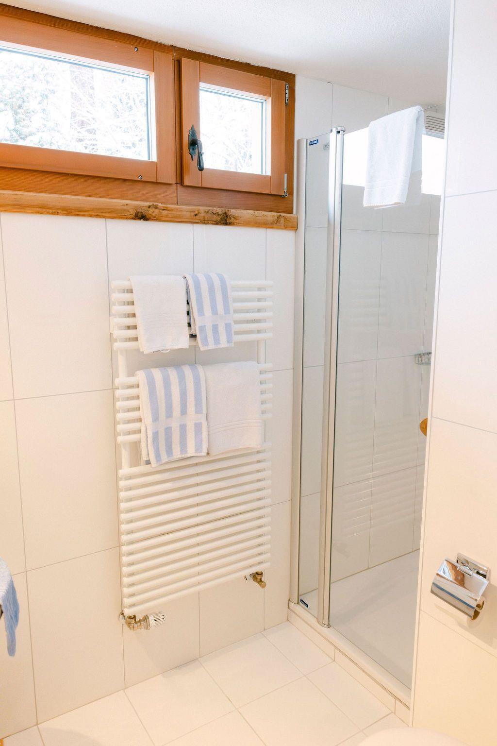 Nasszelle ebenfalls modern weiss gekachelt mit Fenster, Dusche 90/90 cm, WC und einem Waschbecken.