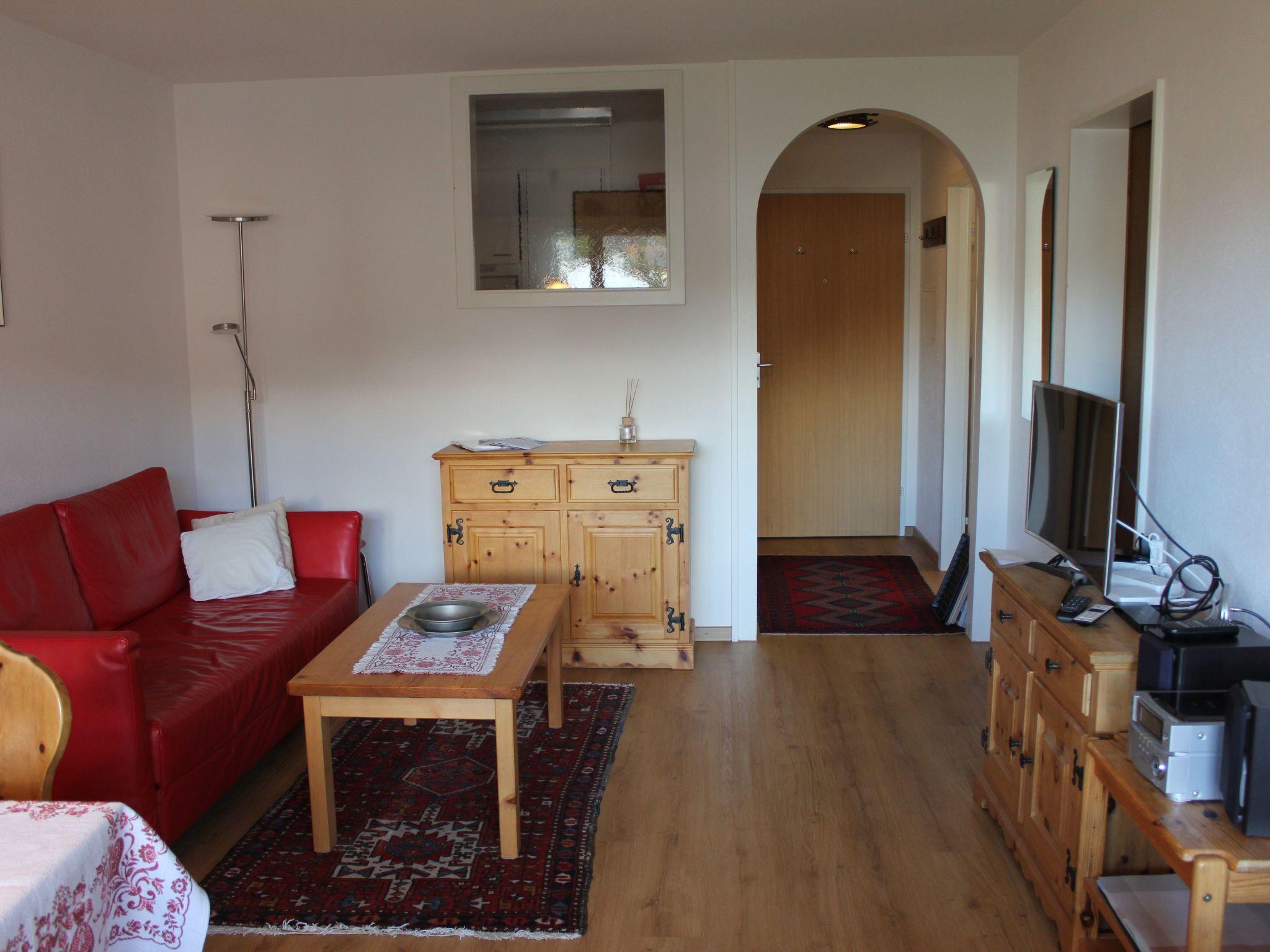 Innen empfängt Sie ein gemütlich eingerichtetes Wohnzimmer mit Arveneckbank, einer Sitzgruppe, Esstisch mit Stühlen und Arvenmöbeln, perfekt ergänzt durch modernen Komfort wie TV und Wireless-LAN. Das Schlafzimmer mit Doppelbett und Einbauschränken bietet direkten Zugang zum südwärts ausgerichteten, sonnigen Balkon. Eine voll ausgestattete Küche mit Kühlschrank, kleinem Gefrierfach, Backofen, Geschirrspüler sowie Geschirr, Gläser, Besteck und Pfannen erwartet Sie. Für die kulinarische Abwechslung sorgen ein Fondueset und ein Raclette-Ofen, ideal für gemütliche Abende zu zweit.