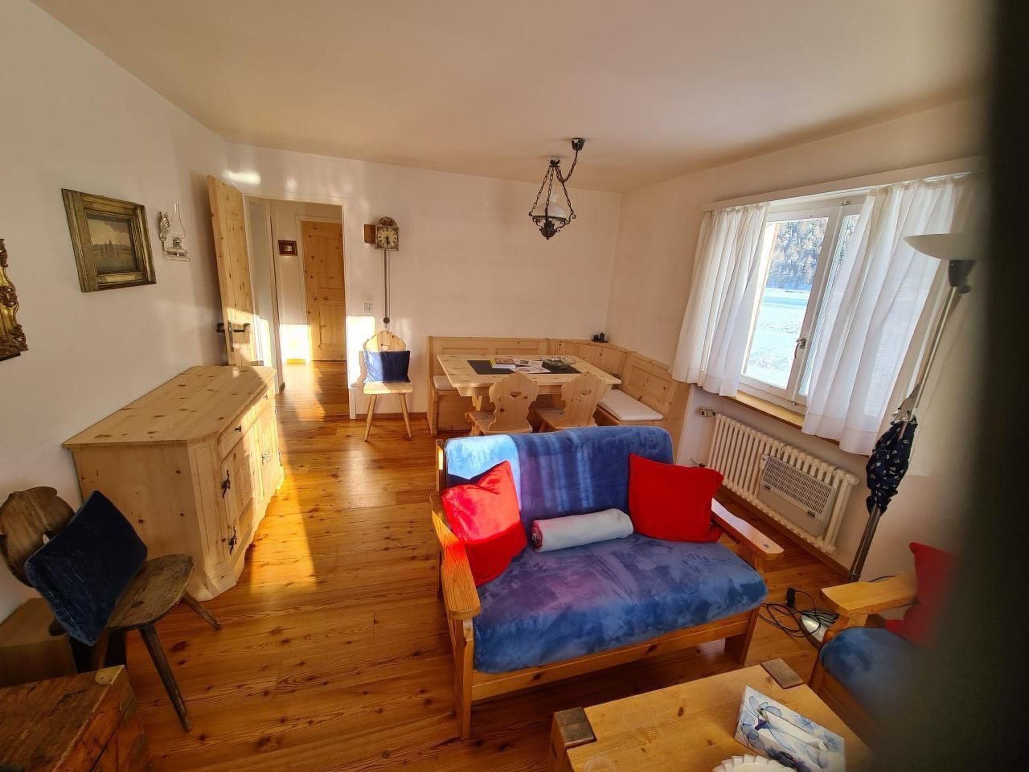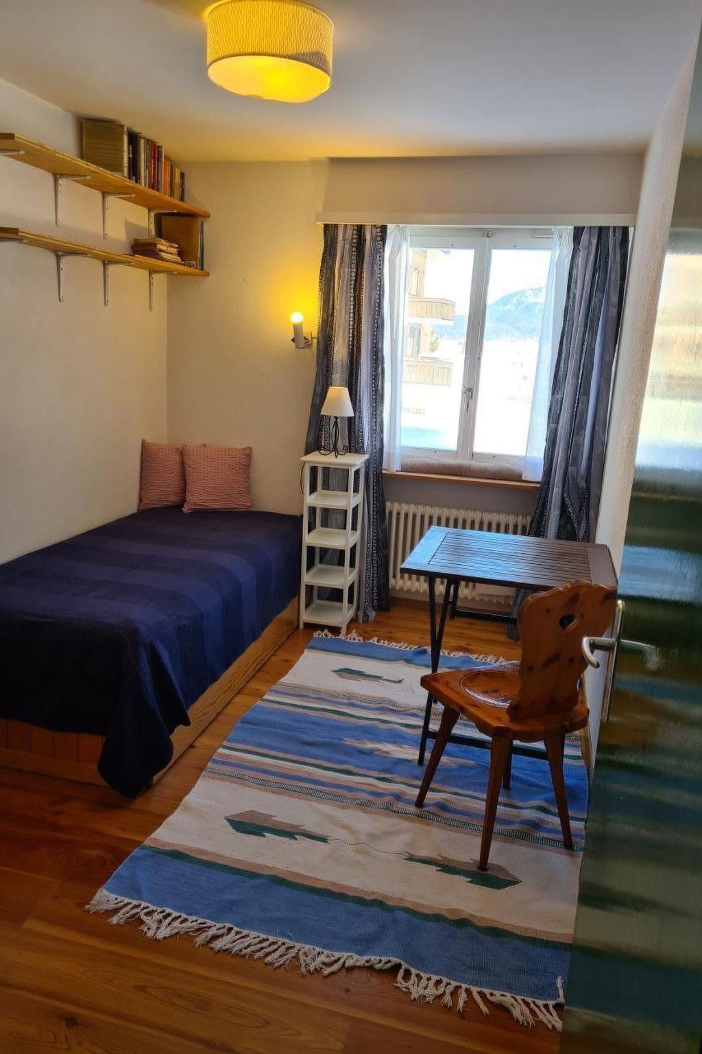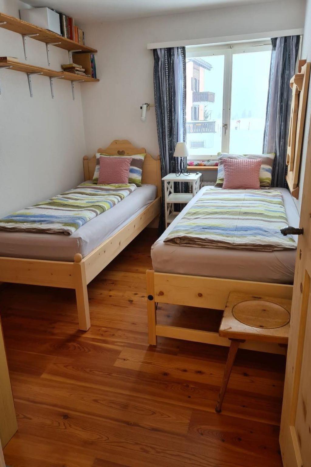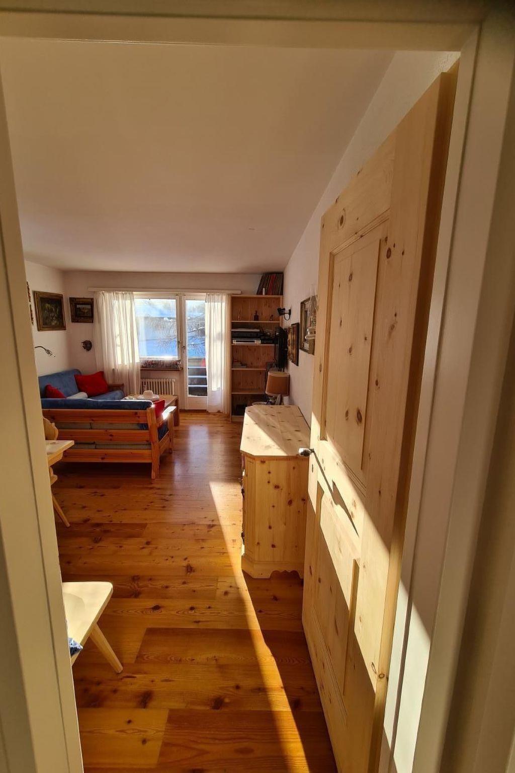 Diese 3-Zimmer-Wohnung mit 70 m2 befindet sich im 1. Stock, zweckmässig und rustikal eingerichtet: Wohn-/Esszimmer mit Essecke, zwei 2er Sofas und TV und Internet Ausgang zum Balkon, Richtung Süden. 1 Zimmer mit 1 Bett und 1 Ausziehbett. 1 Doppelzimmer (Boxspringbett 180x200). Kleine Küche (Backofen, Geschirrspüler, Kapsel Kaffeemaschine ( Matello), mit Ausgang zum kleinen Balkon. Bad/WC. Heizung. Parkettböden. 2 kleine Balkone. Terrassenmöbel. Sehr schöne Fernsicht auf die Berge, das Tal und die Skipiste. Garage. Die Wohnung bist den ganzen Tag besonnt. Geeignet für Familien. Maximal 1 Haustier/Hund erlaubt. Langlaufpisten vor dem Haus. Im Winter Gratis Skibus zur Furtschellasbahn und durs Dorf (Haltestelle ca.50m vor dem Haus). Der Volg Lebensmittelladen mit Fleisch Theke und frischen Brot ist in 5 Minuten erreichbar.