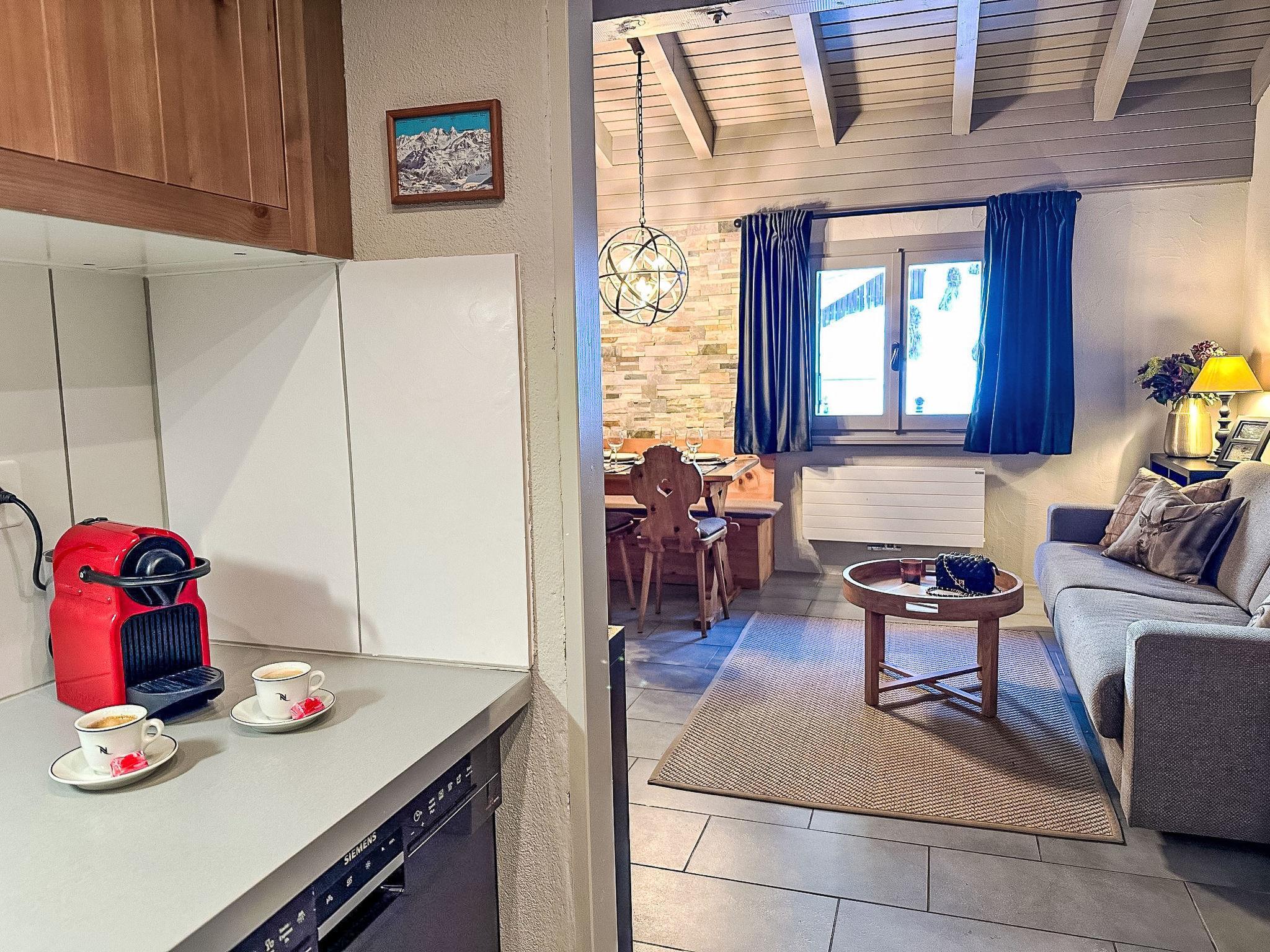 "Residenza Chesa Margun 24-1", 1-Zimmer-Wohnung 34 m2 auf 2 Stockwerken, Nordlage. Renoviert im Jahre 2024, komfortabel und schön eingerichtet: Wohn-/Esszimmer mit 1 Doppeldiwanbett (170 cm, Länge 200 cm), Essecke, Kabel-TV, Flachbildschirm und Radio. Küche im Eingang (4 Kochplatten, Backofen, Geschirrspüler, 4 Glaskeramikplatten, elektrische Kaffeemaschine, Kapseln für die Kaffeemaschine (Nespresso) extra). Dusche/WC. Obergeschoss: abgeschrägte, offene Galerie mit Dachfenster mit 2 Betten (80 cm, Länge 200 cm). Zur Verfügung: Internet (WLAN, gratis). Bitte beachten: geeignet für Familien Wohnung auf Hofseite. Nichtraucher-Unterkunft. Anstelle eines abgeschlossenen Schlafzimmers befinden sich manche Schlafplätze in einem offenen Bereich (Galerie, Nische etc.).