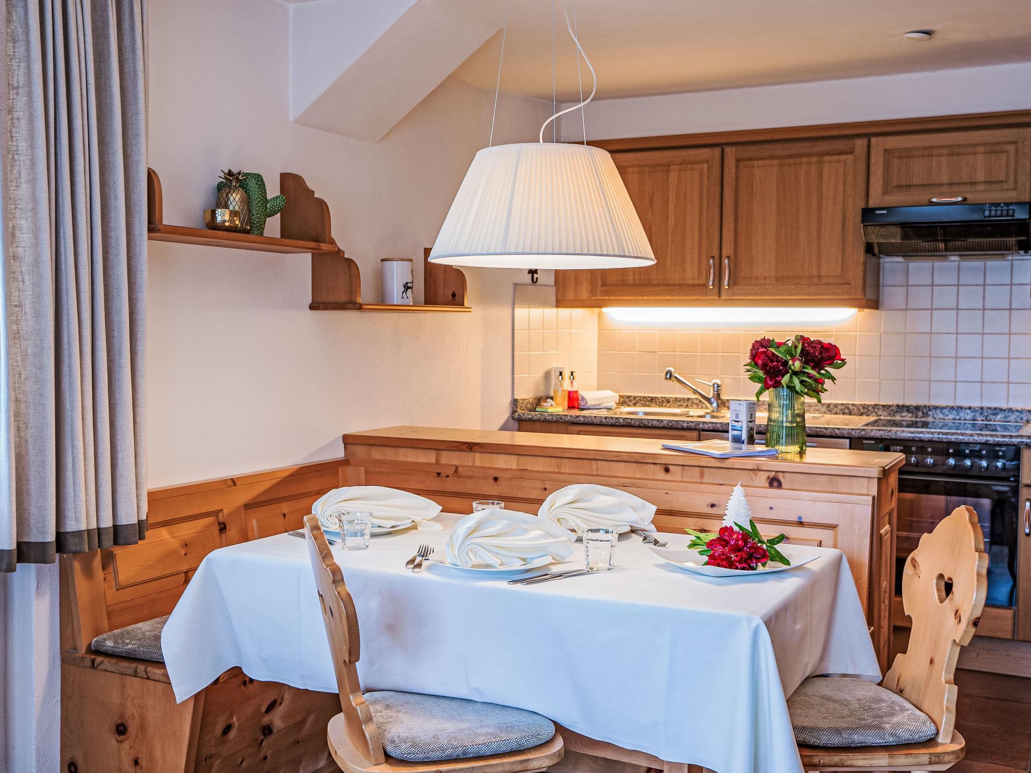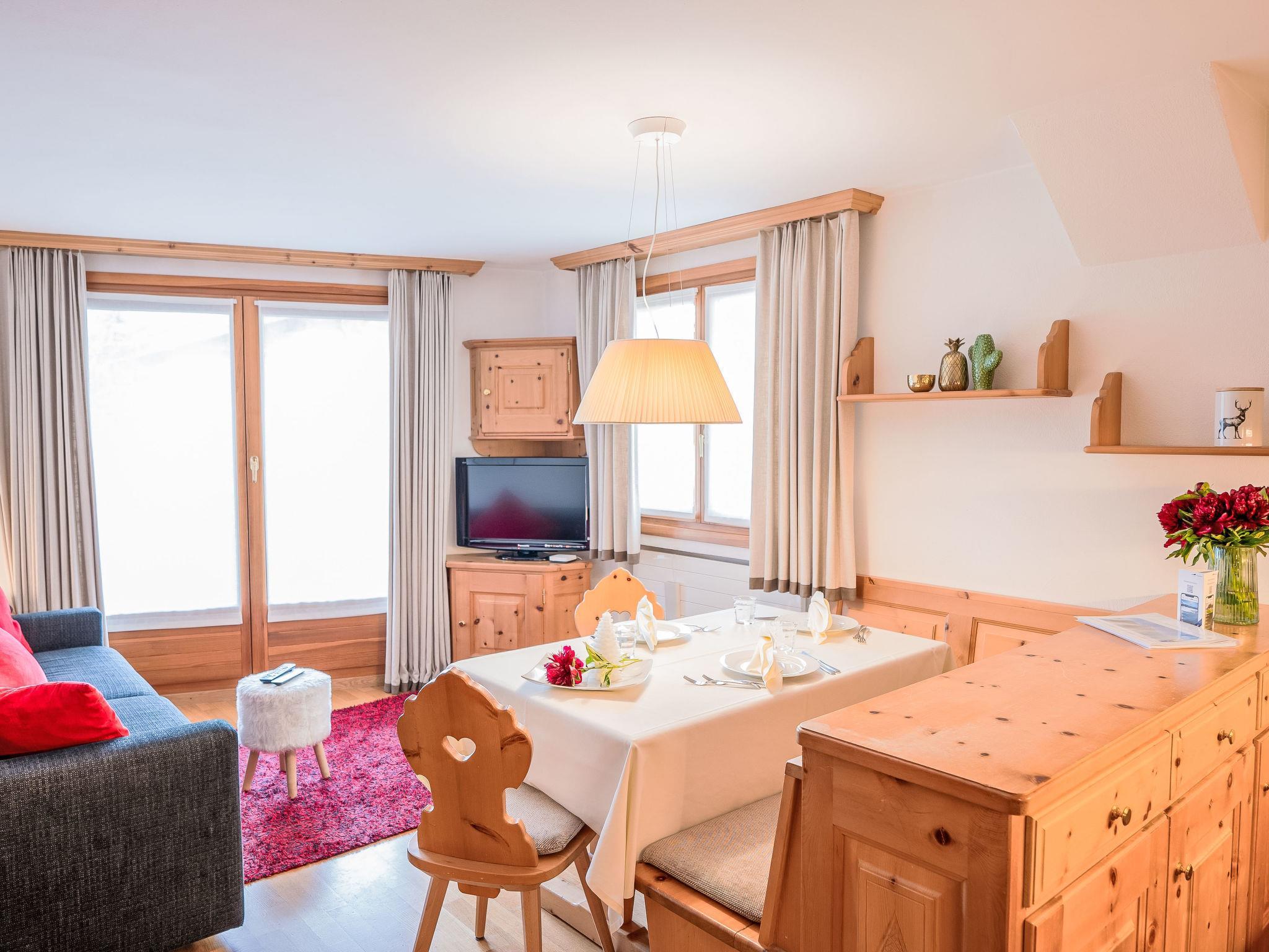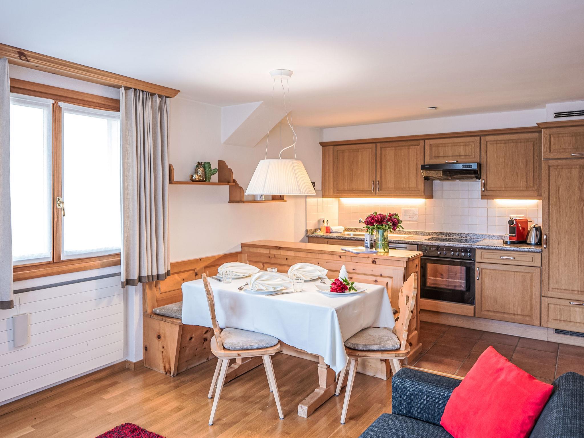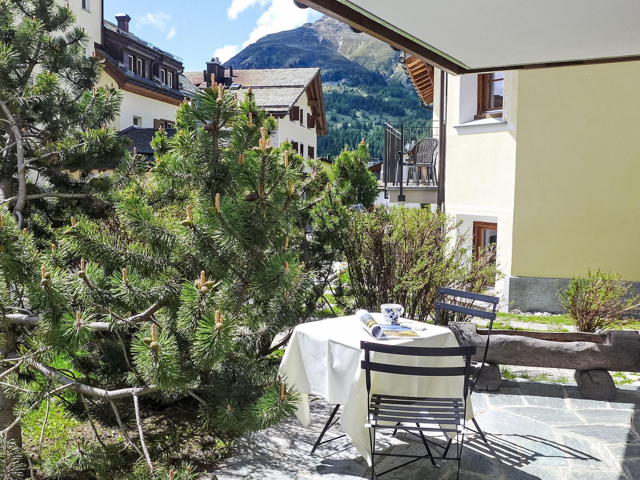 "Chesa Vadret Surlej", 2-Zimmer-Wohnung 57 m2, im Erdgeschoss. Teilweise renoviert im Jahre 2016, gemütlich eingerichtet: offenes Wohn-/Esszimmer mit 1 Diwanbett (160 cm, Länge 200 cm), TV (Flachbildschirm). Ausgang zur Terrasse. 1 Zimmer mit 1 Doppelbett (1 x 170 cm, Länge 200 cm). Offene Küche (Geschirrspüler, 4 Glaskeramikplatten, Toaster, Wasserkocher, elektrische Kaffeemaschine, Kapseln für die Kaffeemaschine (Nespresso) extra, Fondue Set (Chinoise)). Dusche/Bidet/WC. Heizung. Kleine Terrasse. Terrassenmöbel. Sicht auf die Berge und die Ortschaft. Zur Verfügung: Haartrockner. Internet (Wireless LAN, gratis). Garage Nr. 26 auf dem Grundstück, Höhe 205 cm, Breite 290 cm. Bitte beachten: Nichtraucher-Unterkunft.