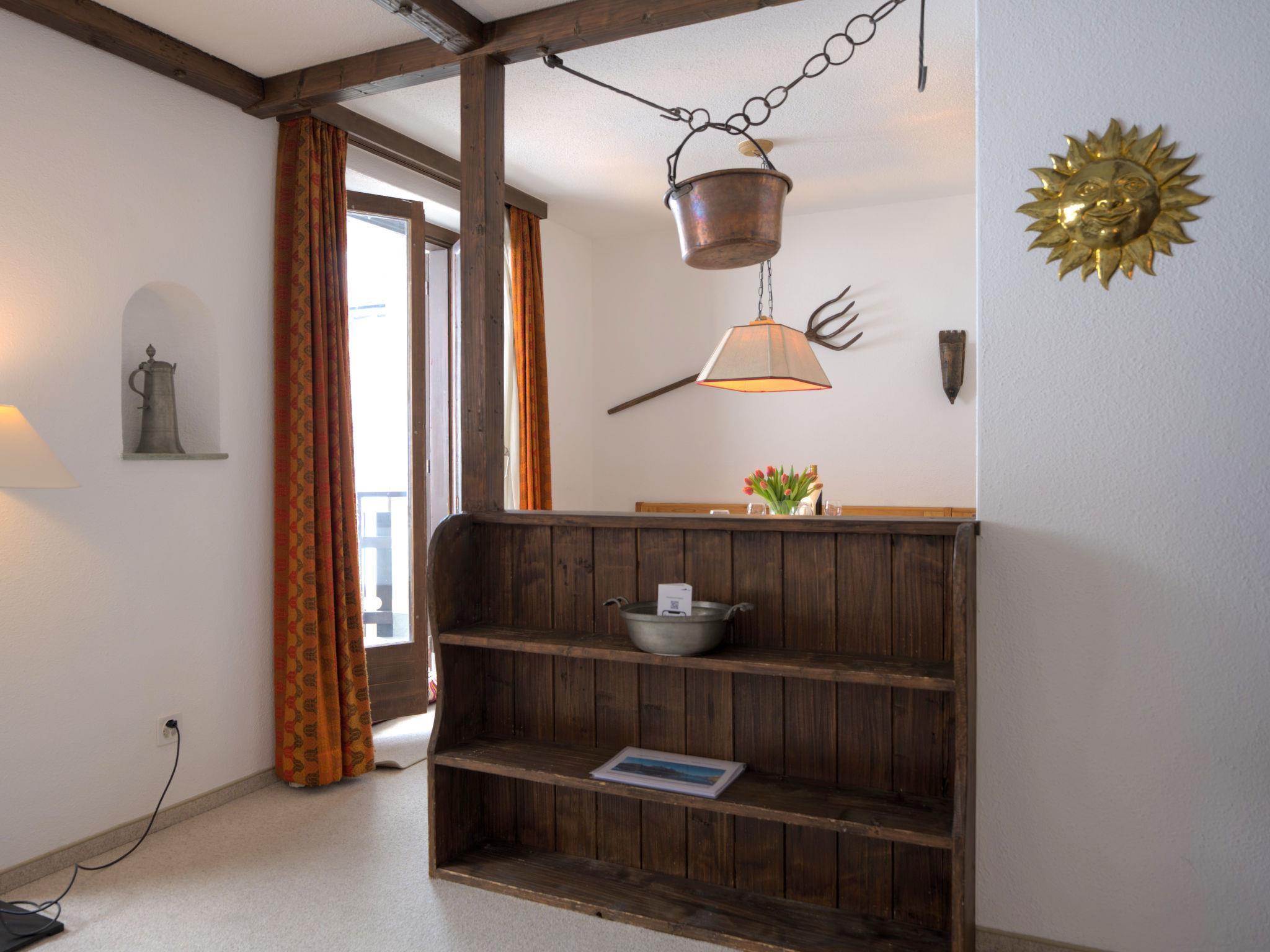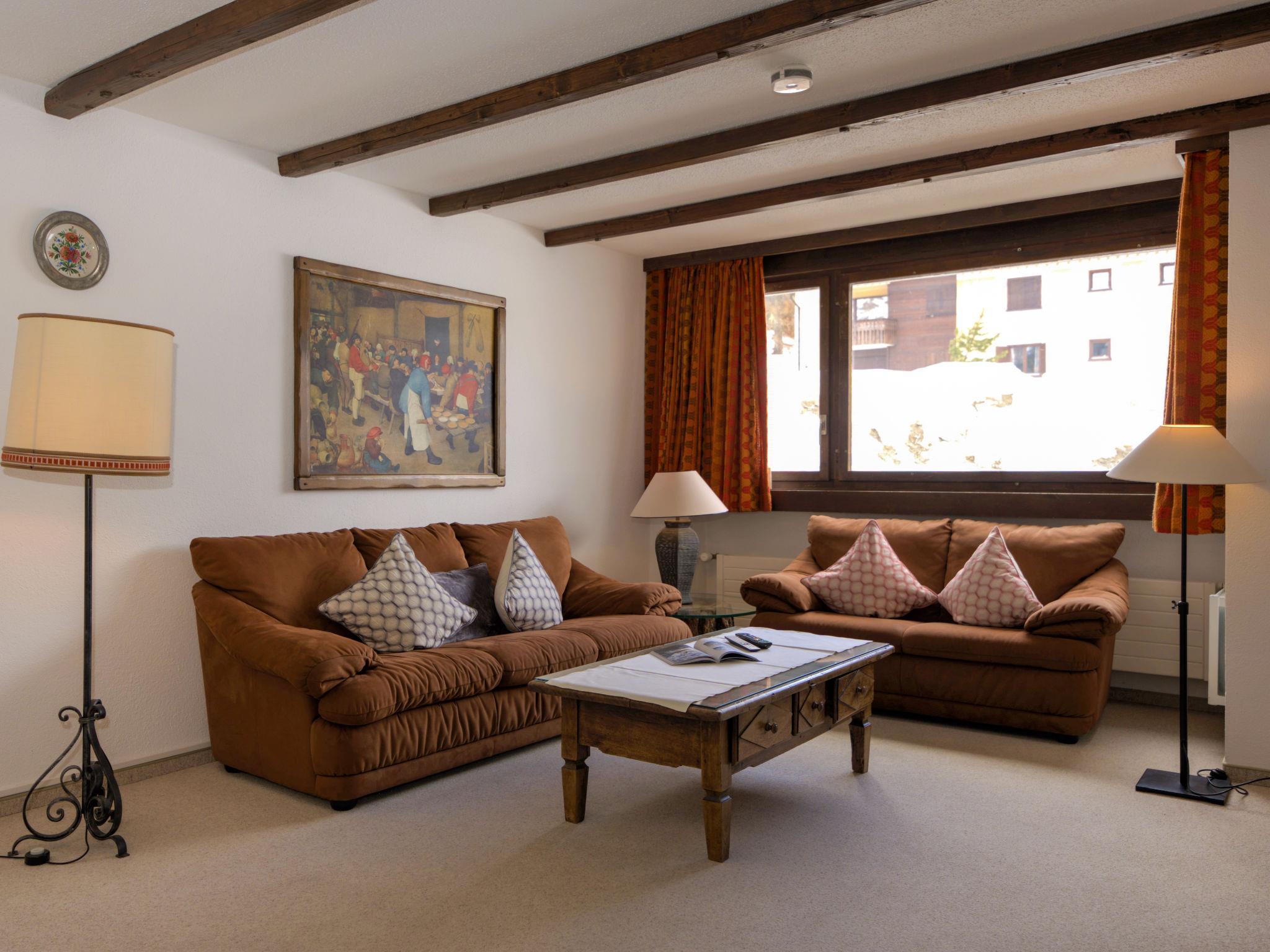 "Chesa Linaria", 3-Zimmer-Wohnung 70 m2, im erhöhten Erdgeschoss. Einfach eingerichtet: Wohnzimmer mit Essecke und TV (Flachbildschirm). Ausgang zum Balkon, Richtung Süden. 1 Zimmer mit 1 Doppelbett (2 x 90 cm, Länge 185 cm). 1 kleines Zimmer mit 2 Betten (90 cm, Länge 190 cm). Küche (Backofen, Geschirrspüler, Toaster, Wasserkocher, elektrische Kaffeemaschine, Kapseln für die Kaffeemaschine (Nespresso) extra, Racletteofen, Fondue Set (Chinoise)) mit Durchreiche. Bad/WC, Dusche/Bidet/WC. Heizung. Kleiner Balkon. Terrassenmöbel. Schöne Sicht auf die Berge. Zur Verfügung: Bügeleisen, Haartrockner. Internet (Wireless LAN, gratis). Garage Nr. 9 (small!), Höhe 205 cm, Breite 190 cm. Maximal 1 Haustier/Hund erlaubt. 756.8668.2733.01