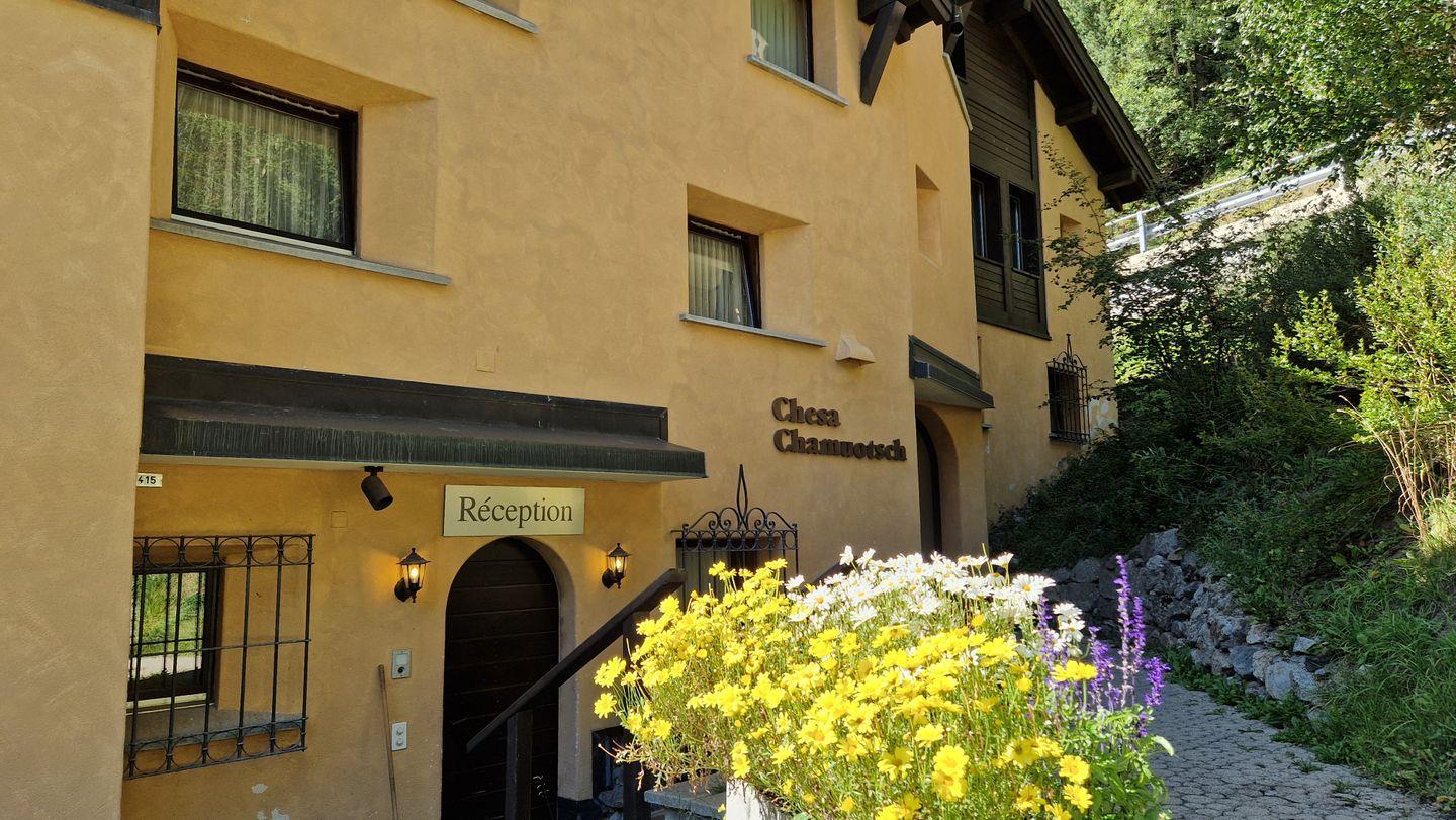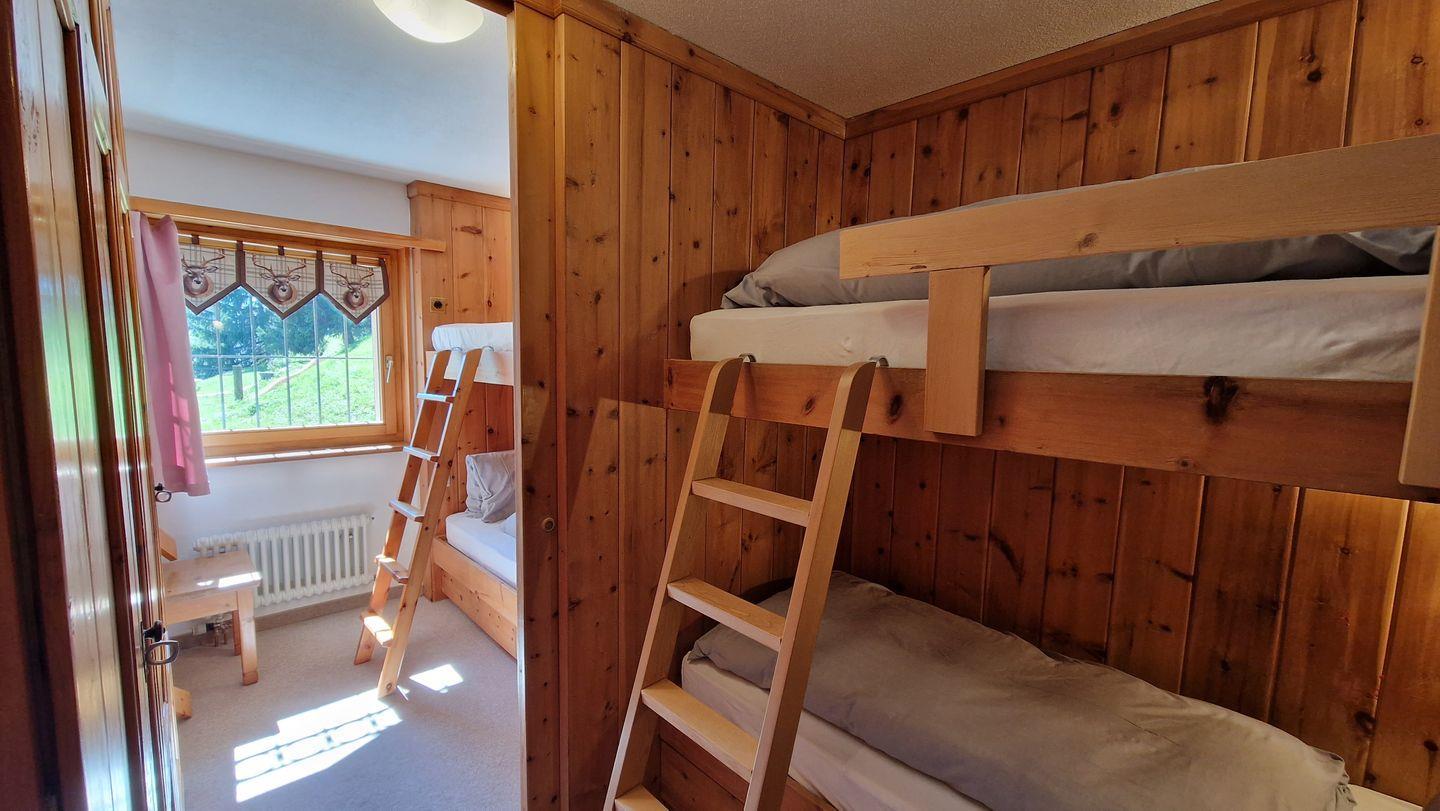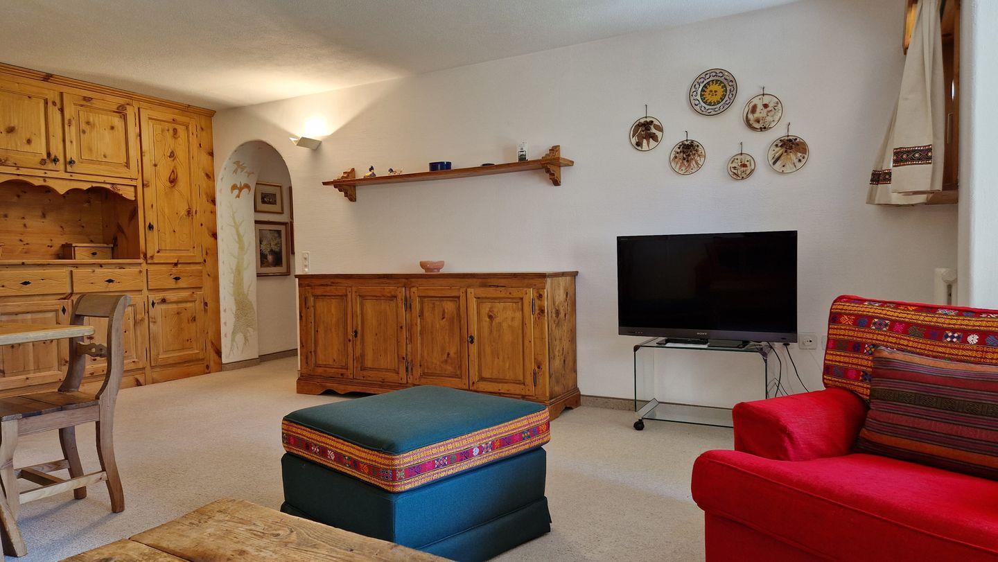3 1/2-Zimmerwohnung im Haus Chamuotsch, Parterre, 95 m2. Die nach Süden ausgerichtete Terrasse mit direktem Zugang zum Spielplatz und Grillstelle offenbart eine wunderbare Berg- und Seesicht. Die Wohnung bietet ein geräumiges, offenes Wohn-/Esszimmer mit Fernseher, ein Arvenholz-Schlafzimmer mit Doppelbett, ein 4er Schlafzimmer mit zwei Kajüten-Betten, ein Bad/WC und ein separates WC; eine Küche mit Backkofen, Geschirrspüler, Nespresso-Kaffeemaschine und Wasserkocher.