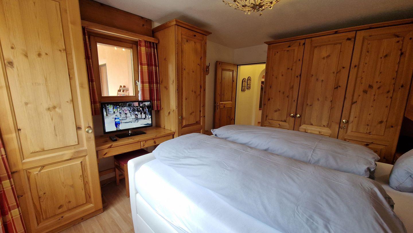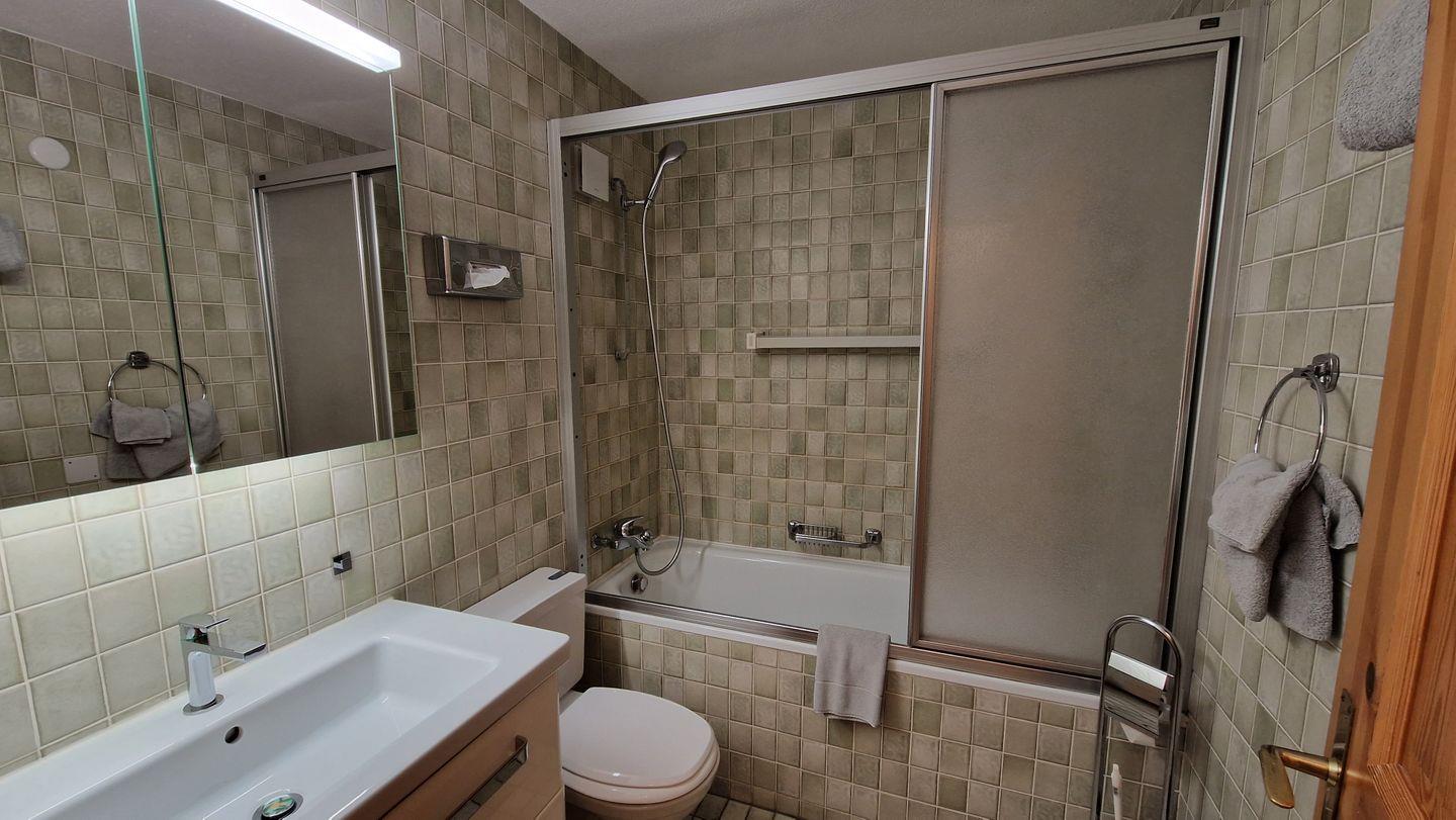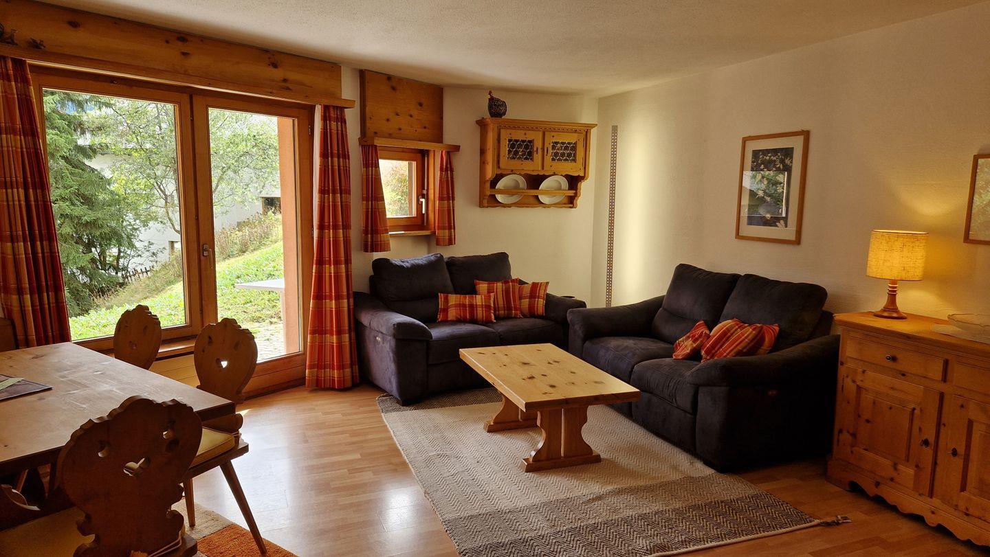 2 1/2-Zimmerwohnung im Haus Leivra, Parterre, 75 m2. Die nach Süden ausgerichtete Wohnung verfügt über ein grosszügiges Wohn-/Esszimmer mit zwei Schrankbetten (90x200) und Fernseher, ein helles Schlafzimmer mit Boxspring-Bett (180 x 200), ein neues Bad mit Dusche/WC und eine Küche mit Backofen, Geschirrspüler, Nesspresso-Kapselmaschine und Wasserkocher. Die gedeckte Terrasse ist nach Süden ausgerichtet und bietet eine schöne Aussicht in die Berge.