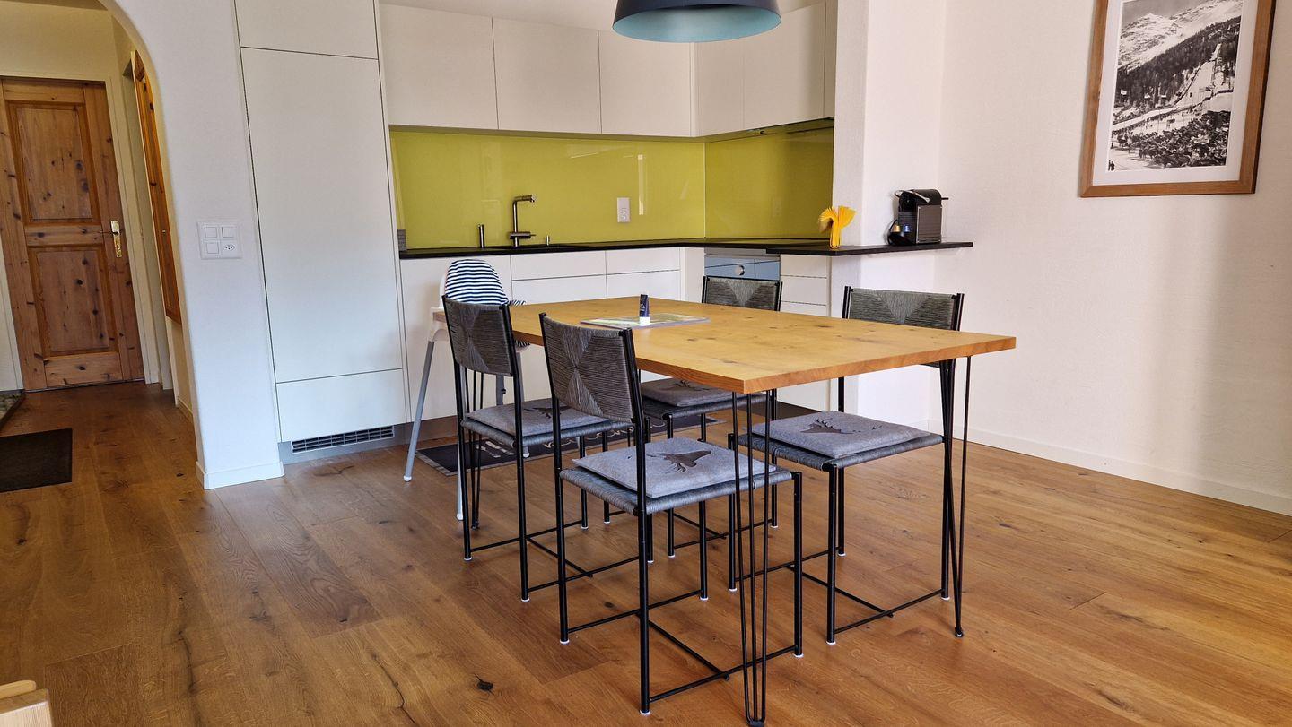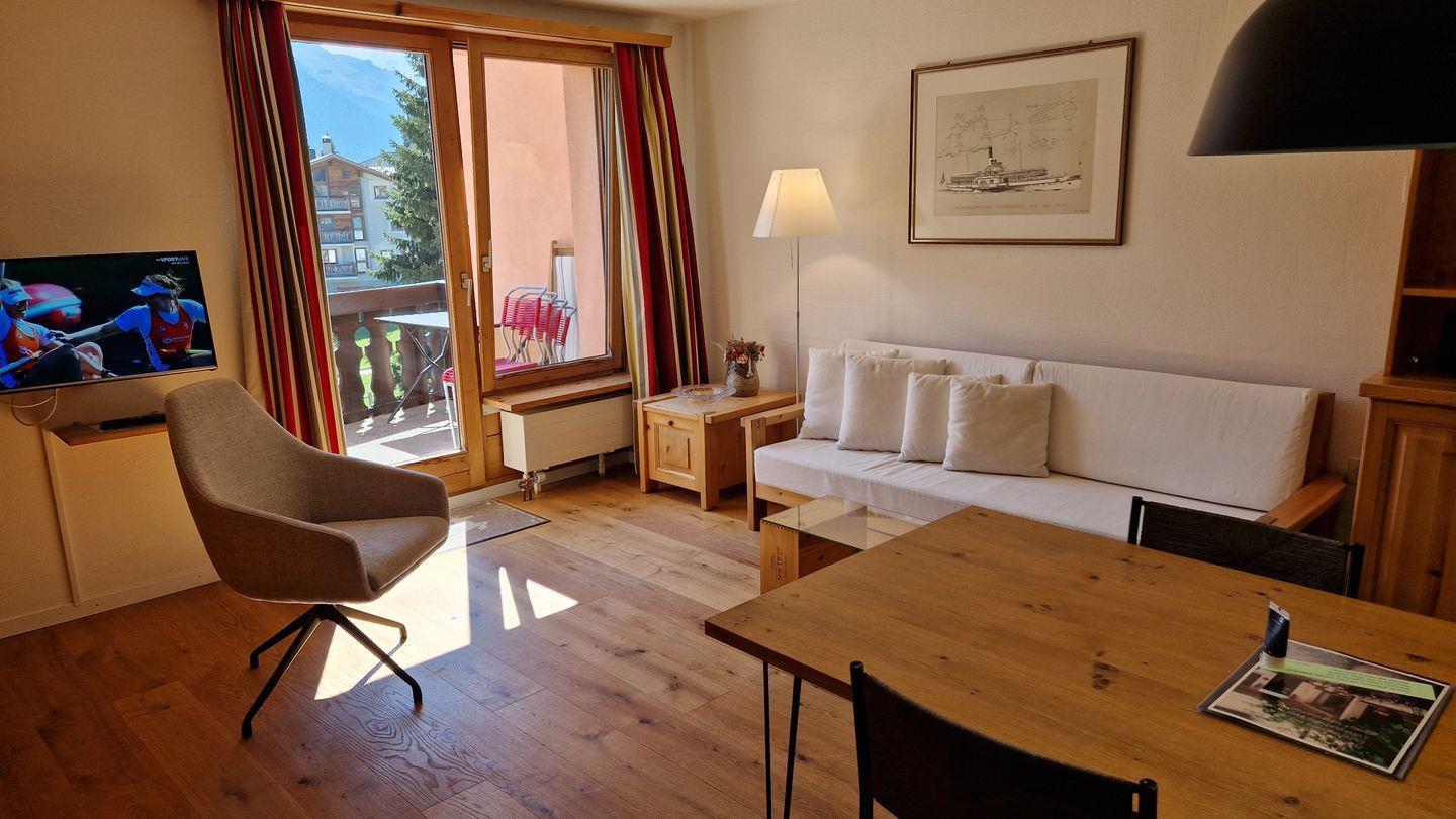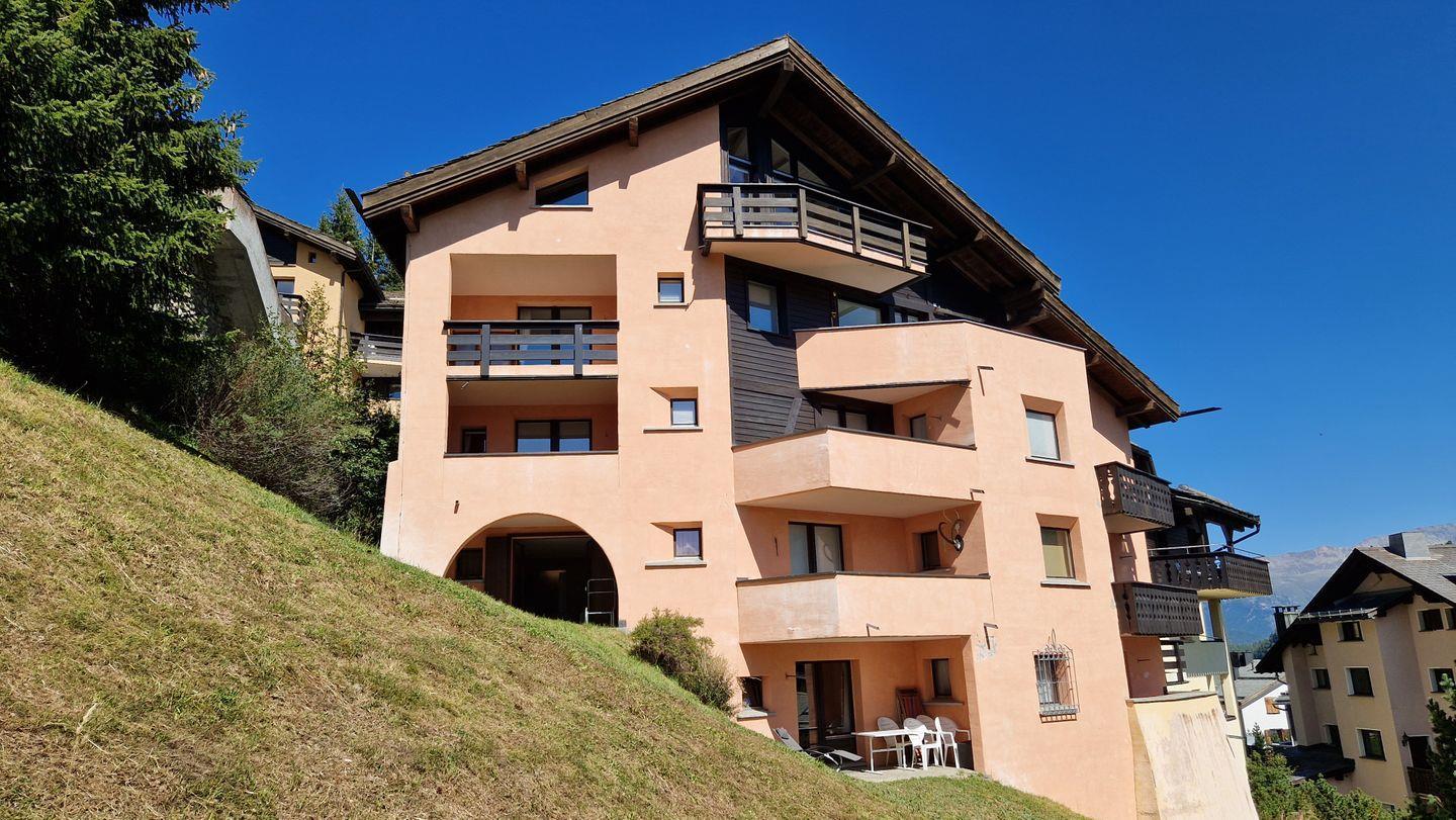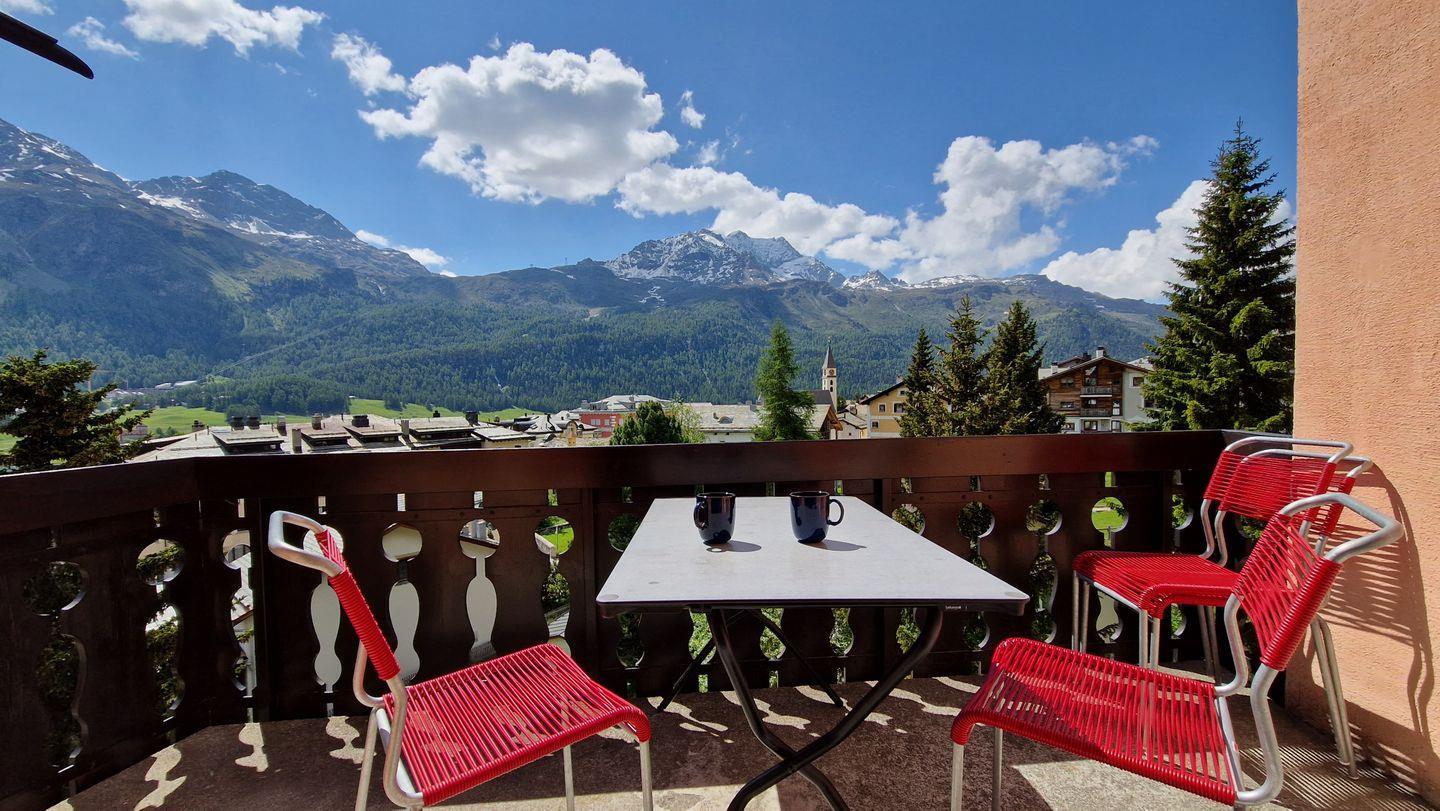 2 1/2-Zimmerwohnung im Haus Leivra, im 3. Stock, 70 m2. Die helle Wohnung verfügt über ein gemütliches Wohn-/Esszimmer mit zwei Schrankbetten (90x200) und Fernseher, ein Schlafzimmer mit Doppelbett, ein modernes Bad mit Dusche/WC und eine offene Küche mit Backofen, Geschirrspüler, Nesspresso-Kapselmaschine, Toaster und Wasserkocher. Der sonnige Balkon ist nach Süden ausgerichtet und bietet eine prächtige Aussicht in die Berge und auf den Lej Suot.