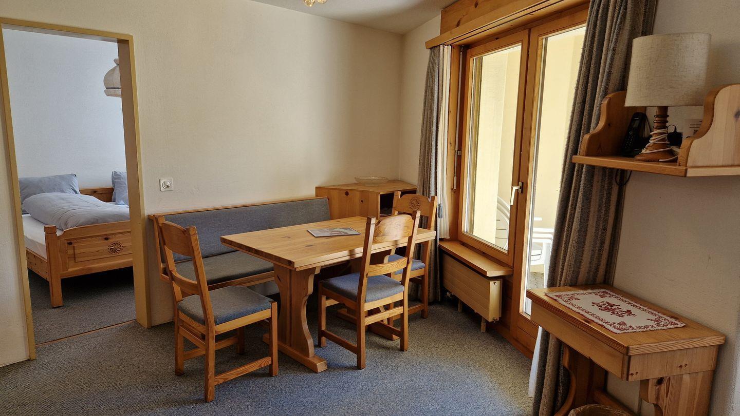 2 1/2-Zimmerwohnung im Haus la Vuolp, Parterre, 75 m2. Die nach Süden ausgerichtete Wohnung verfügt über ein grosszügiges Wohn-/Esszimmer mit zwei Schrankbetten (90x200) und Fernseher, ein helles Schlafzimmer mit Doppelbett, ein Bad/WC und eine Küche mit Backofen, Geschirrspüler, Nesspresso-Kapselmaschine und Wasserkocher. Die kleine, gedeckte Terrasse ist von einer grünen Hecke umgeben. Nichtraucherwohnung.