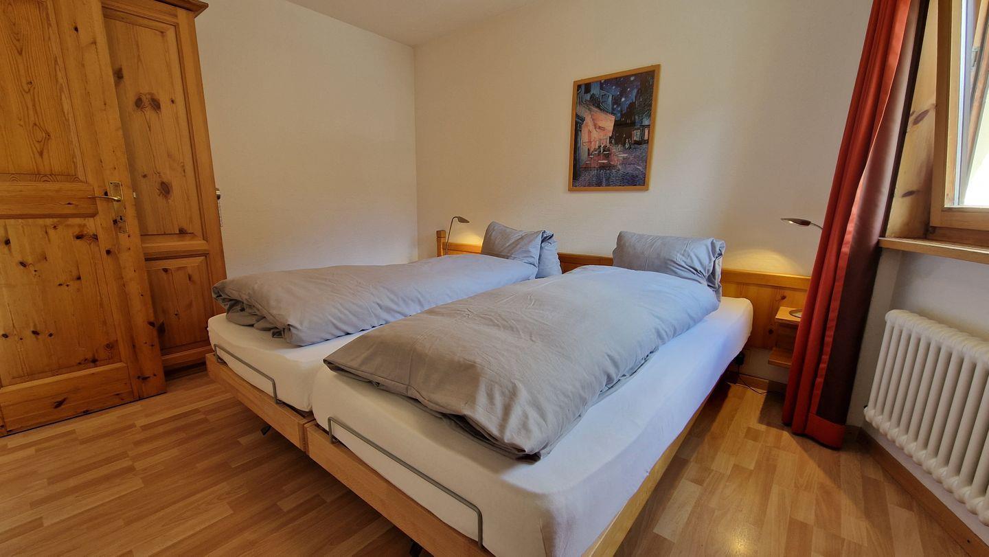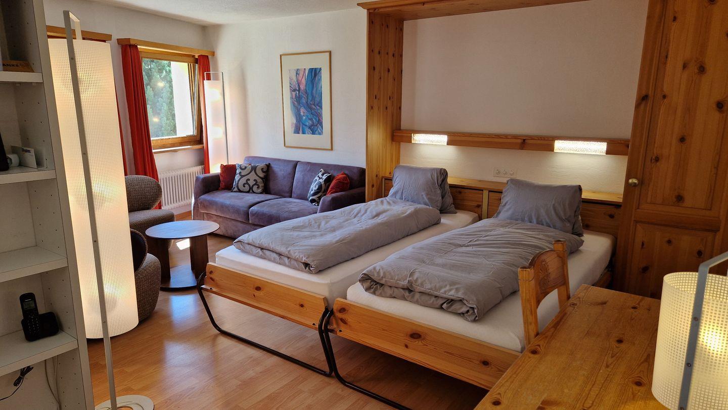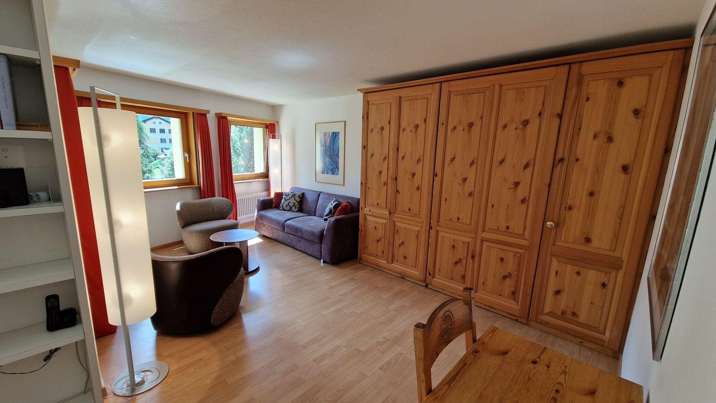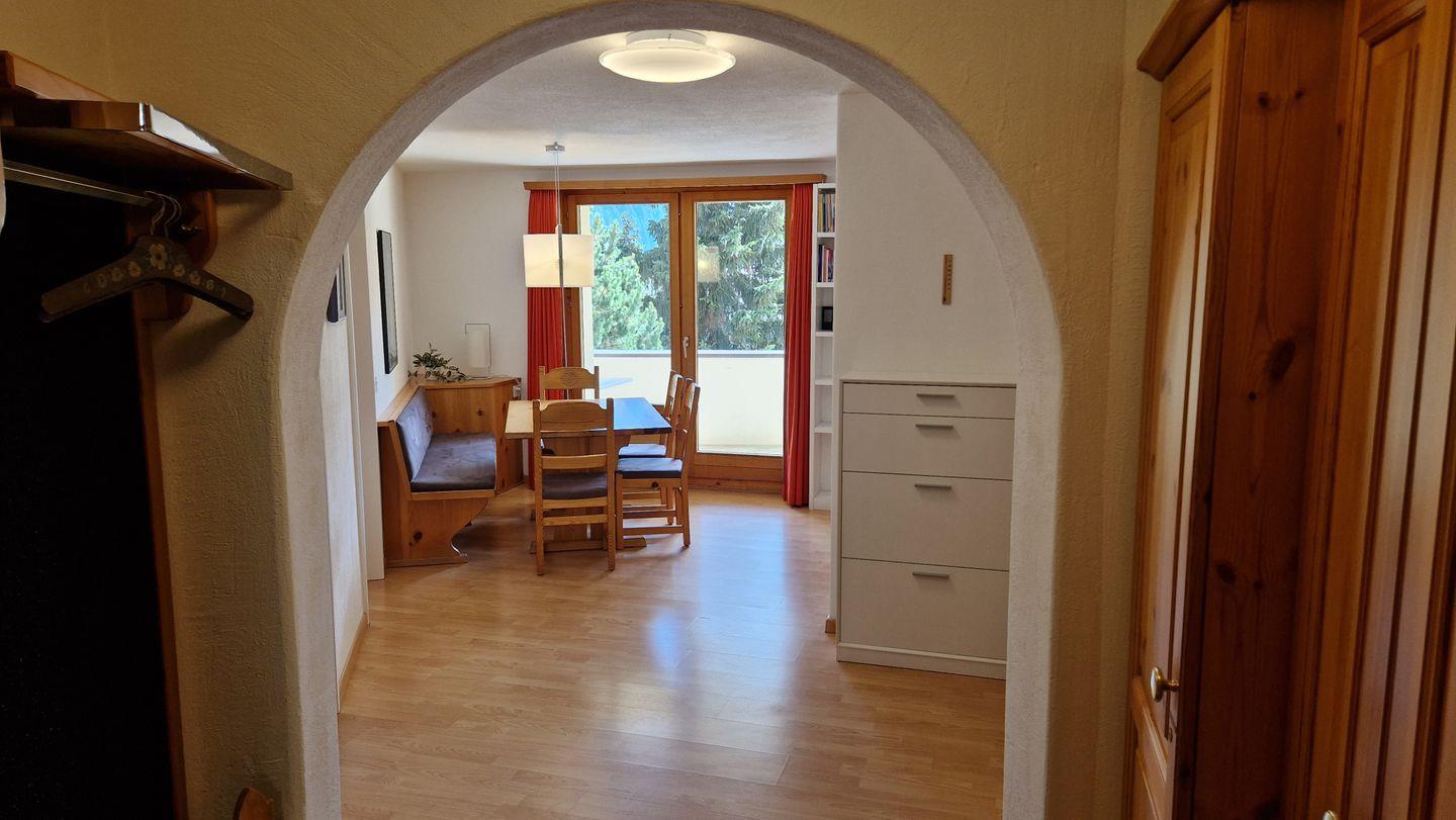 2 1/2-Zimmerwohnung im Haus la Vuolp, 1. Stock, 77 m2. Die nach Süden ausgelegte Wohnung verfügt über ein gemütliches und geräumiges Wohn-/Esszimmer mit zwei Schrankbetten (90x200) und grossem Fernseher, ein helles Schlafzimmer mit Doppelbett, ein Bad/WC, eine gut ausgestattete Küche mit Backofen, Geschirrspüler, Nesspresso-Kapselmaschine, Toaster und Wasserkocher und einen gedeckter, ruhigen Balkon. Nichtraucherwohnung.