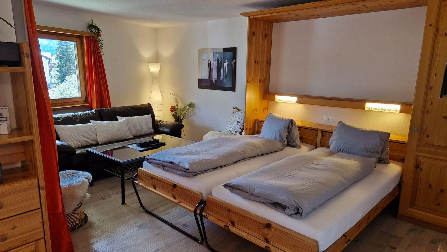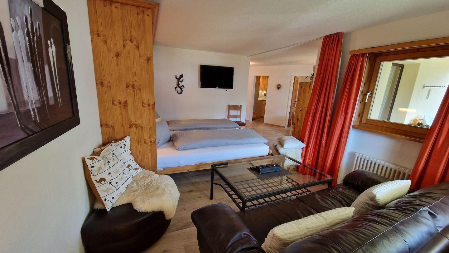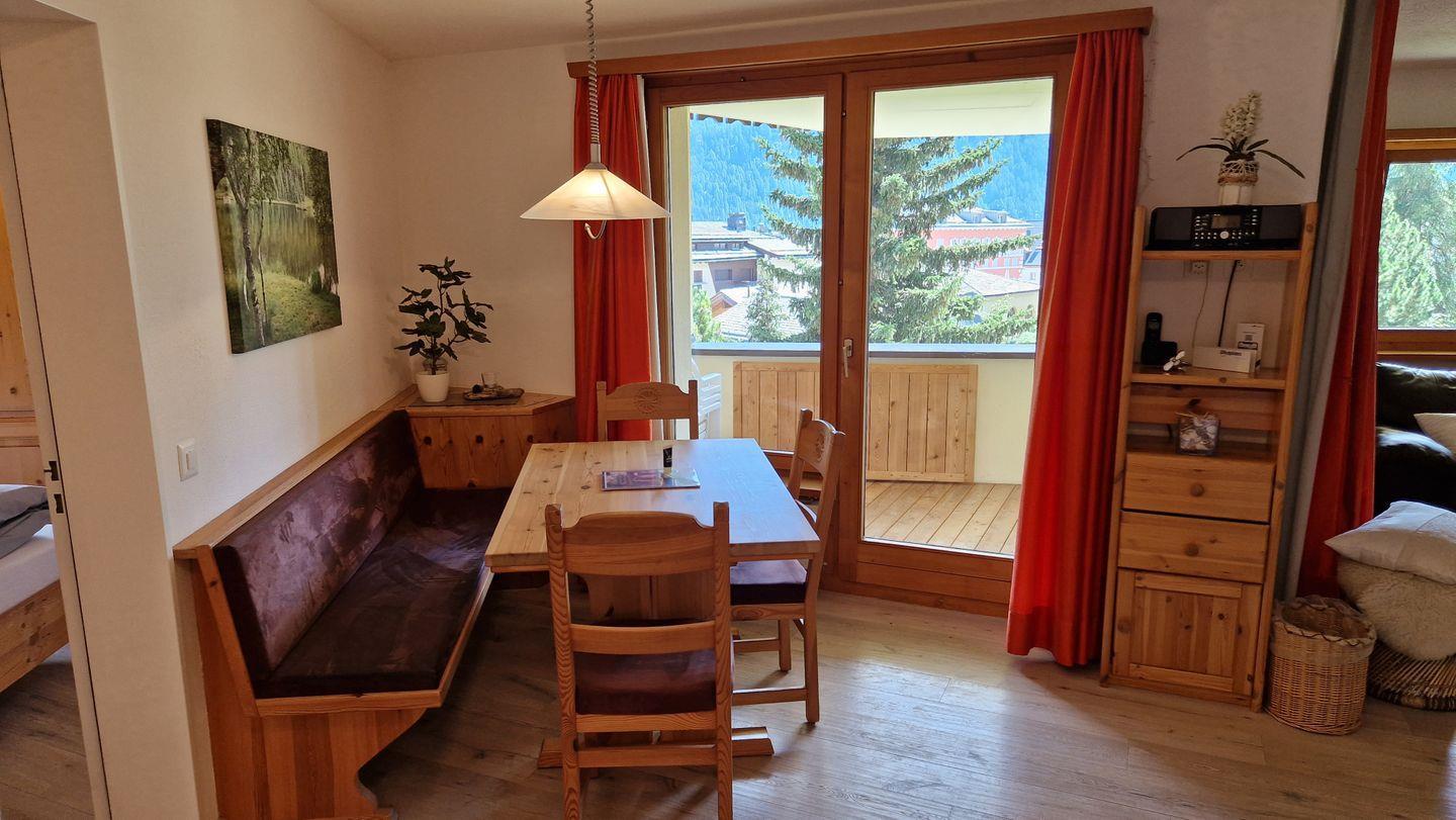 2 1/2-Zimmerwohnung im Haus la Vuolp, 2. Stock, 73 m2. Die nach Süden ausgelegte Wohnung verfügt über ein gemütliches und geräumiges Wohn-/Esszimmer mit zwei Schrankbetten (90x200) und einem grossen Fernseher, ein helles Schlafzimmer mit Doppelbett und Hochbett, ein Bad mit Dusche und WC, eine gut ausgestattete Küche mit Backofen, Geschirrspüler, Nesspresso-Kapselmaschine und Wasserkocher und ein gedeckter Balkon mit Bergsicht.