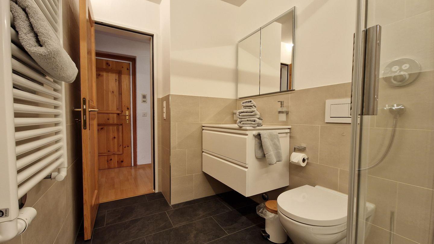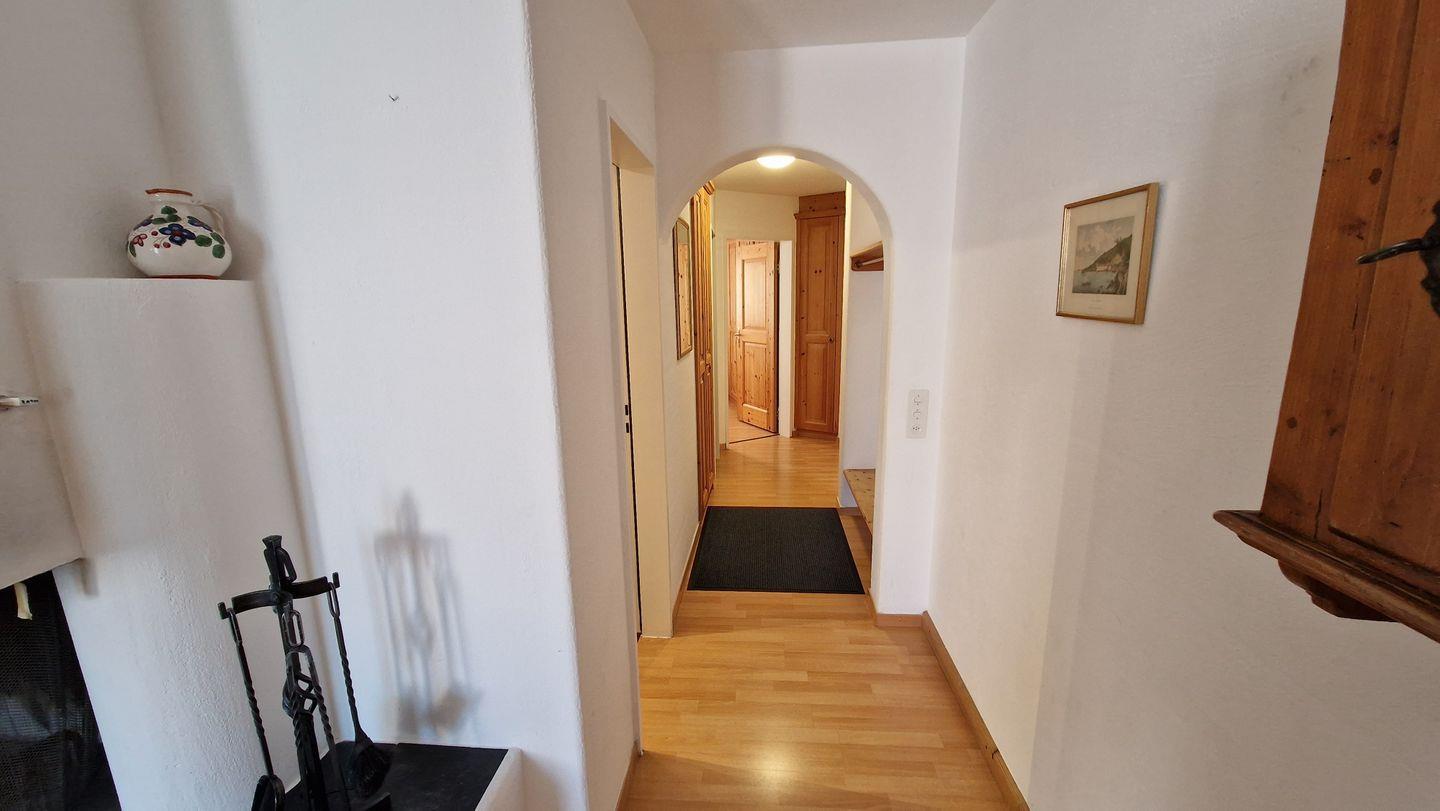 2-Zimmerwohnung, Haus la Vuolp, 3. Stock, 66 m2. Die Wohnung verfügt über ein gemütliches Wohn-/Esszimmer mit Cheminée und Fernseher, ein Schlafzimmer mit einem Doppelbett, ein Bad mit Regendusche und WC, eine moderne Küche mit Backofen, Geschirrspüler, Nesspresso-Kapselmaschine, Toaster und Wasserkocher. Der windgeschützte Balkon bietet einen prächtigen Ausblick in die Berge.