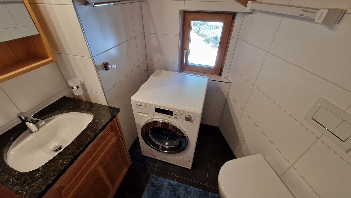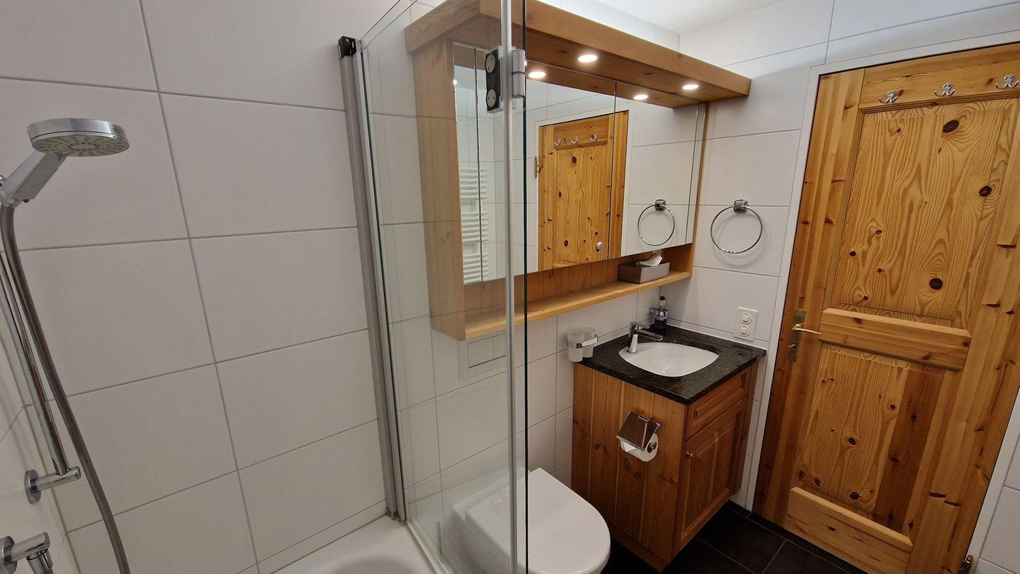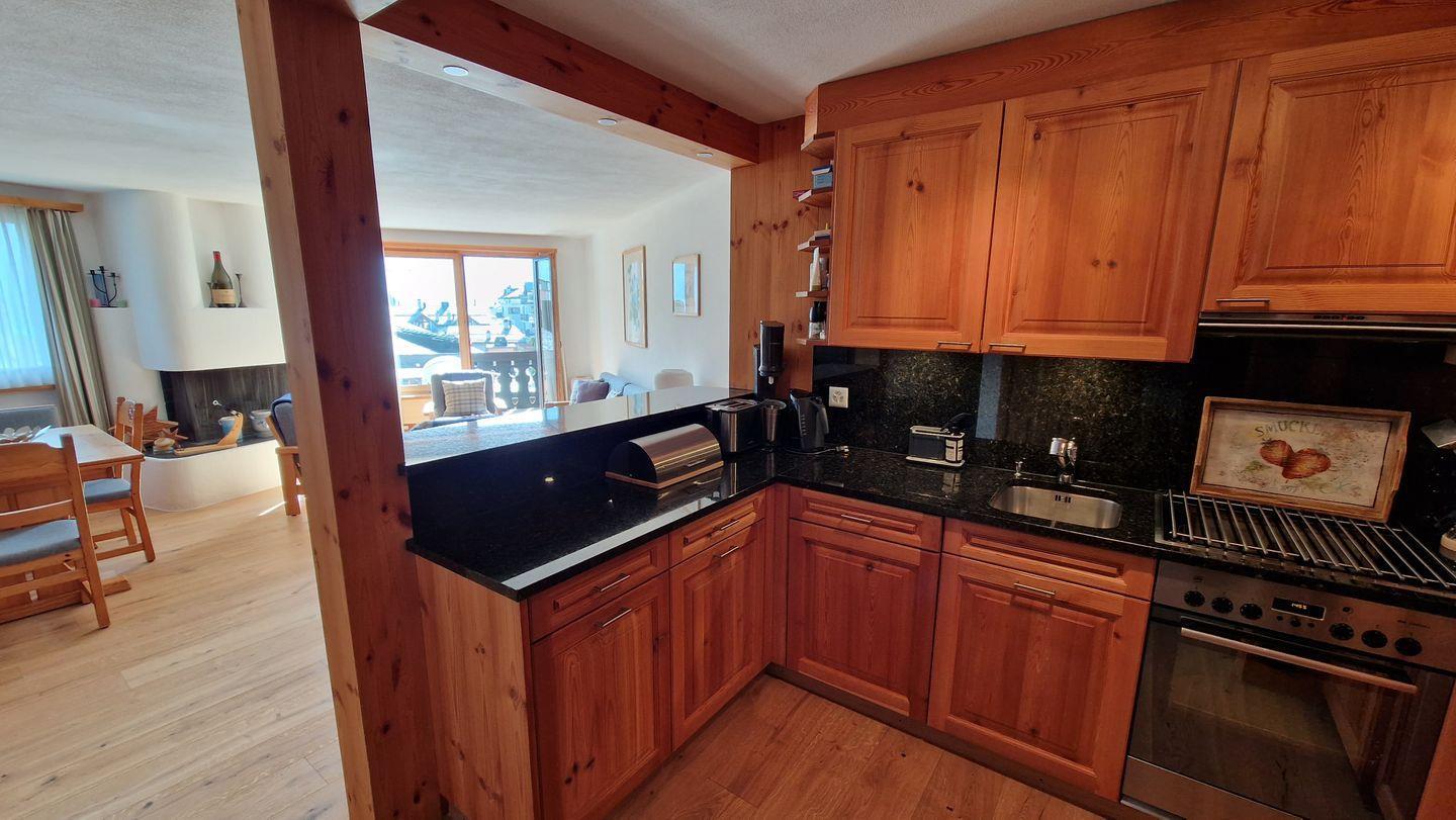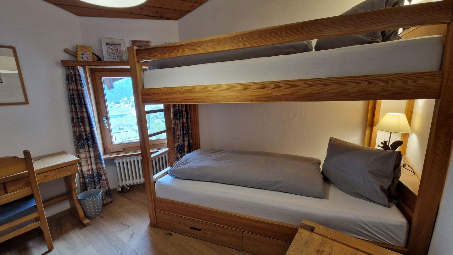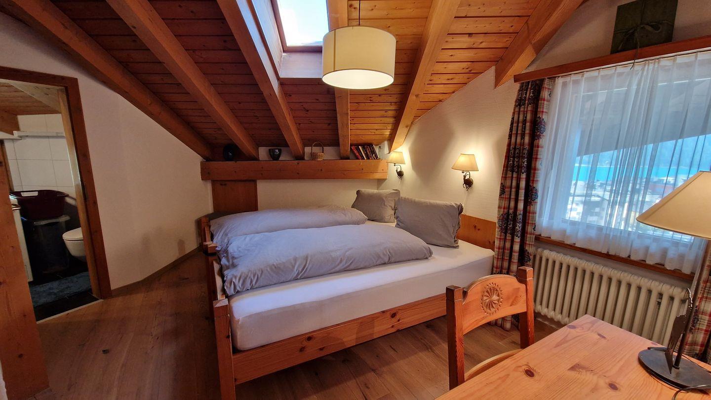 4 1/2-Zimmerwohnung im Haus Rizza, 4. Stock, 120 m2. Die Wohnung bietet ein gemütliches Wohn-/Esszimmer, ein Schlafzimmer mit Doppelbett, ein Schlafzimmer in der Dachschräge mit WC, ein Schlafzimmer mit Kajütenbett, ein Bad/WC mit Regendusche und eine offene Küche mit Backofen, Geschirrspüler, Nesspresso-Kapselmaschine, Toaster und Wasserkocher. Der nach Süden ausgerichtete Balkon offenbart eine prächtige Berg- und Seesicht. Nichtraucherwohnung.