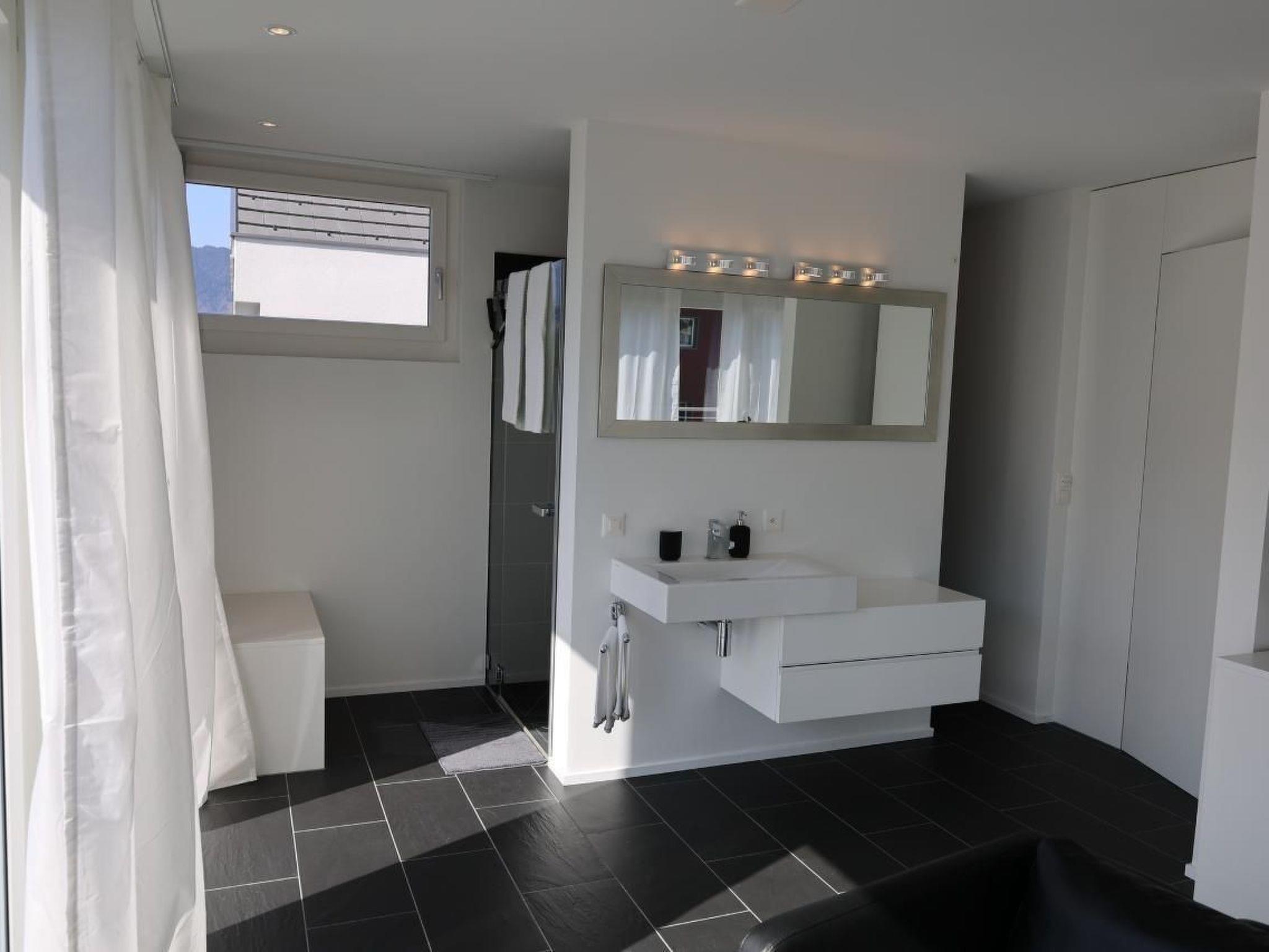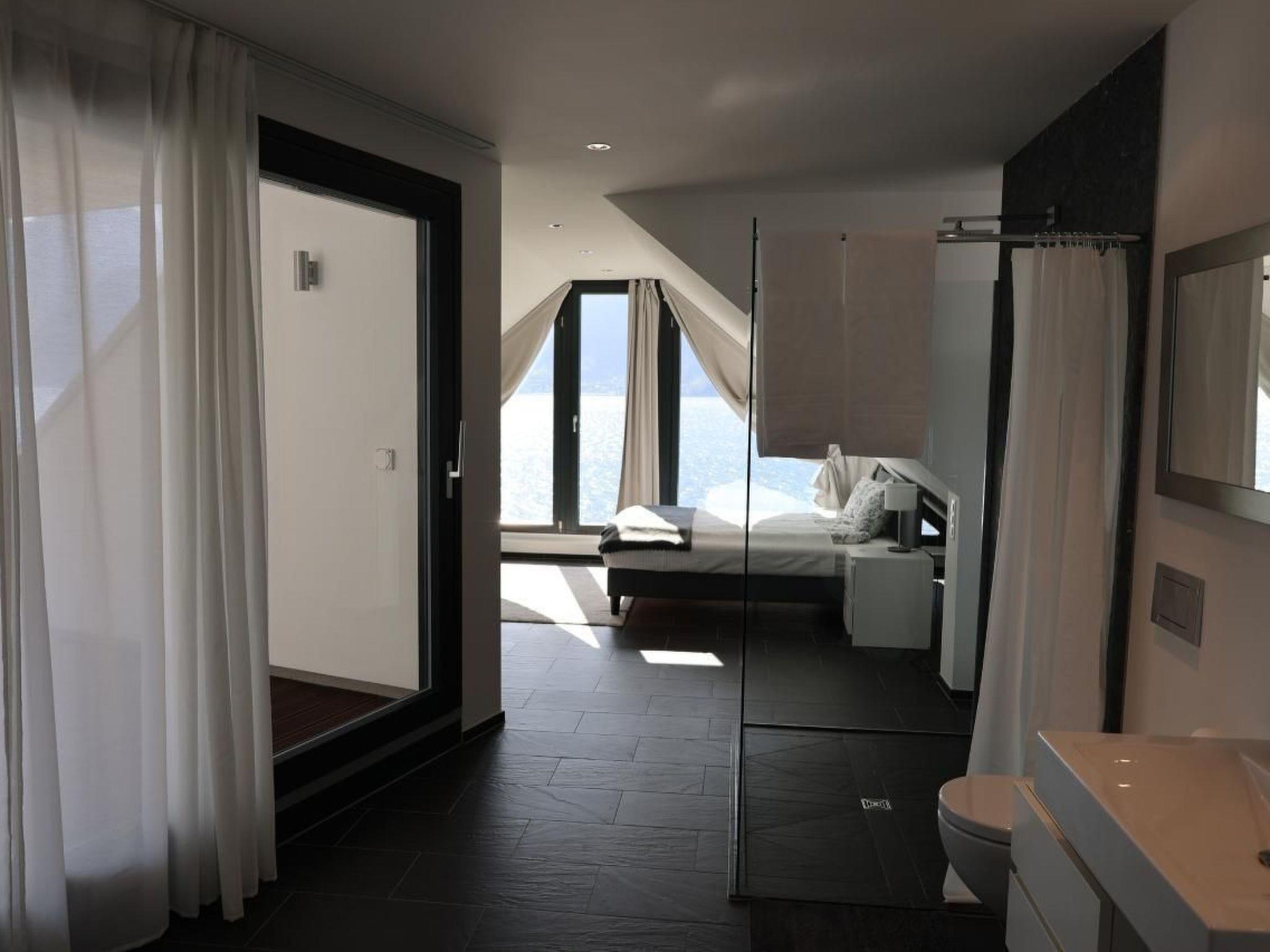grosszügiger Wohnraum mit Sonnenterrasse und Blick auf See und Berge