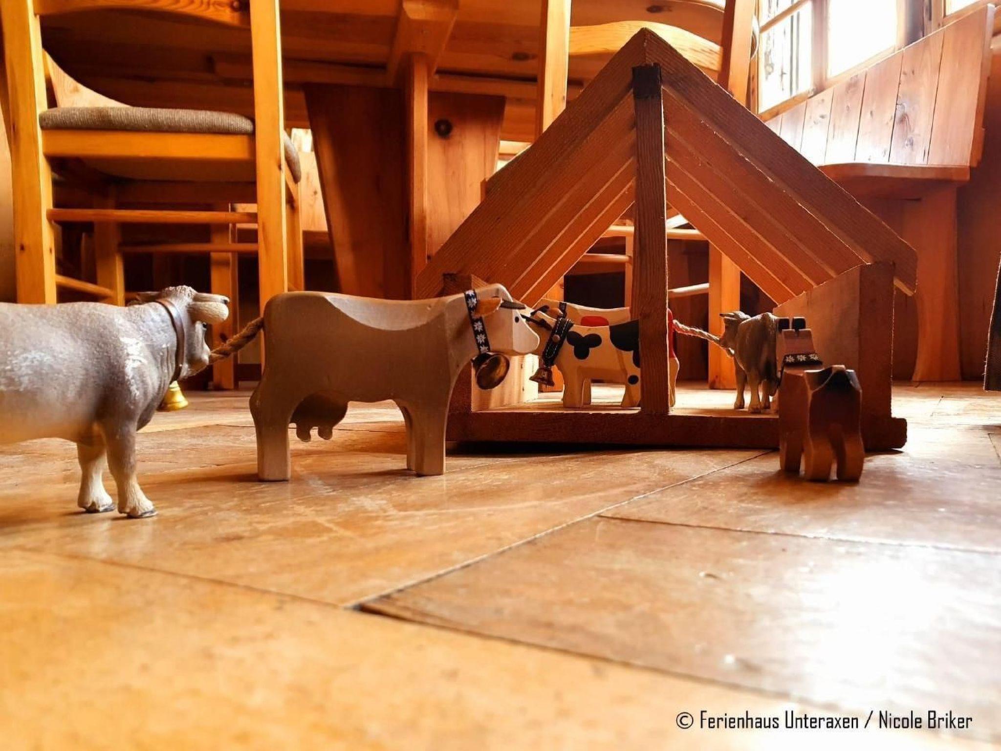 Auf dem Hof leben viele Tiere wie ein Hund, Katzen, Hühner, Kälber und Kühe. Im Sommer ab ca. Mitte Juni gehen die Kühe und Rinder auf die Alp. Die Kälber bleiben aber zu Hause und geniessen Streicheleinheiten unserer Gäste. Gerne gibt die Gastgeberfamilie Einblick in die Berglandwirtschaft. Im Frühling, Sommer und Herbst stehen einige Arbeiten auf dem Land und Garten an: Mähen, Heuen (auch Wildheuen), Zäunen, etc.