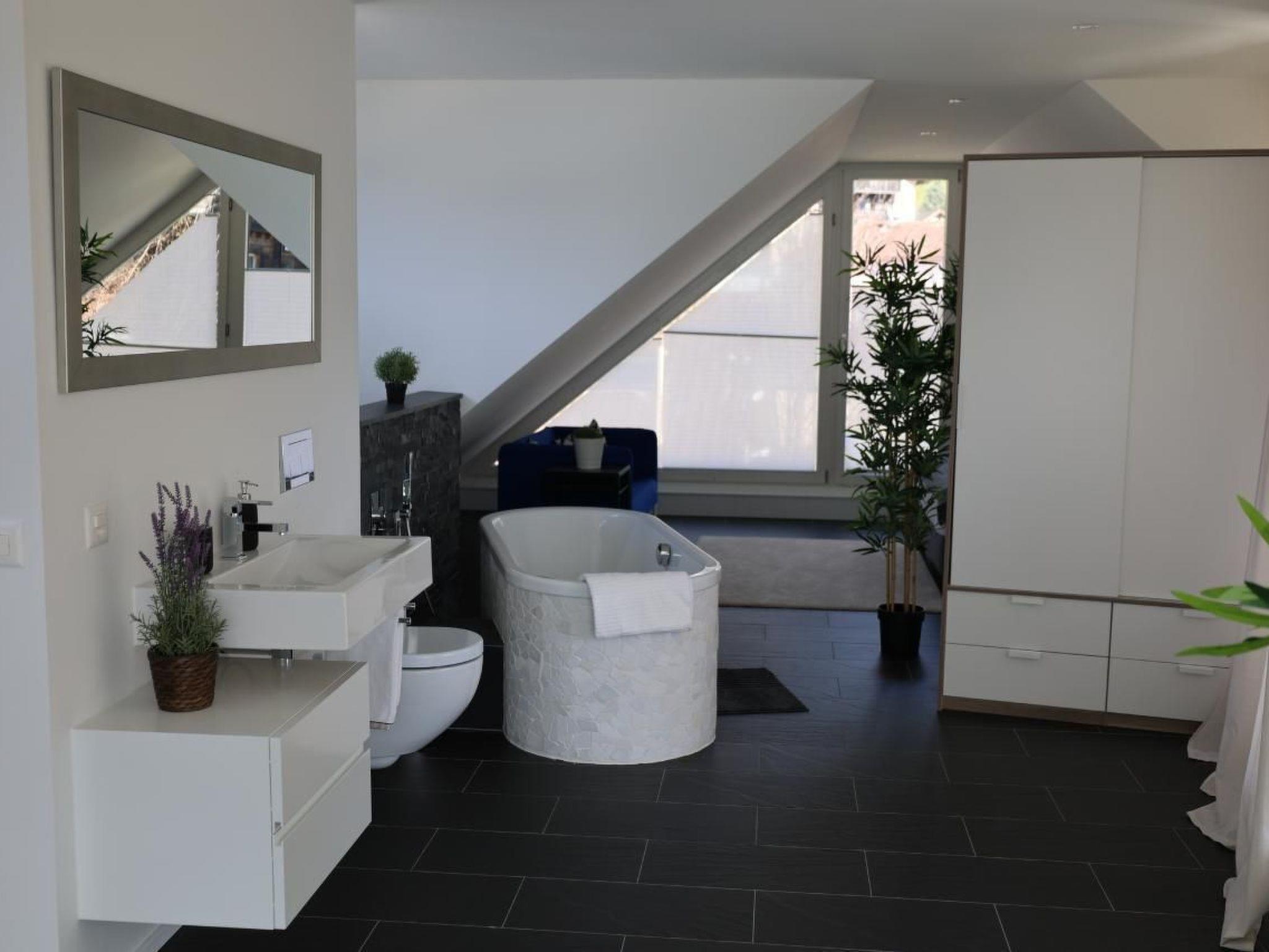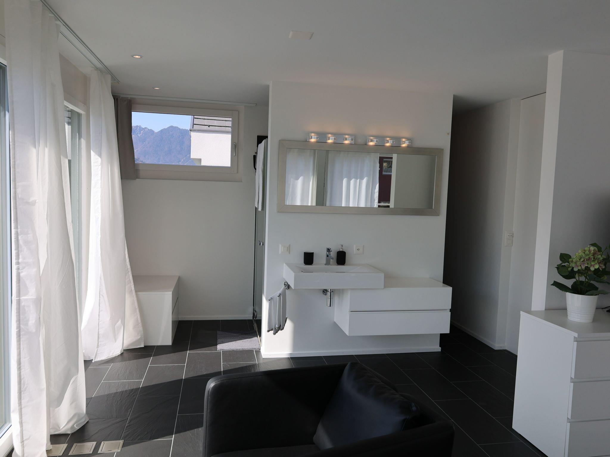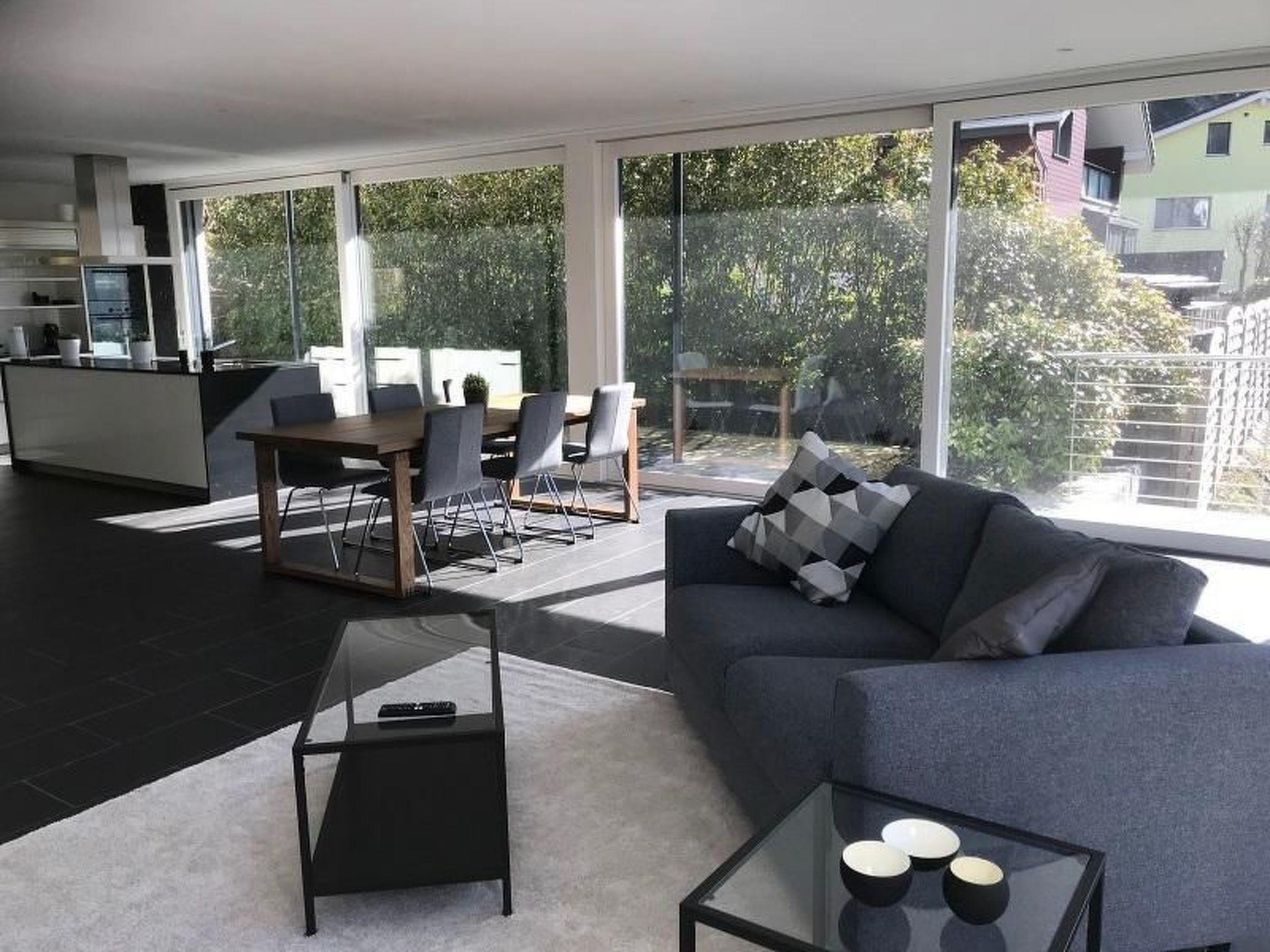 grosszügiger Wohnraum mit Sonnenterrasse und Blick auf See und Berge