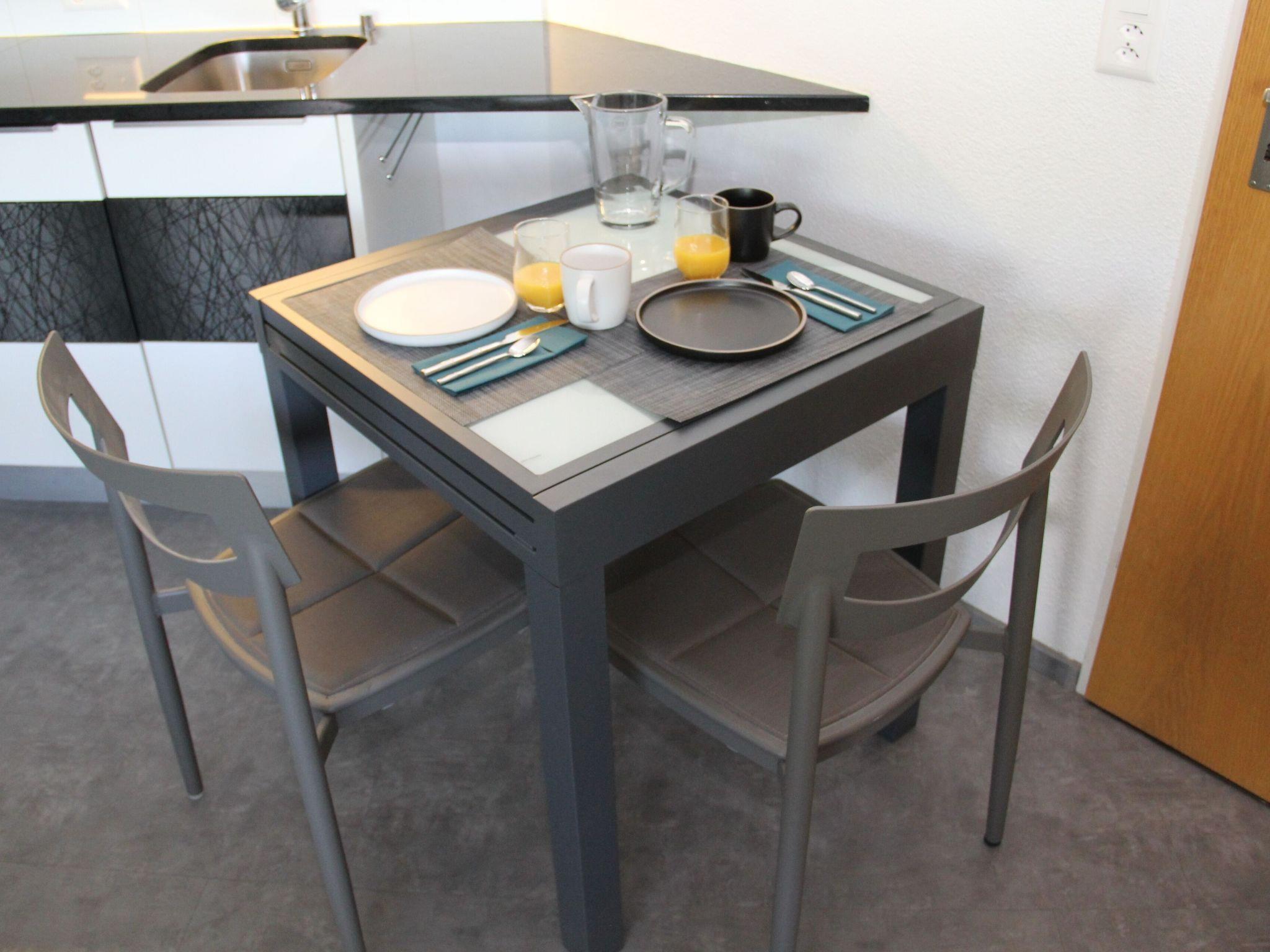Offene Küche mit Geschirrspüler, Kühlschrank, Glaskeramikherd, Backofen, Mikrowelle und Kaffeemaschine