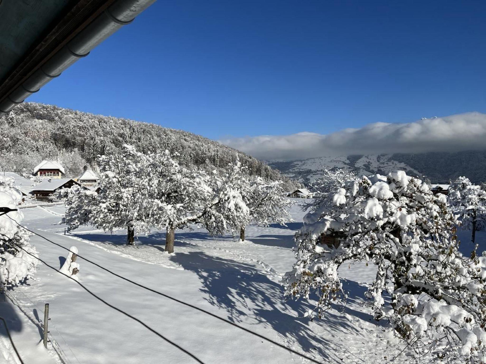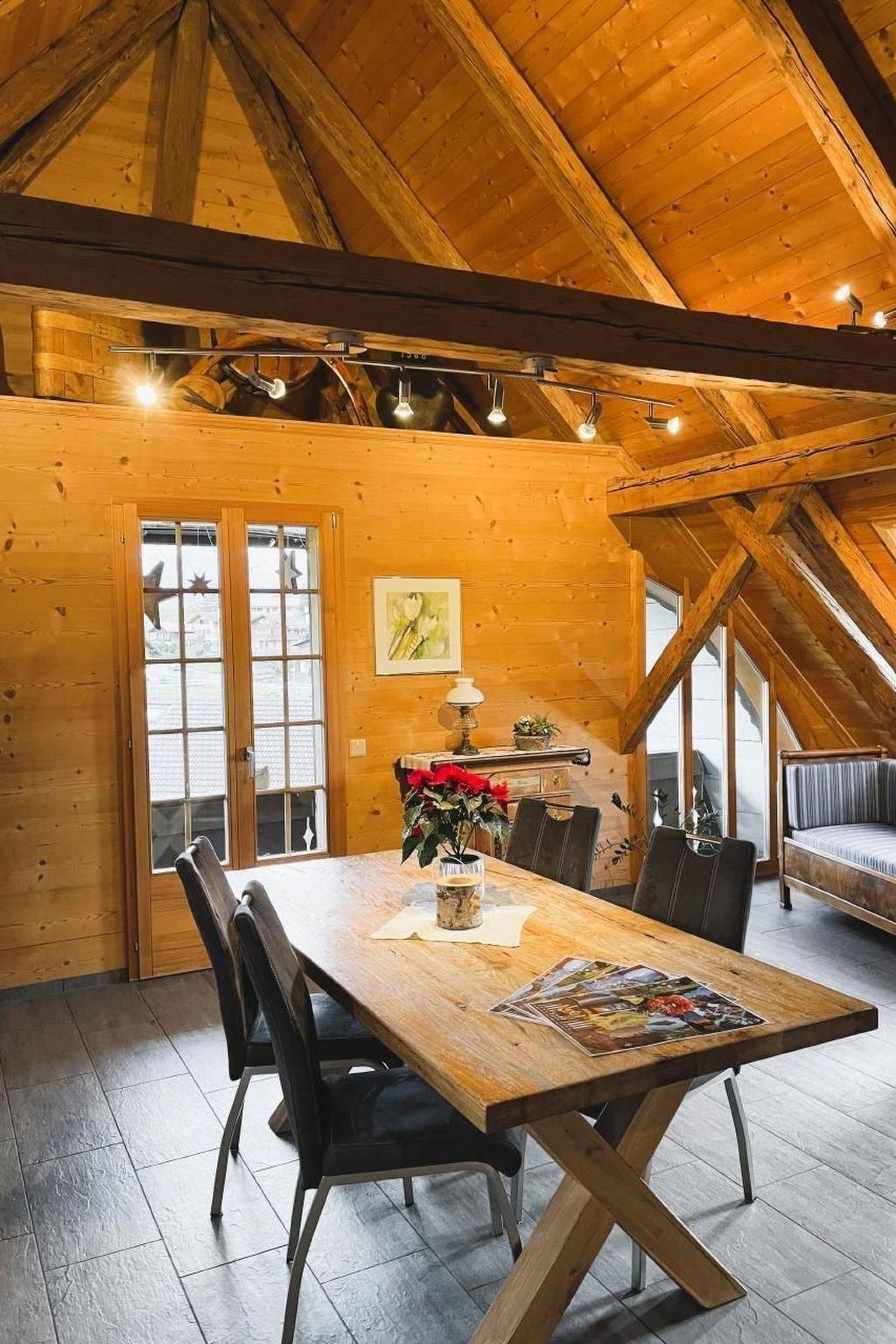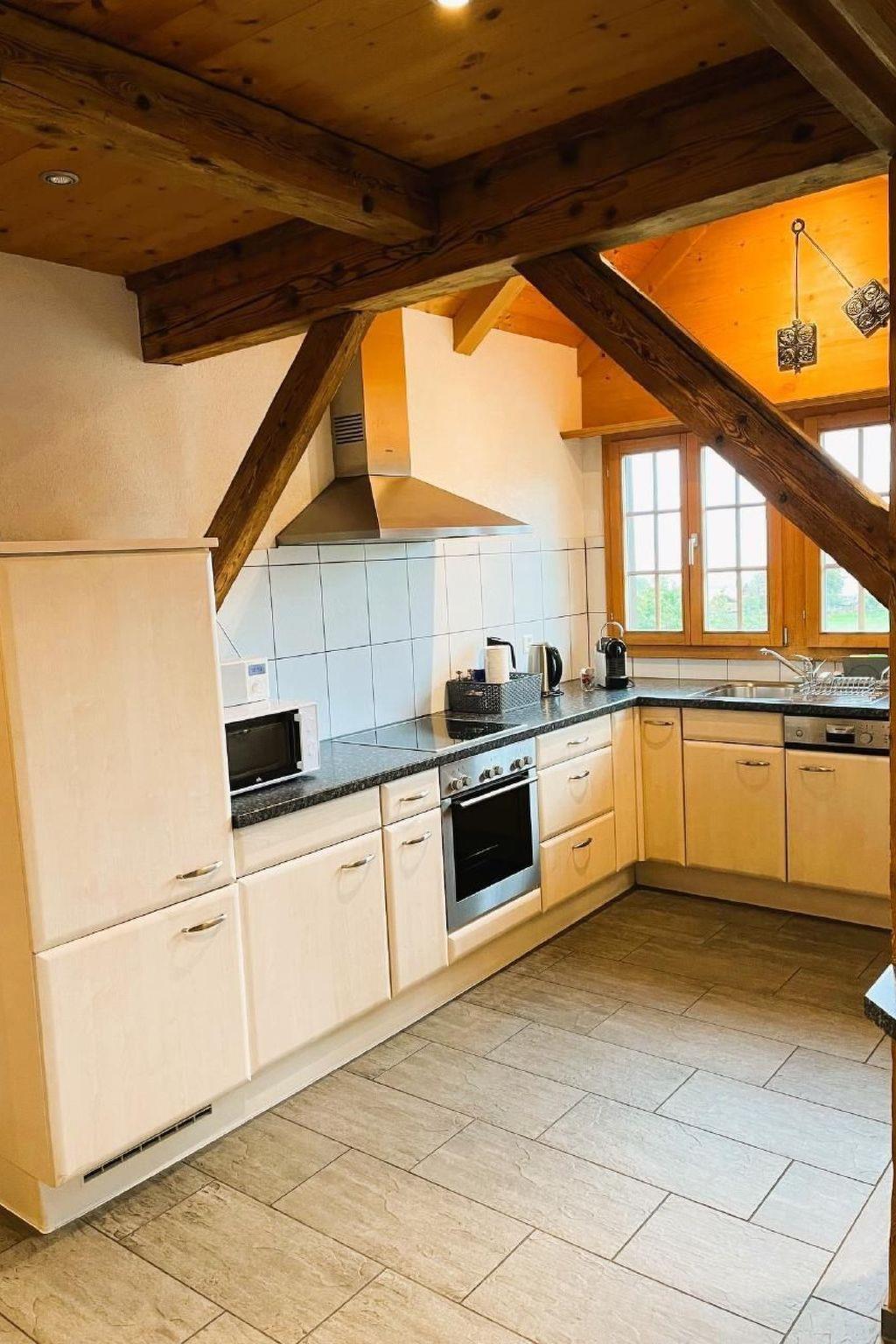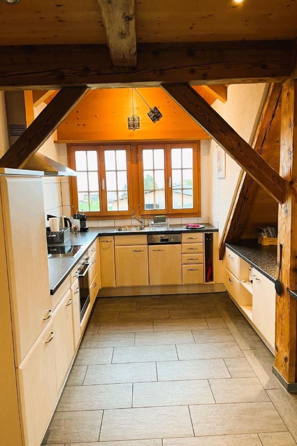In unserem fast 250 jährigen sorgfältig renovierten Holzhaus. Vermieten wir eine rustikale und äusserst komfortable 3-Zimmer-Dachstockwohnung mit Galerie. Grosszügige und komplett eingerichtete Küche mit Geschirrspülmaschine, NESPRESSO Kaffeemaschine, Mikrowelle, Raclette Ofen, Fondue Caquelon, Toaster, Wasserkocher und Waschmaschine. Äusserst komfortabler Ess- und Wohnraum mit zwei Sofas, grossem Esstisch mit Platz für bis zu 6 Personen, Flachbildschirm / Kabel Fernseher und Digital Radio. 1 Doppelschlafzimmer, Galerie mit 2 Betten, Badezimmer mit Badewanne / Dusche mit Glasduschwand und Toilette. Eine wunderschöne Rundsicht auf die Berge und den Thunersee haben sie von den beiden Balkone und aus den Fenstern. Ein richtiges Bijou zum Geniessen in ruhiger und ländlicher Gegend.