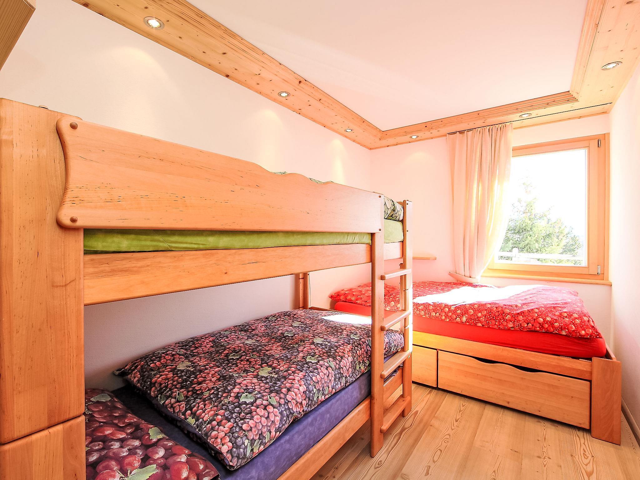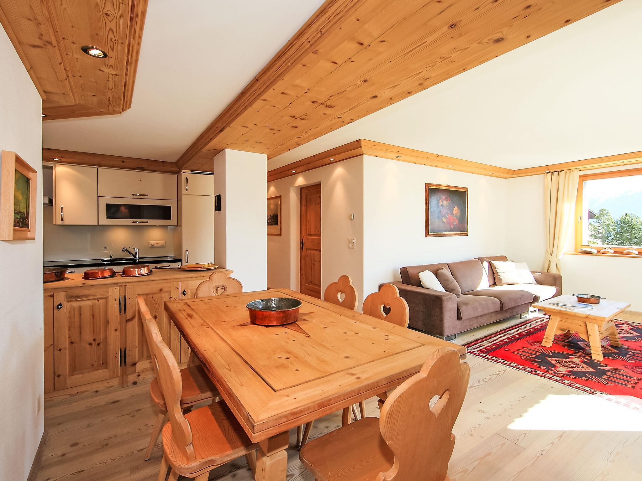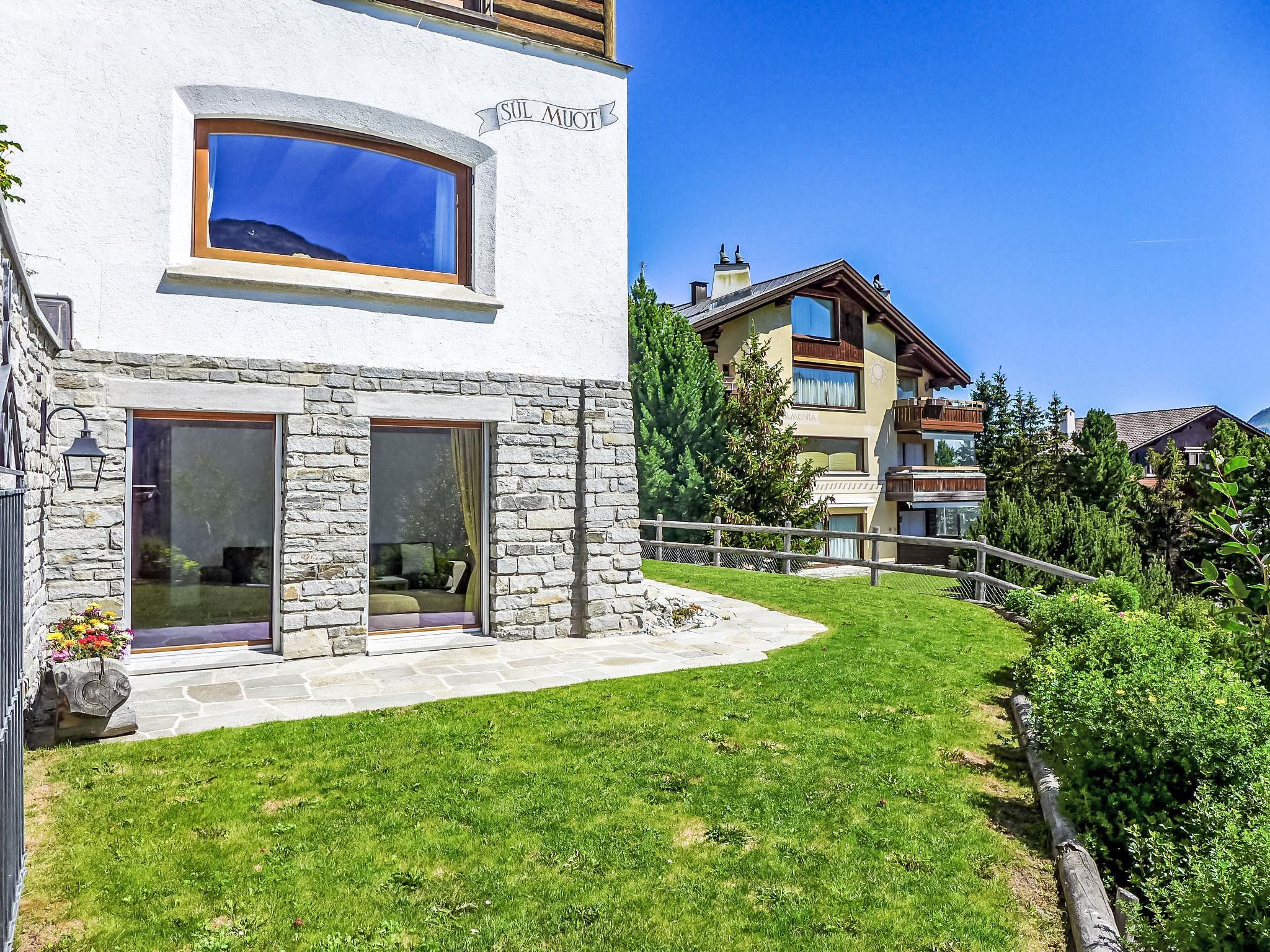 "Chesa Sül Muot", 4-Zimmer-Wohnung 100 m2, im Erdgeschoss, Südlage. Sehr luxuriös und gemütlich eingerichtet: Wohn-/Esszimmer mit Kabel-TV (Flachbildschirm), Radio und DVD. Ausgang zum Garten, zur Terrasse, Richtung Süden. 2 Doppelzimmer, jedes Zimmer mit 1 franz. Bett (1 x 160 cm, Länge 190 cm). 1 Kinderzimmer mit 1 Bett (90 cm, Länge 195 cm), 1 x 2 Etagenbetten (90 cm, Länge 195 cm). Offene Küche (Backofen, Geschirrspüler, 4 Glaskeramikplatten, Toaster, Wasserkocher, elektrische Kaffeemaschine, Kapseln für die Kaffeemaschine (Nespresso) extra, Racletteofen, Fondue Set (Chinoise, Käse)). Bad/WC, Dusche/WC, Hydromassage-Dusche. Bodenheizung. Holzdielenboden. Gartensitzplatz, Südlage. Liegestühle (4). Schöne Sicht auf den See, die Berge, das Tal und die Ortschaft. Zur Verfügung: Bügeleisen, Haartrockner. Internet (Wireless LAN, gratis). Garage (1 Auto), Höhe 190 cm, Breite 220 cm. Bitte beachten: geeignet für Familien. Nichtraucher-Unterkunft, Nichtraucher-Haus. Eigener Eingang.