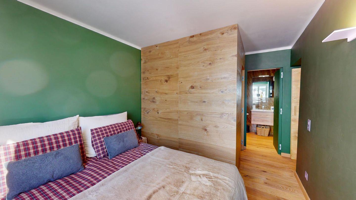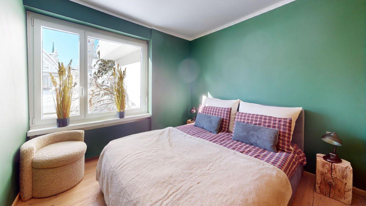Neu renovierte 4.5 Zimmer Ferienwohnung im 1. Stock. Stylisch eingerichteter Wohn-/Essbereich. Offene Küche zum Wohnraum. 1 Schlafzimmer mit Doppelbett, eigenem Bad (Dusche/ WC/Bidet) und begehbarem Schrank, 1 Schlafzimmer mit kleinem Doppelbett und TV, 1 Schlafzimmer mit Doppelbett, weiteres Badezimmer (Dusche/WC). Lift und Garagenplatz.